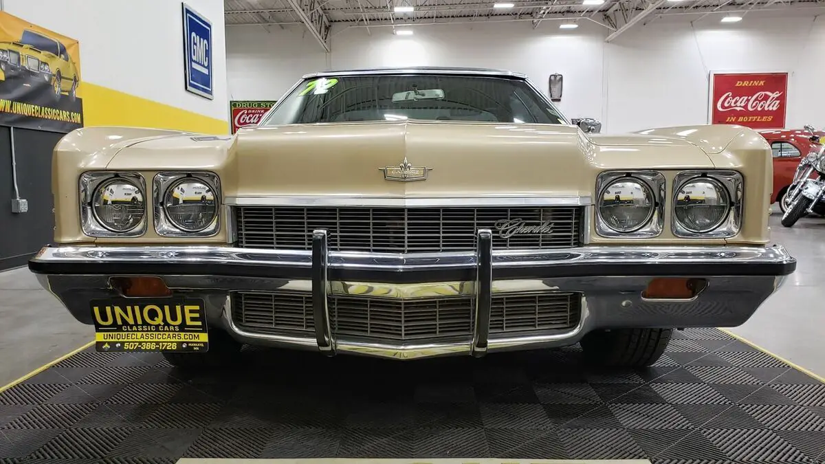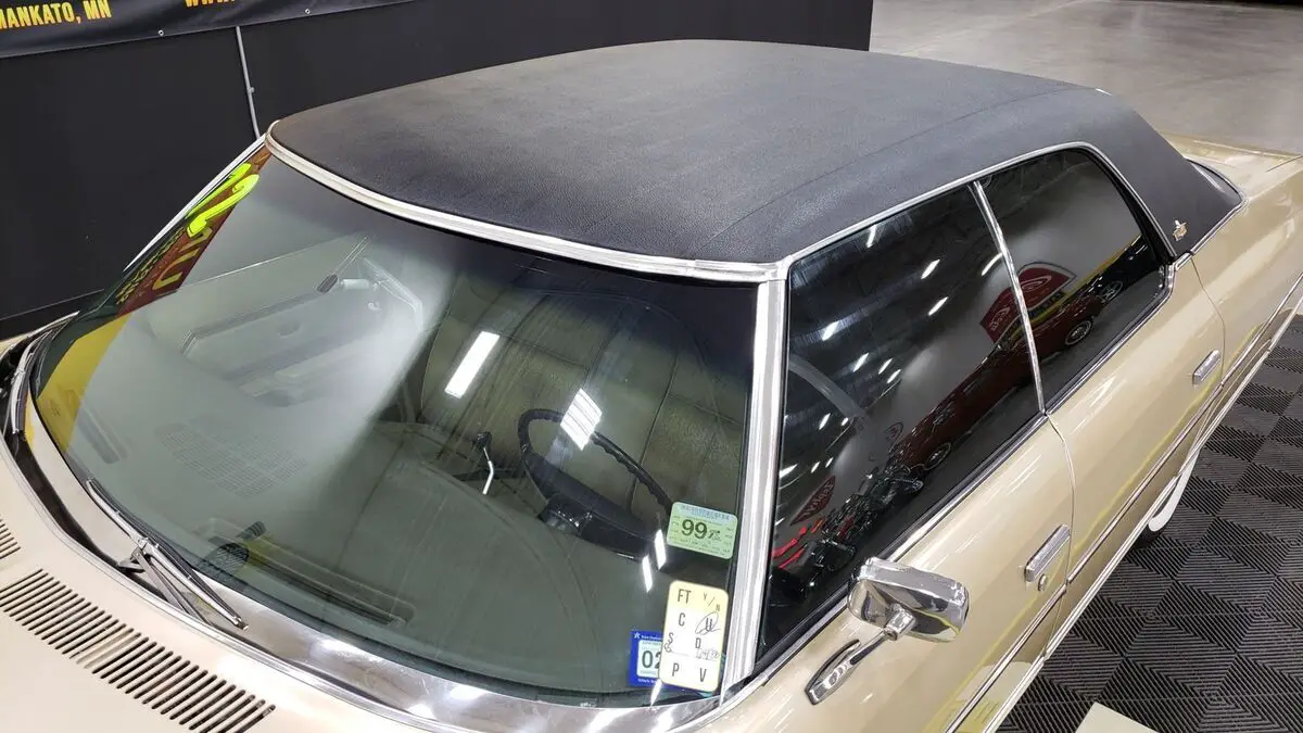 1972 Chevrolet Caprice finished in Sandalwood (50 paint code) with black vinyl roof. This 4dr hardtop has tinted windows; check with local and state laws regarding legal percentage in your area. 402ci Big Block V8 with a TH350 auto transmission. Dual exhaust! Riding on white wall radials with Chevrolet wheel covers. Power steering, tilt column, power locks, power seat, power brakes, and a/c. A/C has been converted to R134a along the line. Paint shows its age in some areas with a decent shine overall. This one came to us from Texas. Tires are dated 2022. New battery, transmission pan gasket, oil pan gasket, rear main seal, and rear brakes also recently added. Fuel gauge is inop as noted by our technicians. Tan cloth/vinyl bench seat is showing wear on the fabric as it appears to be original yet. Aftermarket JVC stereo has been added along the line.