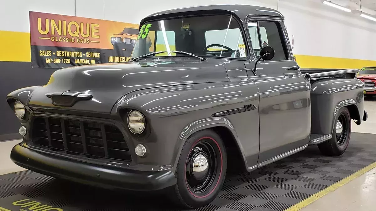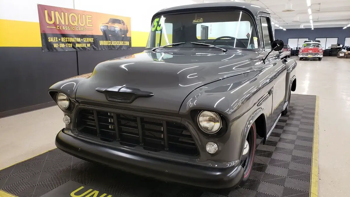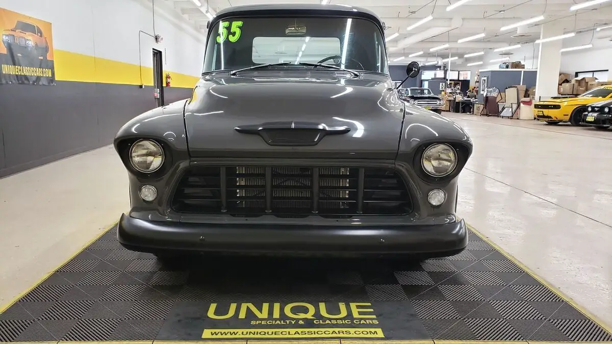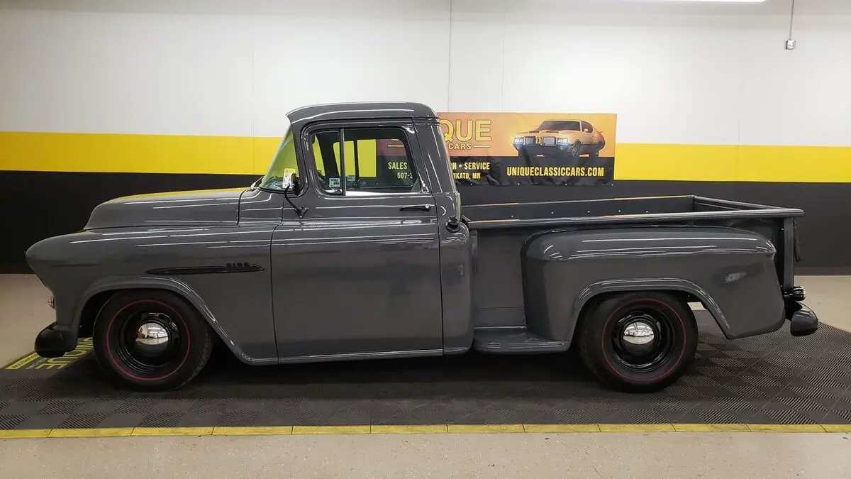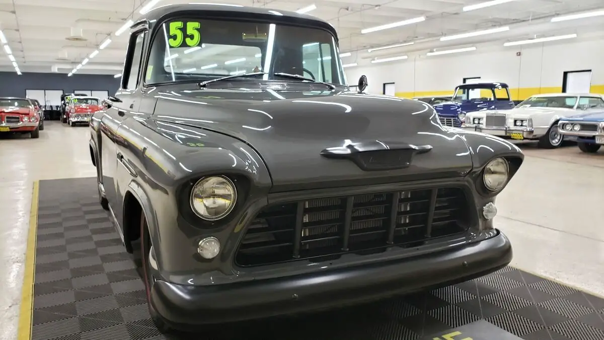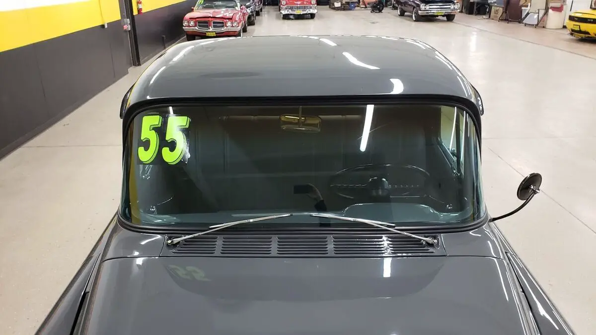 1955 Chevrolet 3100 Street Rod finished in Dark Gray paint. This one has a 350 V8 with a TH350 auto transmission. Equipped with power steering, 4bbl quadrajet carb, MSD ignition, Edelbrock intake, aluminum radiator, 70's front end, and front disc brakes. Brightwork has been painted black on this example. Riding on redline tires with black steel wheels. This was recently restored 3 years ago as of this writing. Paint shows well overall on this build also. Dark Gray vinyl bench seat interior with aftermarket gauges added below the dash. Gray wood bed with black inlays. Our techs noted brakes are 90% or better, new rear axle seals. Interior has been painted to match with a coating on the floor but no carpeting or sound deadening. Aftermarket stereo custom installed in the dash works as well.