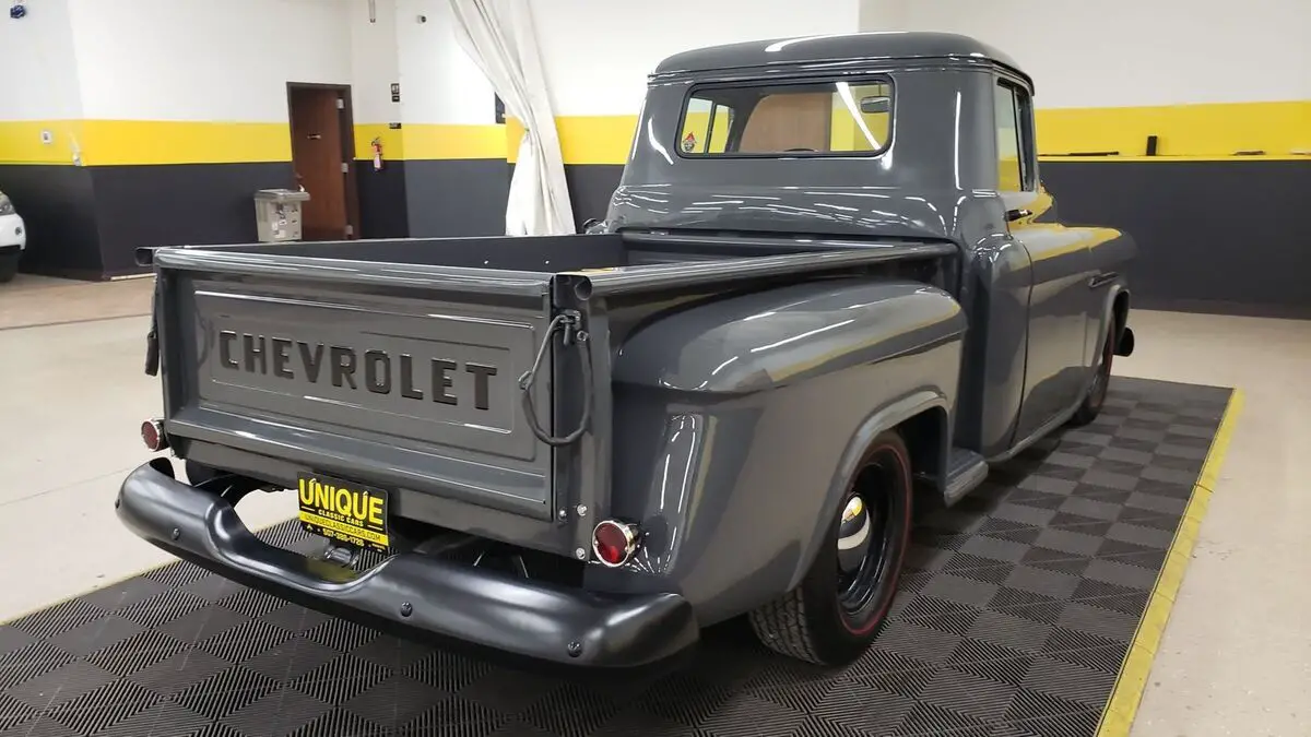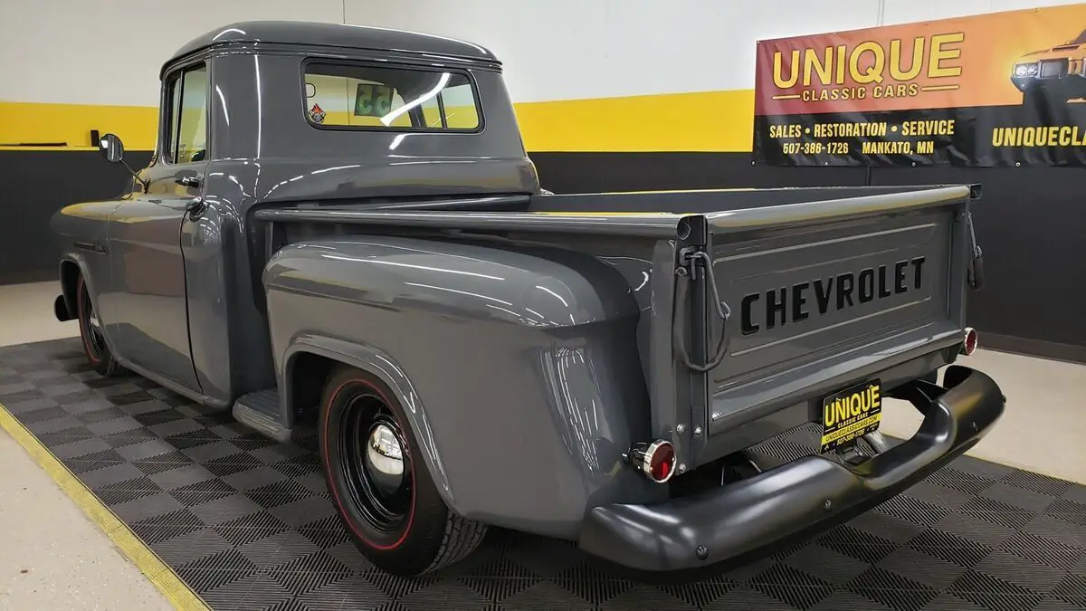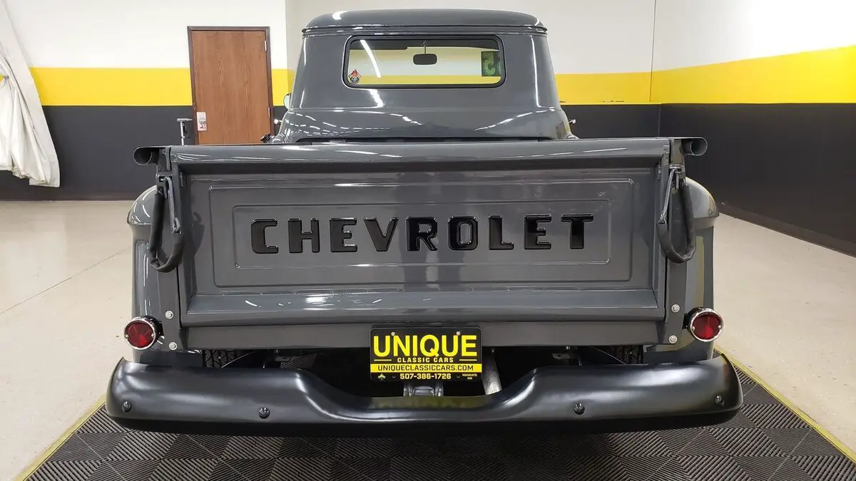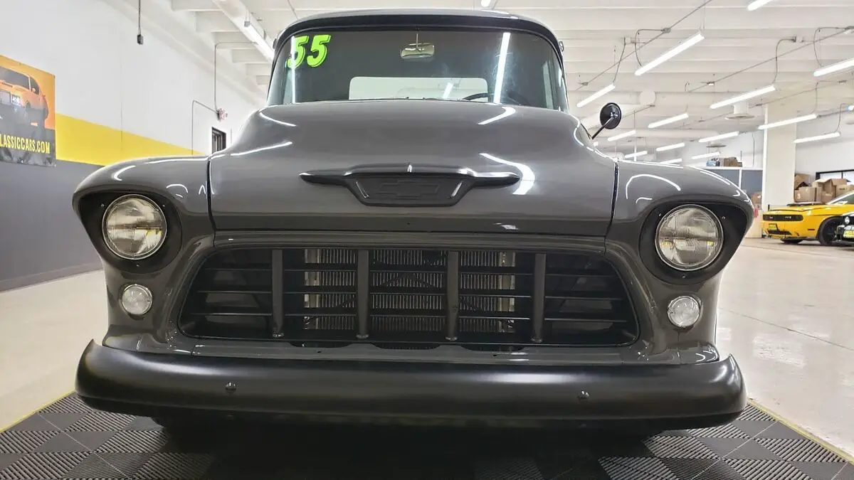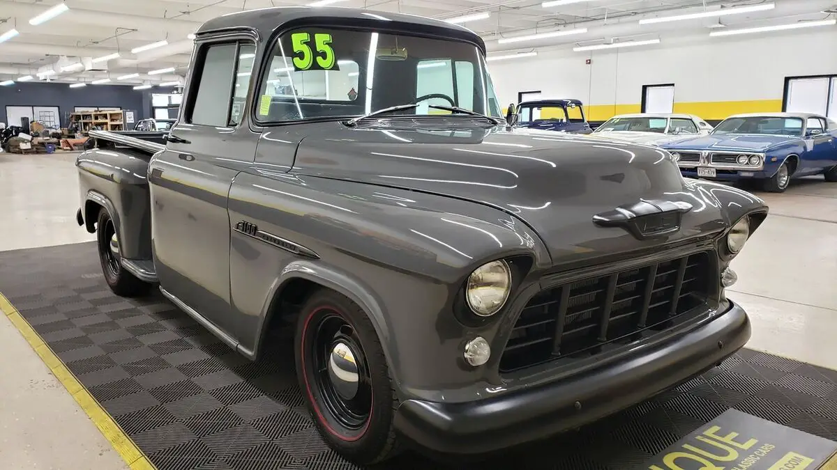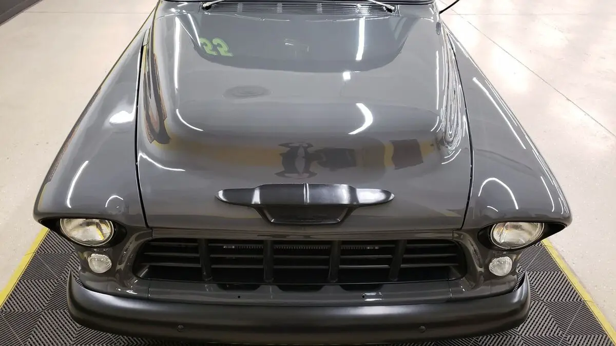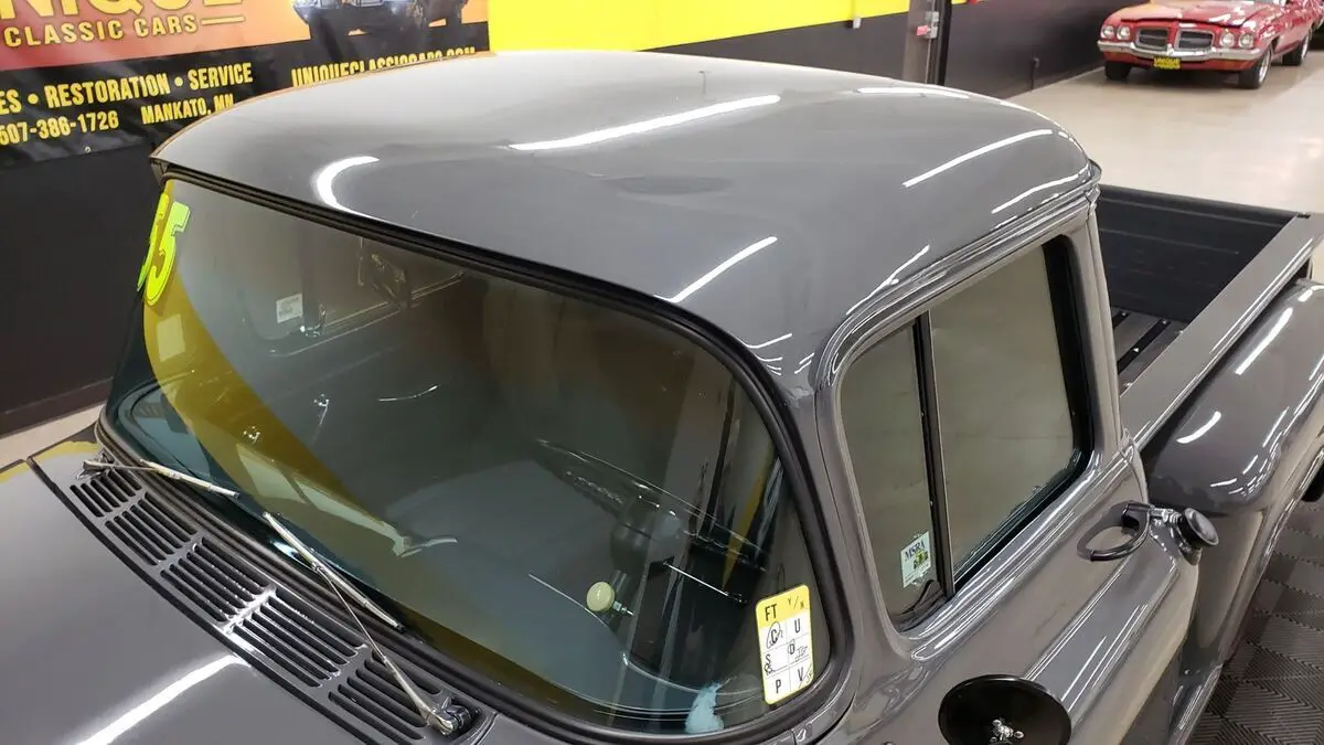 1955 Chevrolet 3100 Street Rod finished in Dark Gray paint. This one has a 350 V8 with a TH350 auto transmission. Equipped with power steering, 4bbl quadrajet carb, MSD ignition, Edelbrock intake, aluminum radiator, 70's front end, and front disc brakes. Brightwork has been painted black on this example. Riding on redline tires with black steel wheels. This was recently restored 3 years ago as of this writing. Paint shows well overall on this build also. Dark Gray vinyl bench seat interior with aftermarket gauges added below the dash. Gray wood bed with black inlays. Our techs noted brakes are 90% or better, new rear axle seals. Interior has been painted to match with a coating on the floor but no carpeting or sound deadening. Aftermarket stereo custom installed in the dash works as well.
