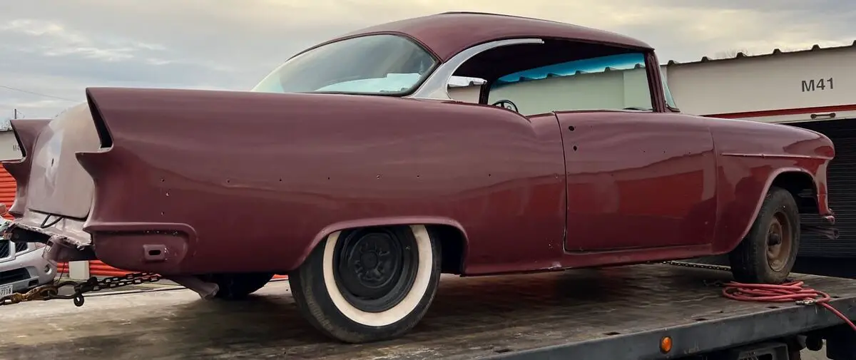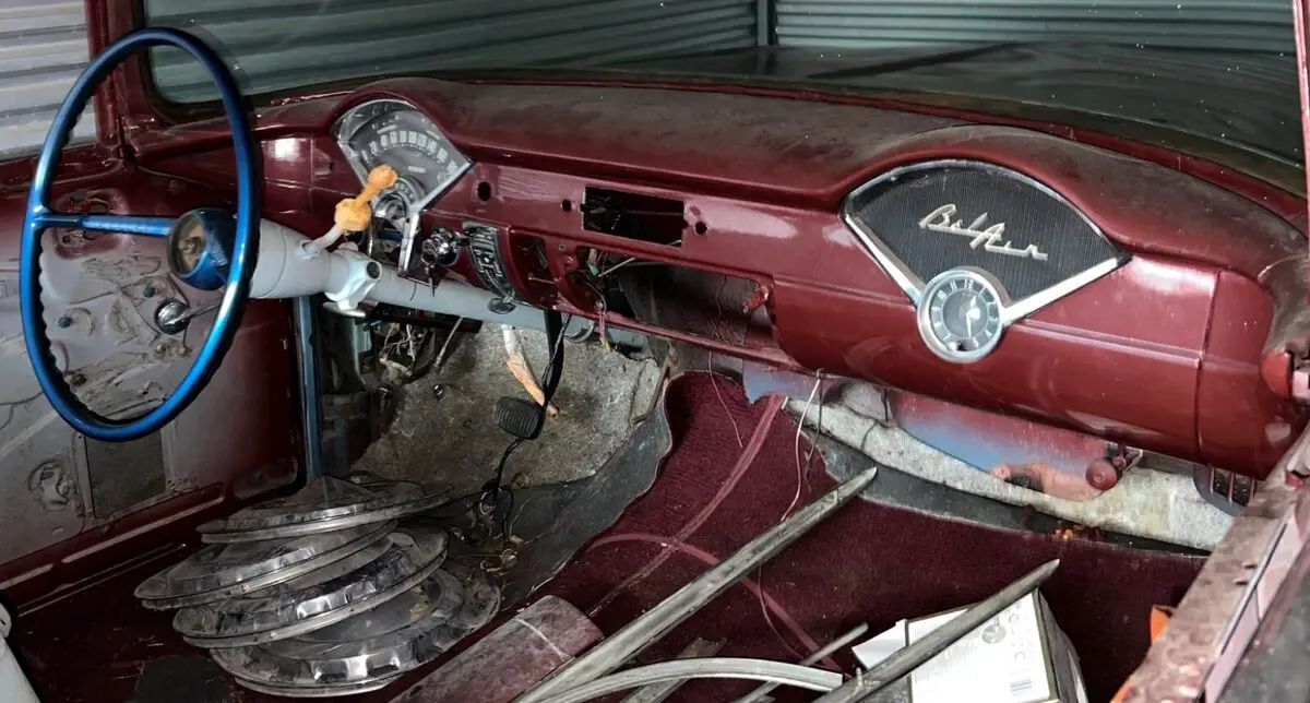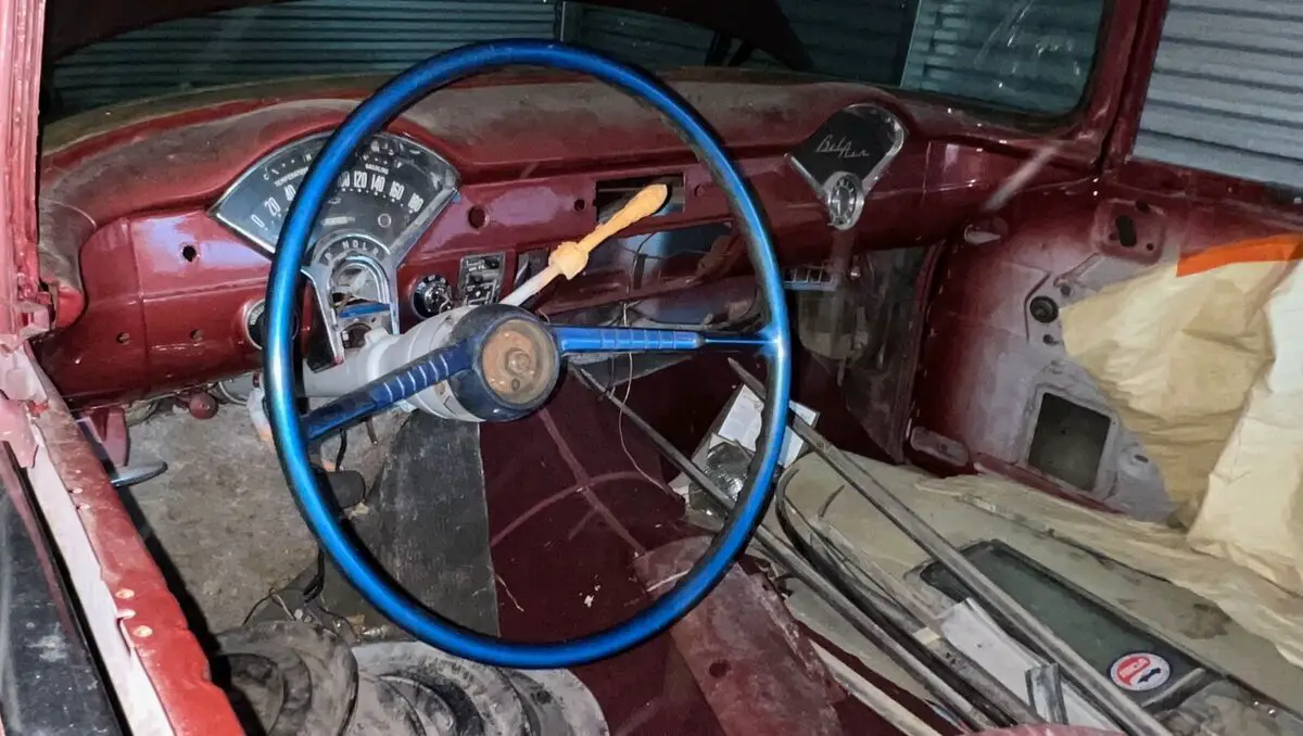 Available for sale is an unusual 1955 Chevrolet Bel Air example. According to a consensus of research, this was one of five similar cars exported to Germany. It was built on GMs export line equipped with a locking steering column, KPH speedometer, a map pocket on the driver door panel, a cowl tag in German, and a 265 cid engine with Power Glide automatic transmission. It was painted in the Dusk Rose / India Ivory color scheme with a grey and white interior. All in all a very uncommon 1955 Chevy. There is a soft retractable sky roof that was either factory ordered or dealer installed.
