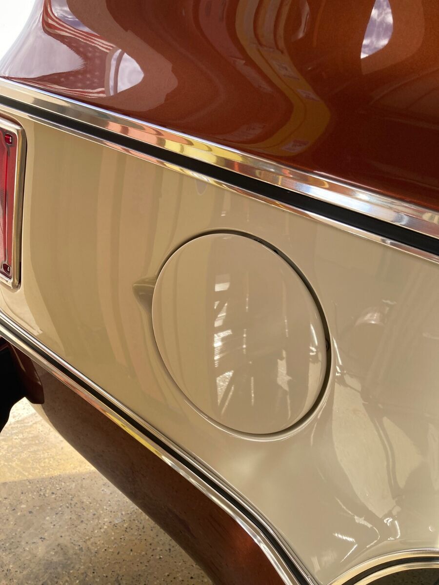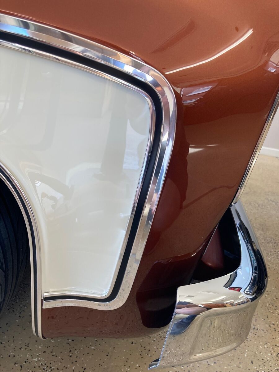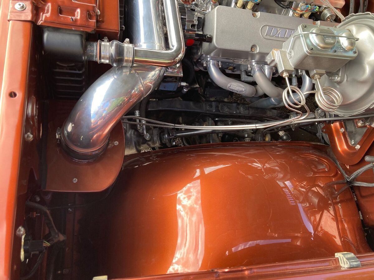 Squeege’s Kustoms epoxy primer. PPG brand: sealer, custom mixed base, and clear. Door jambs were painted 2 tone and meticulous care taken to make them as nice as the exterior body panels. Spot welds and excess metal from the factory were all removed, deburred, or filled to give every aspect of the painted surface a smooth clean finish. Further, the doors, fenders, quarters and tailgate were sanded as “one piece” so as to make them seem like they are all 1 surface and blend together with no visible transition from panel to panel.