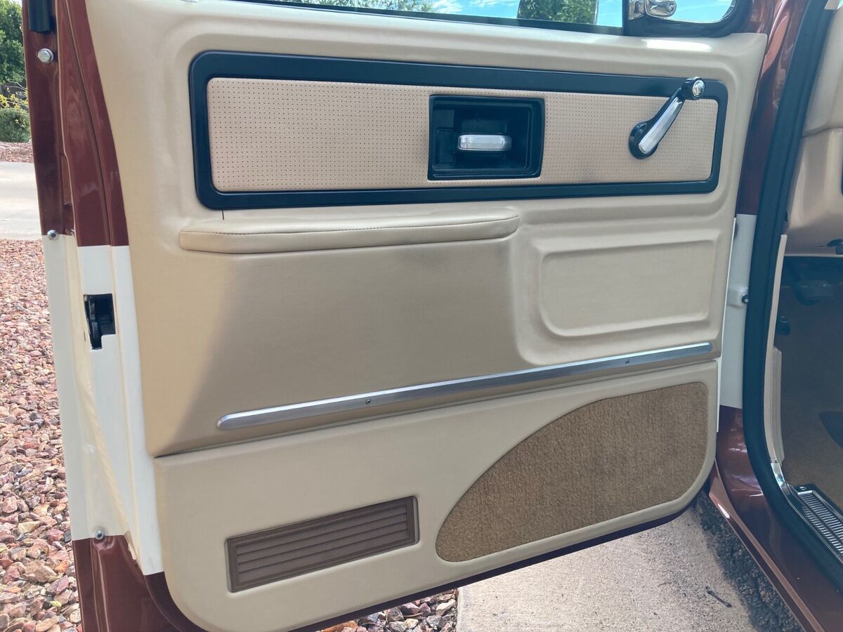 The interior was done by Stichin’ by Steve and won the best interior award at the Brothers Chevy Truck show when the Blazer was completed in 2016. Tan leather combined with custom vinyl and suede make this interior unique. Rear vertical panels, seat backs, and a few other interior pieces were custom fabricated out of wood, and then covered, to make it that much more unique, while still keeping the original look.