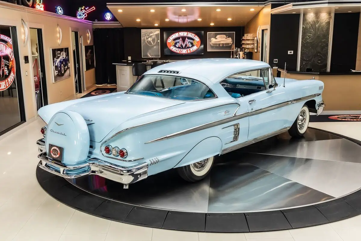 Check out this beautiful 1958 Chevrolet Impala! This light blue Impala is fully loaded & has undergone a complete, frame-off restoration with no expense spared! Along with the blue exterior this Impala has fender skirts, continental kit, dual exhaust, & spinner hubcaps along with white-wall tires! Under the hood sits a 348ci V8 with tri-power carburetors! Power is sent to the rear wheels through a two-speed transmission and stock rear end. This Impala also features power steering, & aftermarket AC. This example of a comprehensively restored first-year Impala is a beautiful example of s a timeless classic.