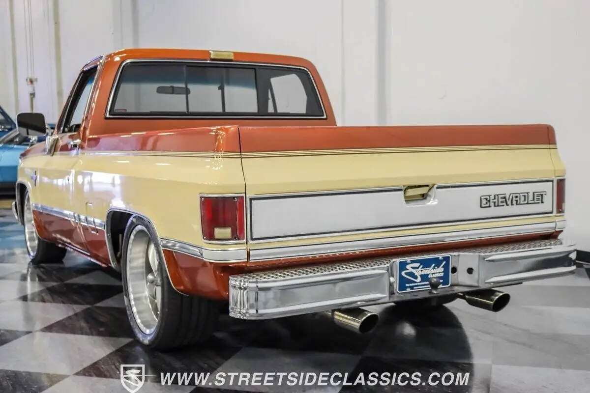 This 1983 Chevrolet C10 Silverado boasts a $12,000 mechanical refresh, making it a prime example of American muscle in pickup form. The light bronze exterior exudes confidence on the street. Its aggressive profile comes from a lowered stance and 20" Ridler wheels. The front sports 245/40R20 tires, while the rear showcases massive 315/35ZR20 rubber, both with ample tread. A Rhino-lined bed adds utility, and the dual exhausts amplify its muscular presence. The sliding rear window and tinted glass complete the truck's bold look.