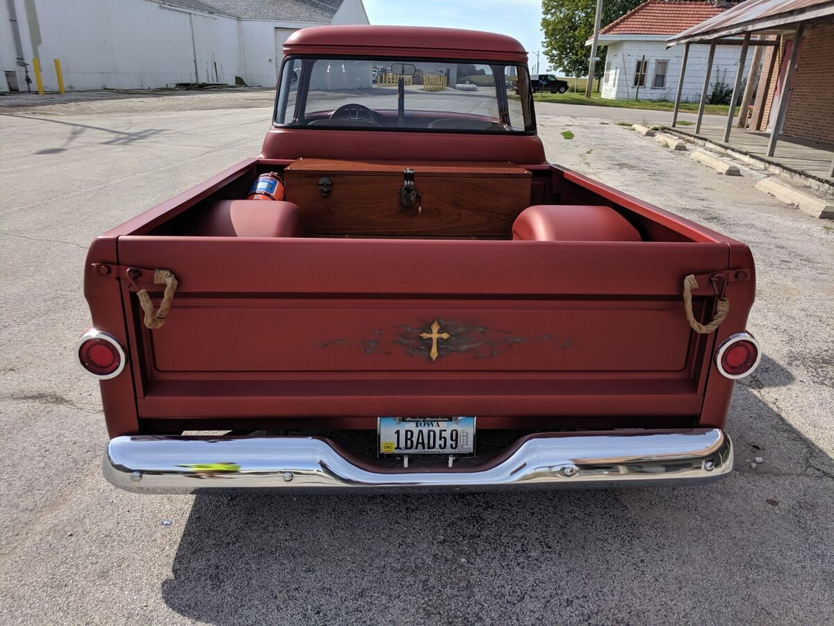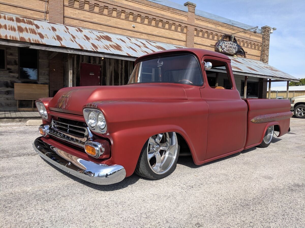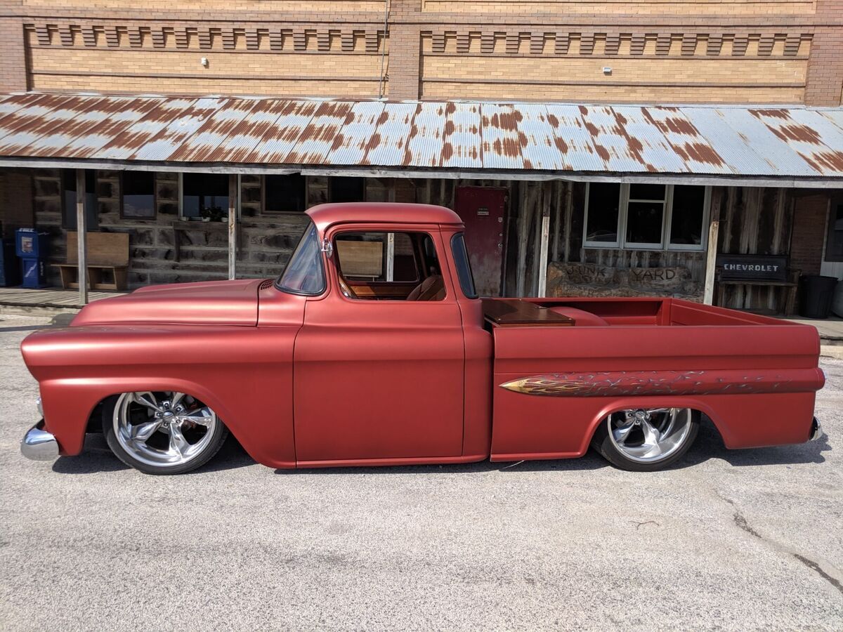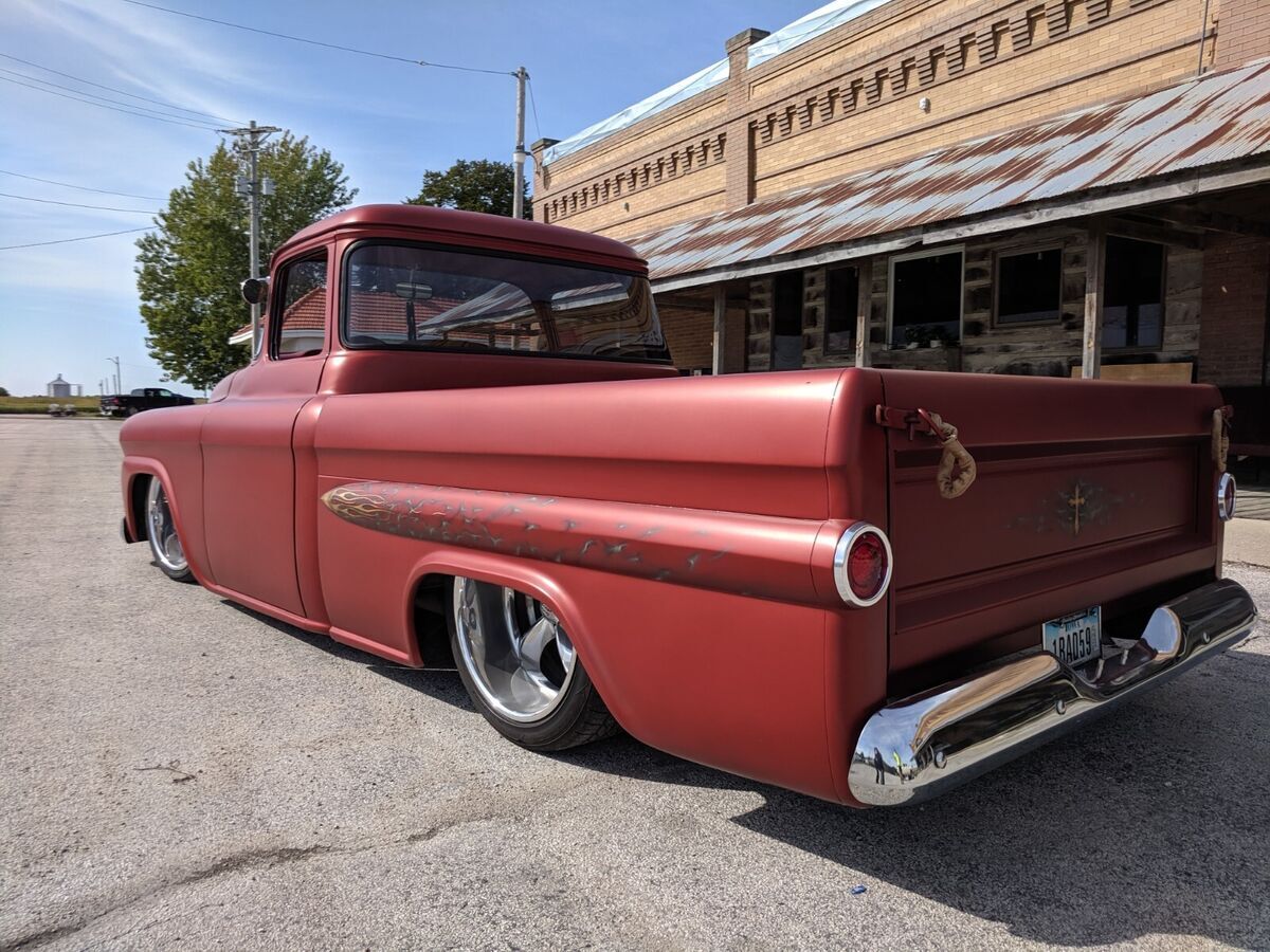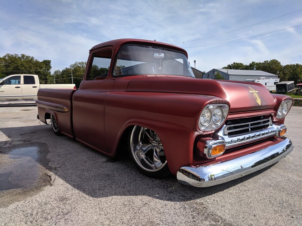 This 1959 Chevy Apache was stripped down to bare metal and completely restored professionally! Custom paint, custom 1 off interior, this thing is completely custom all the way around!*383 Cubic Inch Stroker Engine with Nitrous included!*700R Transmission*Custom Satin Paint with Gold Leaf*Custom Flame Airbrushing on Fenders, Under Hood, Dash, Exterior Sides*12-gauge Double barrel shotgun shifter*Buffalo/Alligator Interior Upholstery and Headliner*Solid Walnut Bed & Box housing Air Ride & Battery*Anodized Copper Door Panels*Vintage Air*20" American Racing Polished Aluminum Wheels*Remote entry with Electric Poppers and Key FOBS*Shaved Door Handles*Power Windows & Locks*Big Back Wrap-Around WindowTruck is in Florida at a car show as of March 27th and the owner will be hauling it back to his home In Iowa very soon so shipping is available in between Iowa and Florida very soon! (heading to Iowa Monday March 31)