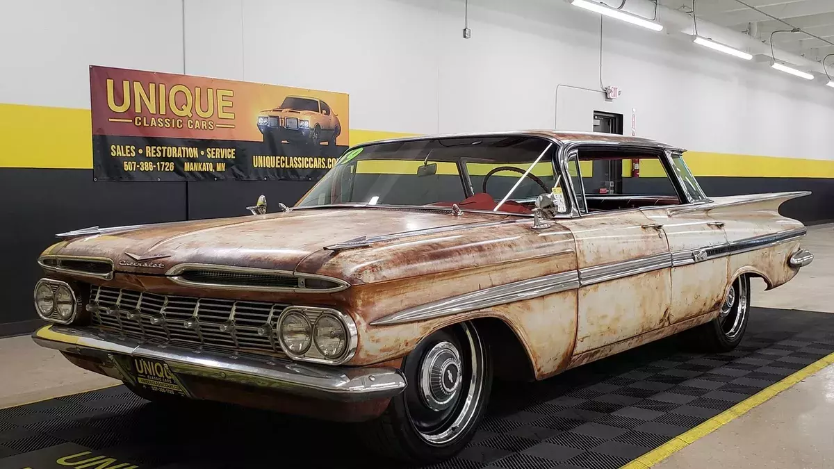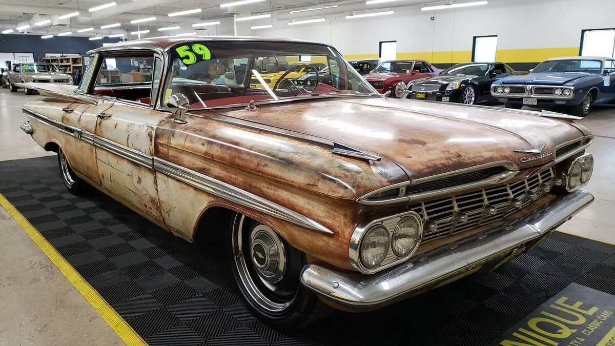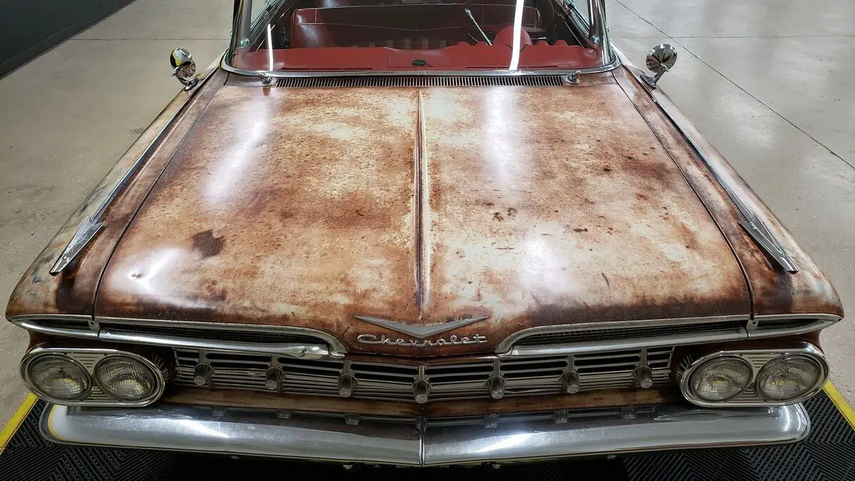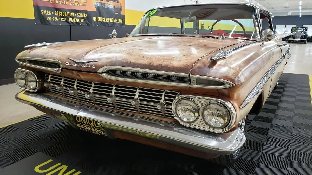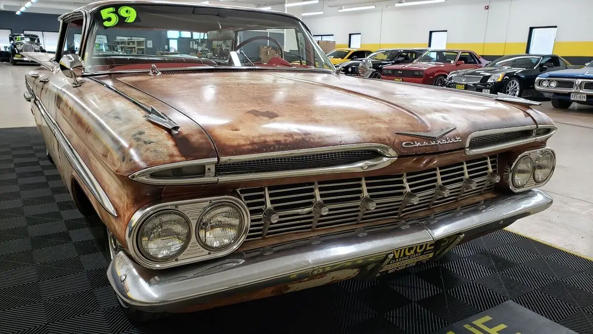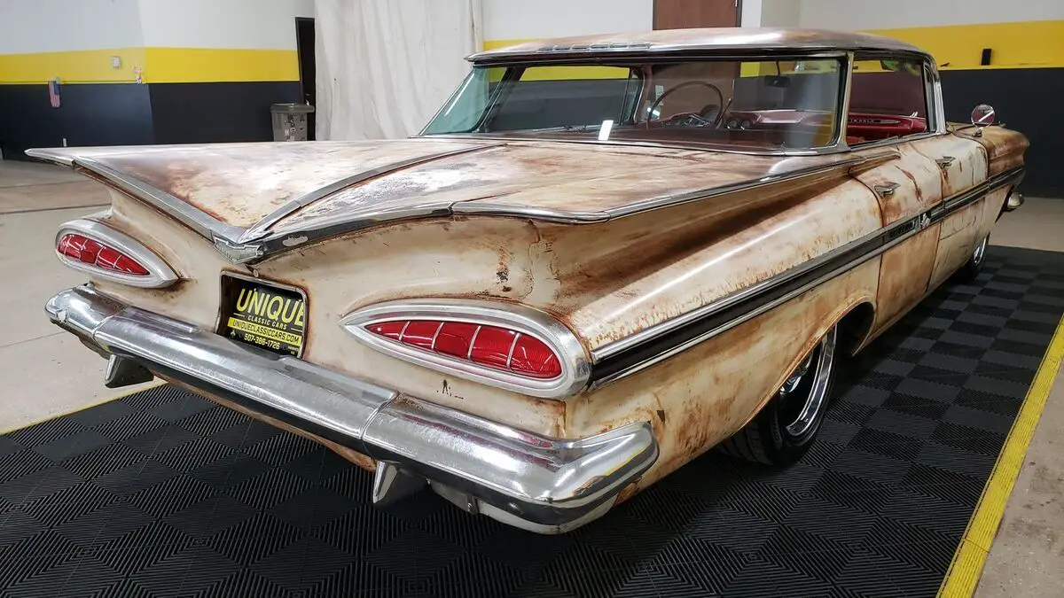 1959 Chevrolet Impala in White patina. This 4dr Flat top is powered by an LS V8 engine that is paired up with a 4L60E auto w/OD transmission. Original Ermine White car that, after it had weathered some, has been cleared over with a satin finish. Riding on black 20" wheels with beauty rings and Chevrolet center caps with 2023-dated tires. Reupholstered (and recarpeted) interior with red vinyl/cloth combination bench seat and column shift. Our techs noted the brakes are like new, front and rear shocks replaced, right outer tie rod end is new, steering gear and pitman arm also replaced. Aftermarket Dolphin gauges installed in the dash. Odometer is not working on new gauges.