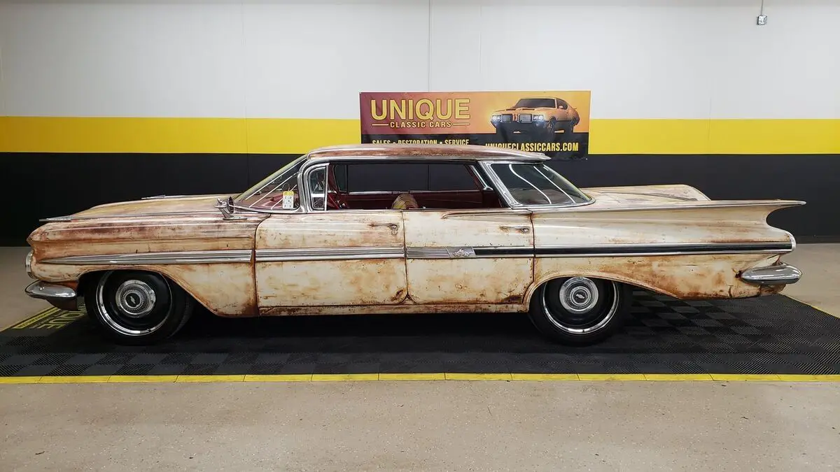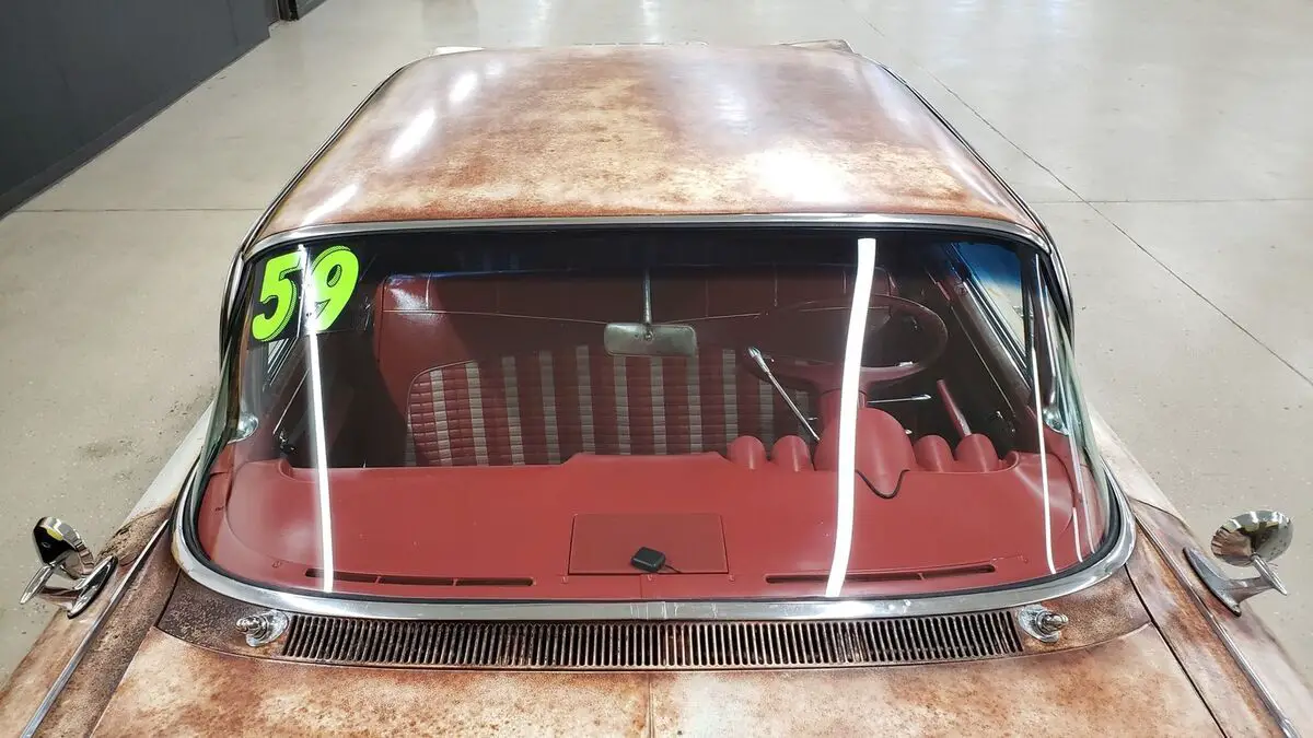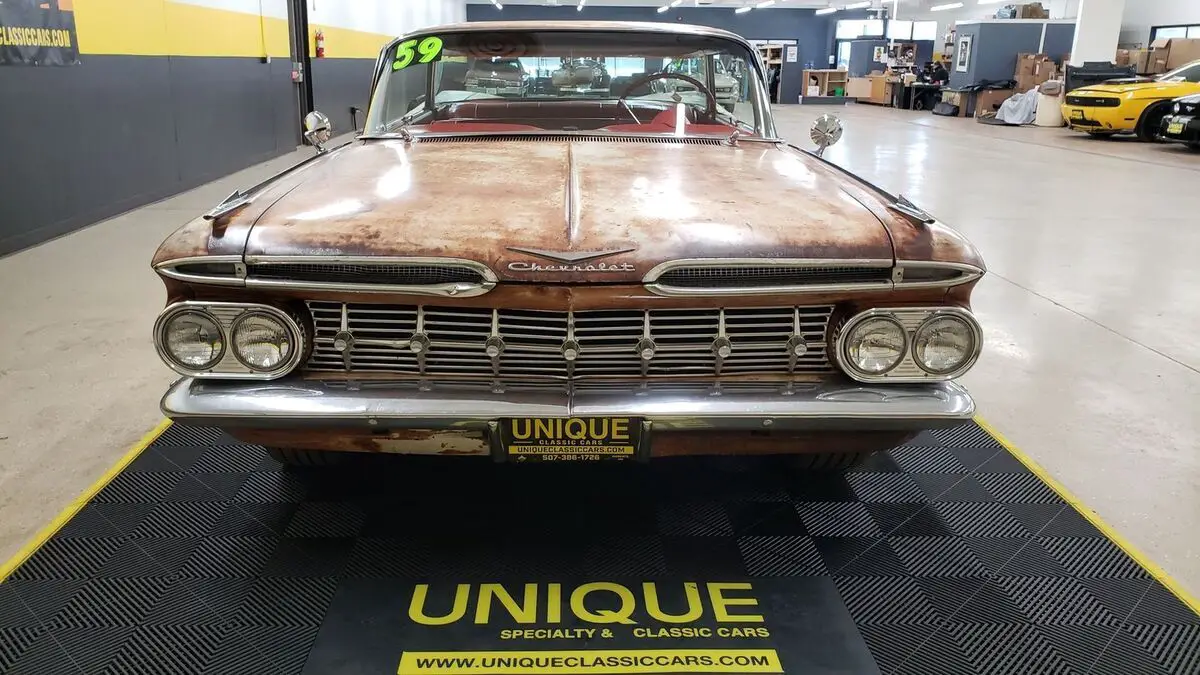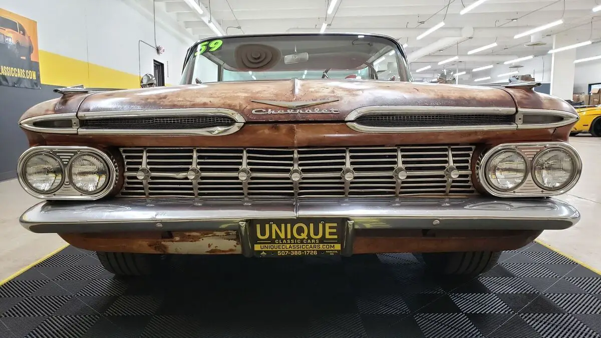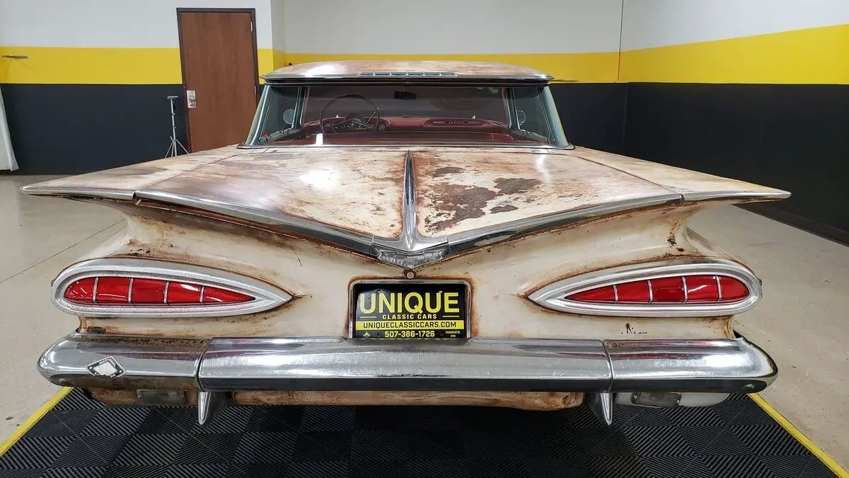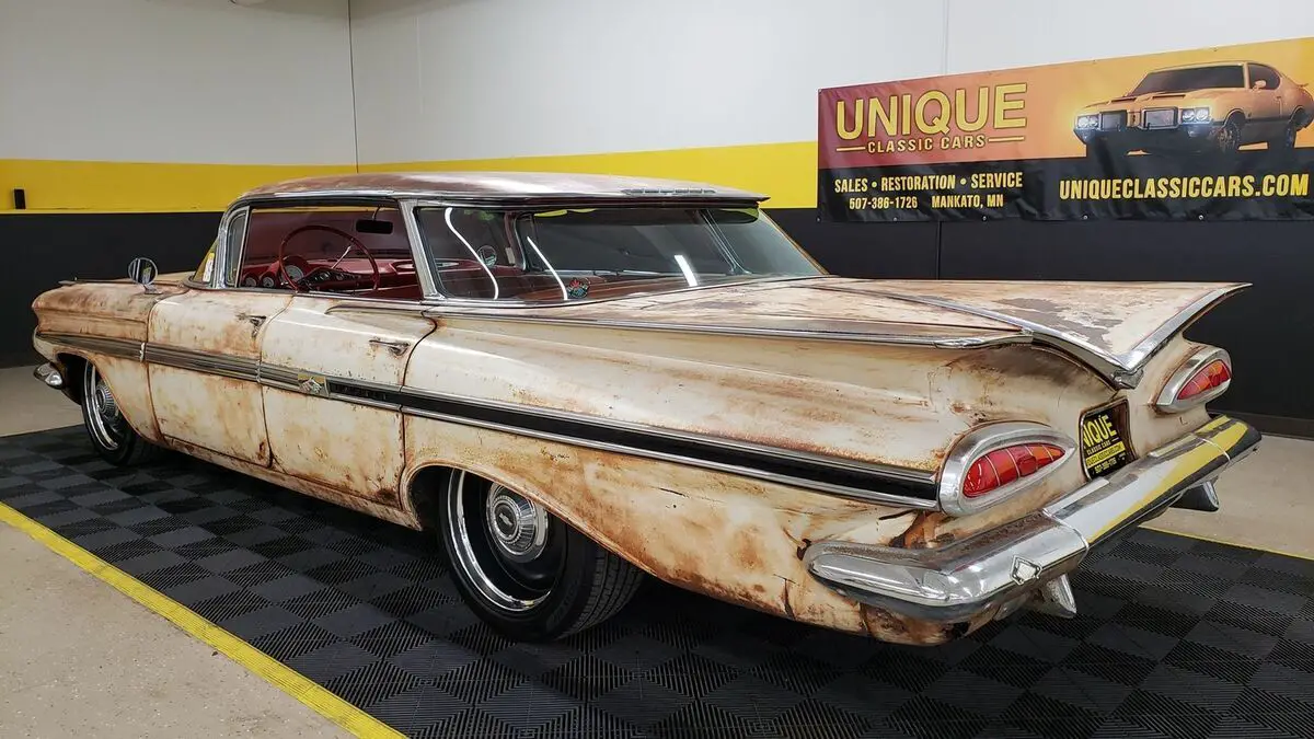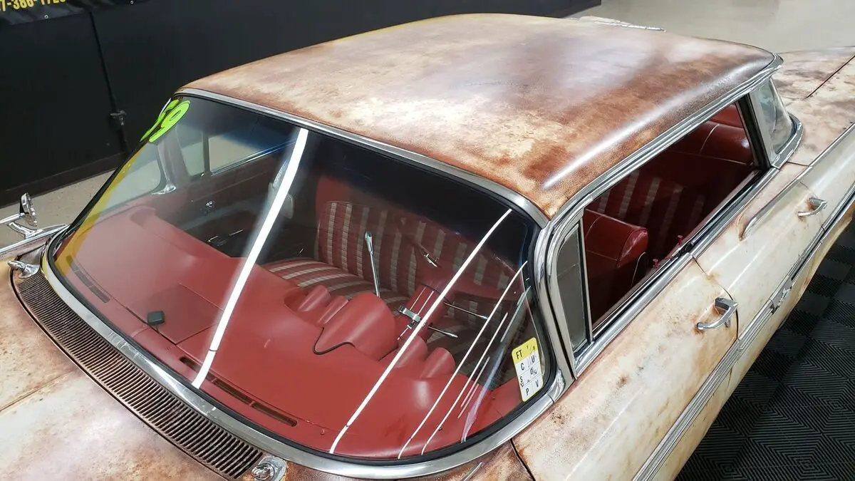 1959 Chevrolet Impala in White patina. This 4dr Flat top is powered by an LS V8 engine that is paired up with a 4L60E auto w/OD transmission. Original Ermine White car that, after it had weathered some, has been cleared over with a satin finish. Riding on black 20" wheels with beauty rings and Chevrolet center caps with 2023-dated tires. Reupholstered (and recarpeted) interior with red vinyl/cloth combination bench seat and column shift. Our techs noted the brakes are like new, front and rear shocks replaced, right outer tie rod end is new, steering gear and pitman arm also replaced. Aftermarket Dolphin gauges installed in the dash. Odometer is not working on new gauges.