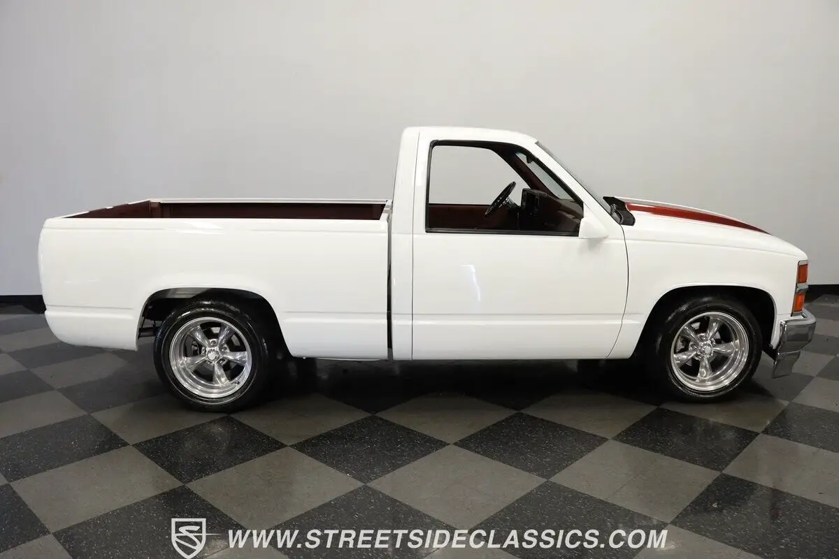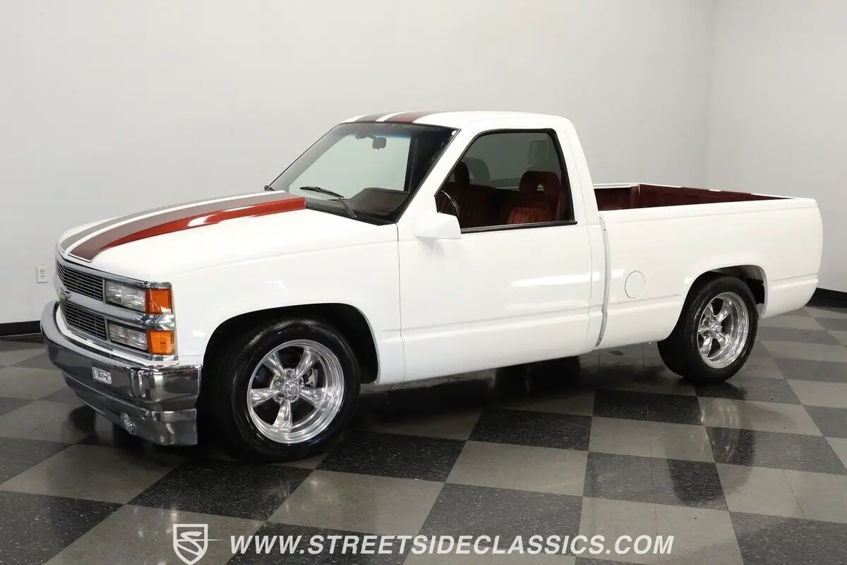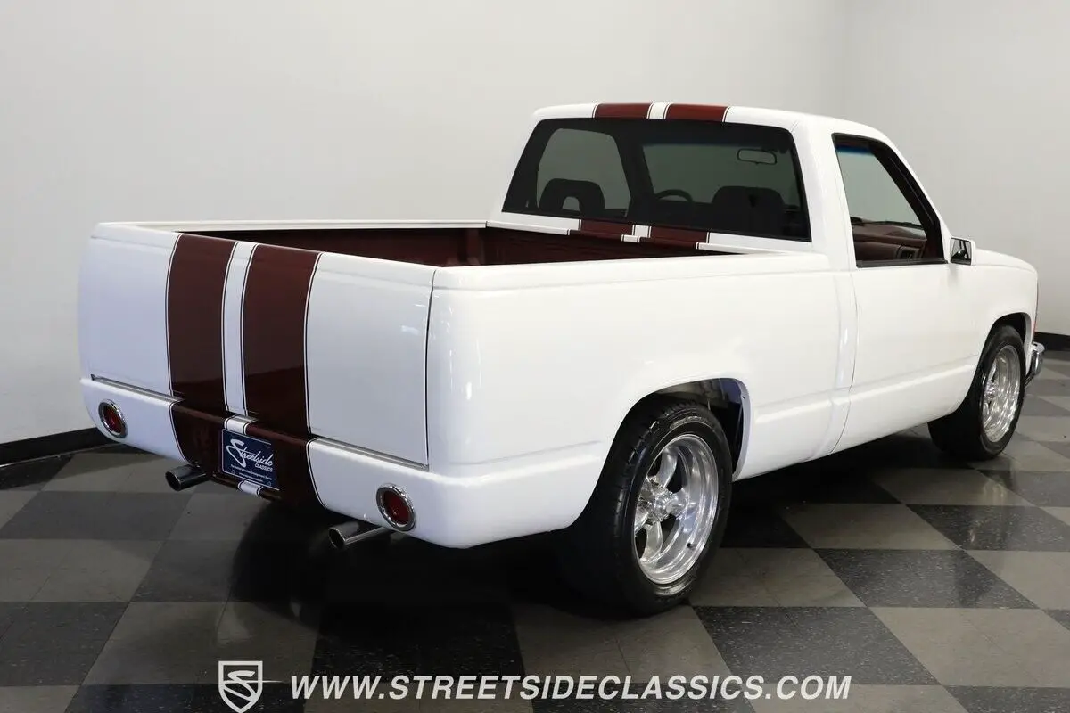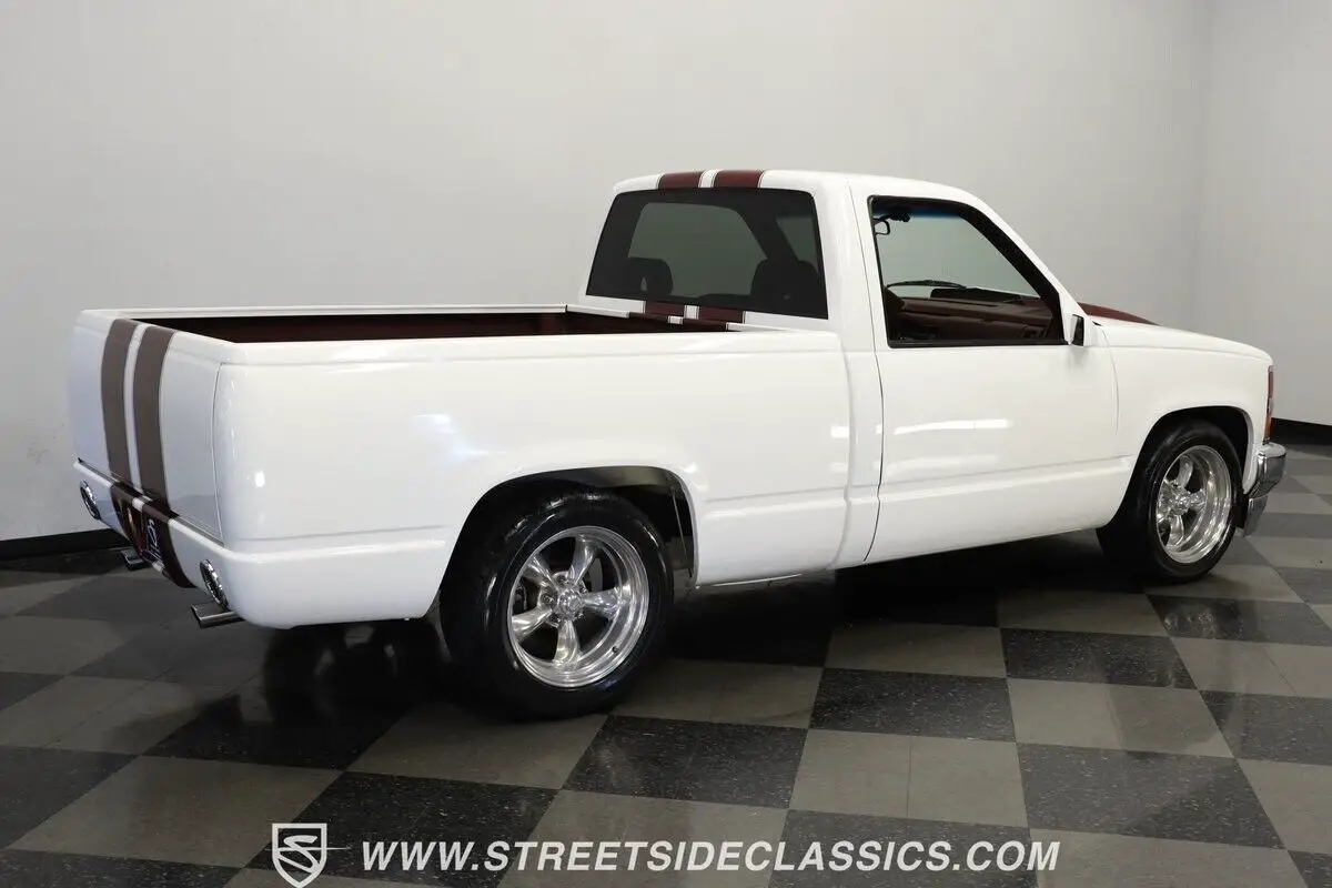 4812-TPA 1994 CHEVROLET SILVERADO 1500 HIGHLIGHTS: • 350 V8 Crate Motor • Holley Throttle Body Fuel Injection • MSD Ignition System • 700R4 4-Speed Automatic Transmission • Aluminum Edelbrock Heads • Edelbrock Performer Intake • Aftermarket Headers • Power Disc Brakes • Power Steering • Be Cool Aluminum Radiator with Electric Fan • Serpentine Belt System • White and Burgundy Two-Tone Paint • 18" American Racing Rims • 275/40ZR18 Nitto Radial Tires • Cowl Hood • Billet Grille • Upgraded Front Bumper with Integrated Lights • Custom Fiberglass Rear Bumper • Shaved Door Handles • Tinted Windows • Sport Mirrors • Color-Coordinated Bed Liner Paint • Burgundy Interior with Crushed Velour Split-Bench Seats • Dakota Digital Analog Gauges • Sony AM/FM CD Player with Aux and Bluetooth • Tilt Steering Column • Aftermarket Chrome Steering Wheel • Power Windows • Electric Door Poppers • Floor Shifter Upgrade