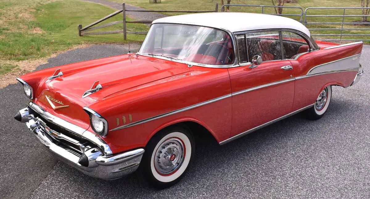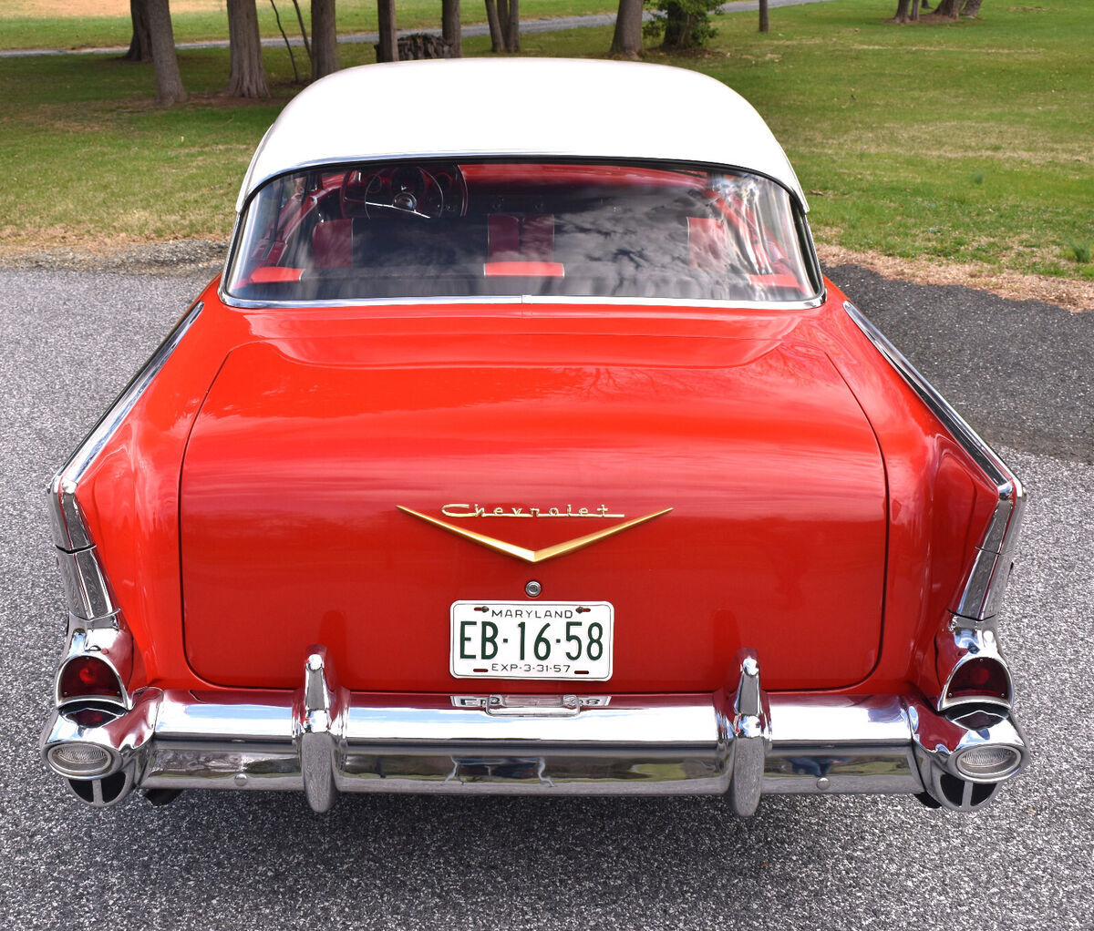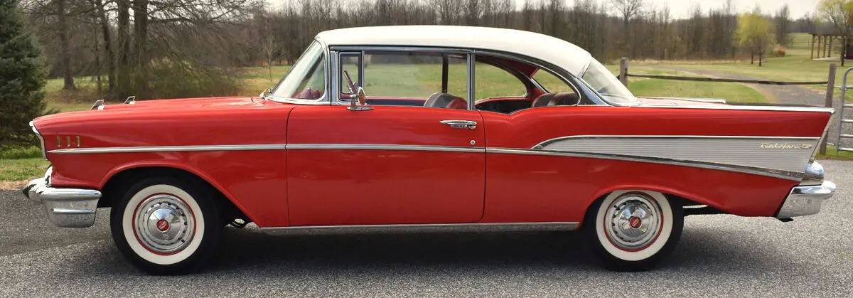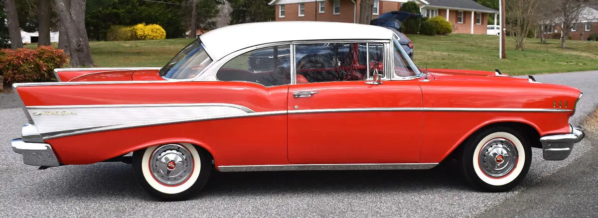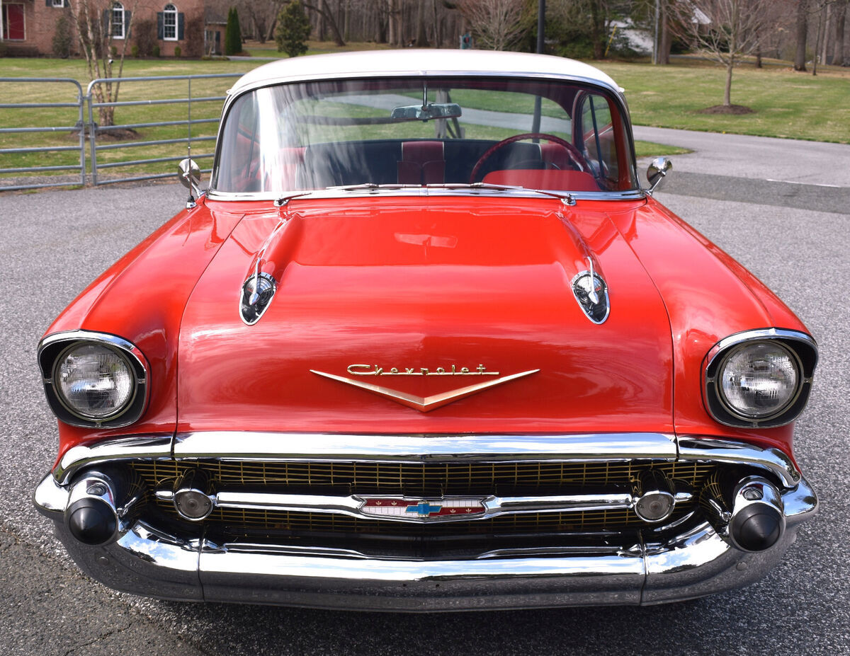 [isdntekvideo]Beautifully restored and numbers matching 1957 Chevrolet Bel Air 2-door hardtop in the original two-tone Ivory White & Matador Red and the matching black and red cloth / vinyl interior. Power comes from the #’s matching 283 cu. in. Super Turbo-Fire V-8 with its Rochester 4-barrel carburetor putting out 220 horsepower. Factory options include power steering, power brakes, and a ‘wonder bar’ AM radio.