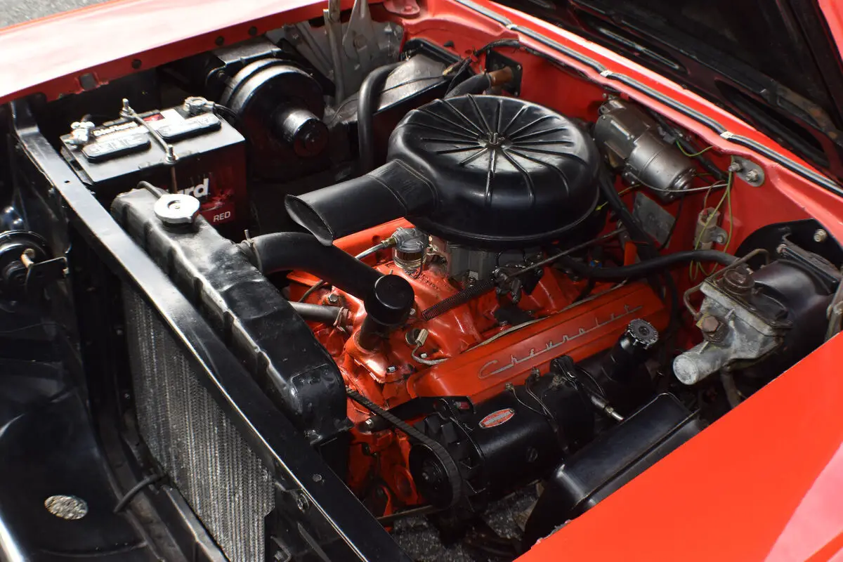ENGINE & TRANSMISSION: The stock 283 cu in V8 runs smoothly and does not show any leaks or smoke. The Factory Rochester Carb still retains its ID tag. The BW T-10 shifts easily with the backup lights operating by a toggle switch under the dash (note they were on in the video). Mufflers and gas tank look like they were recently replaced and the battery is new.