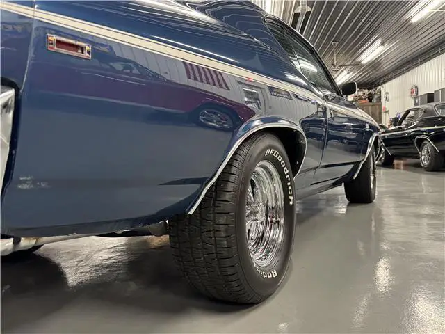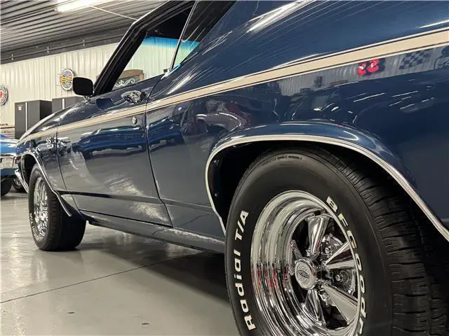 This is one sharply dressed 1969 Chevelle SS in its factory color code 51 Dusk Blue with white SS stripes running down both sides!! The body is clean and straight. Looking down both sides it is straight, no rust or damage, and the panels fit square and flush. The paint has a smooth and very glossy finish. The door jambs are glossy and the bottom of the doors are clean. The weather stripping and window seals have been replaced. The chrome and trim are in very good condition. It sits on a set of Cragar 5 spoke SS wheels, 15x8 in the rear with a 275/60/15 and 15x7 in the front 245/60/15 wrapped with a set of BFG T/A radial tires!!