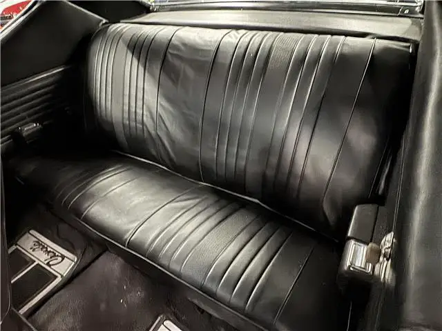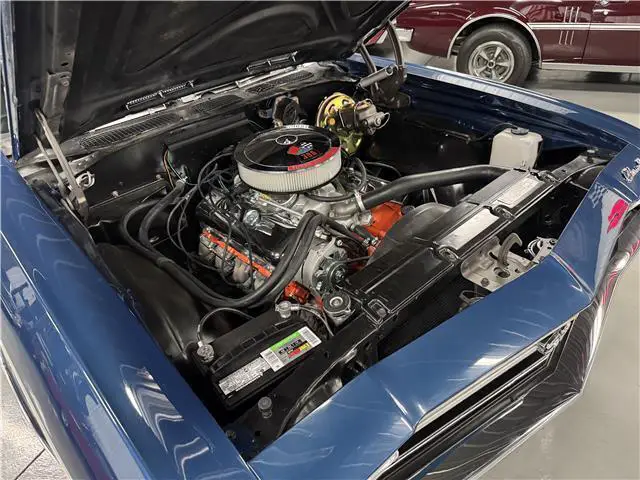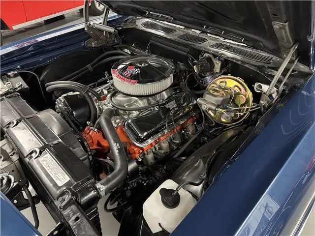 The engine compartment is correct and nicely detailed with its period-correct 396 ci engine. Some features include: HEI ignition, Edelbrock aluminum intake manifold, dual feed Holley carburetor with correct fuel line, factory correct chrome valve covers, chrome air cleaner, factory exhaust manifolds and a cadmium plated brake booster with newer master cylinder. There are original style spring battery cables, GM radiator hoses, factory tower clamps, correct 4 core radiator and fan shroud. It also has power steering and power front disc brakes. The engine compartment has a nice satin black finish.
