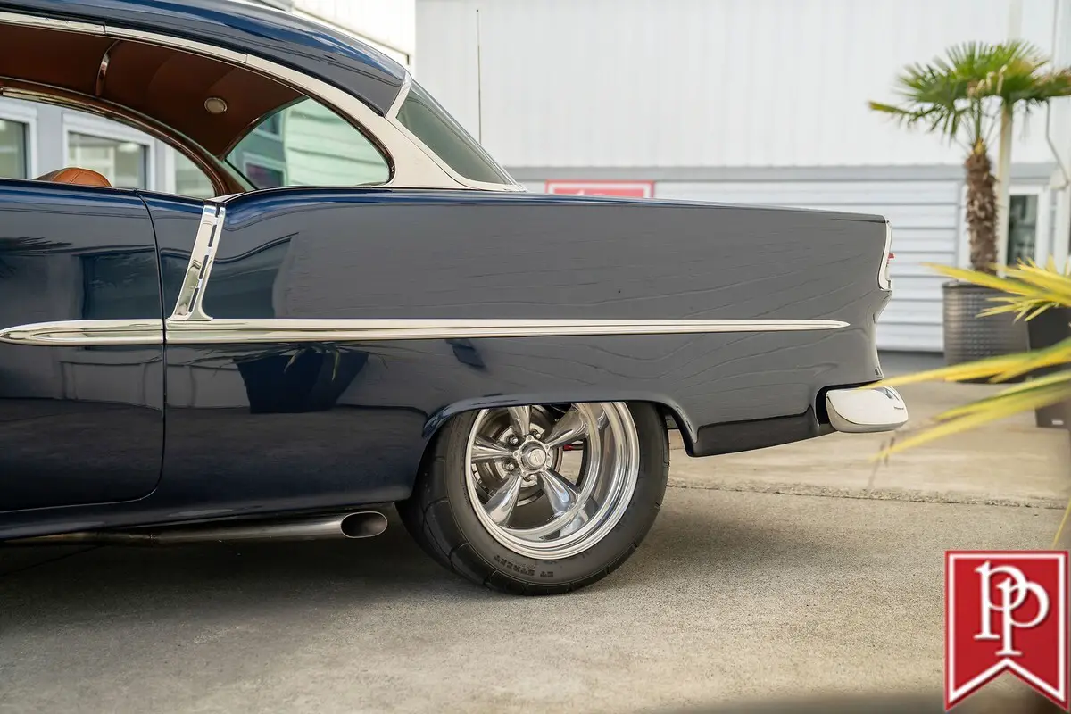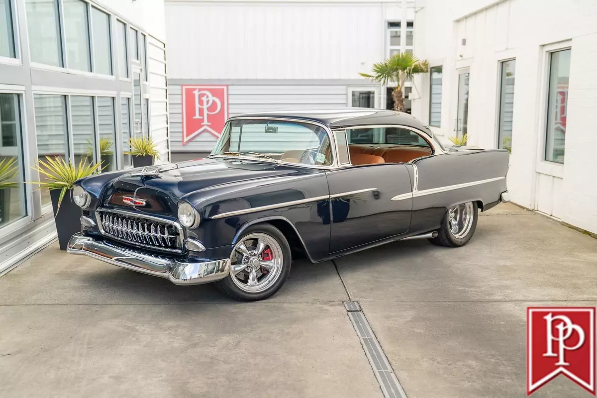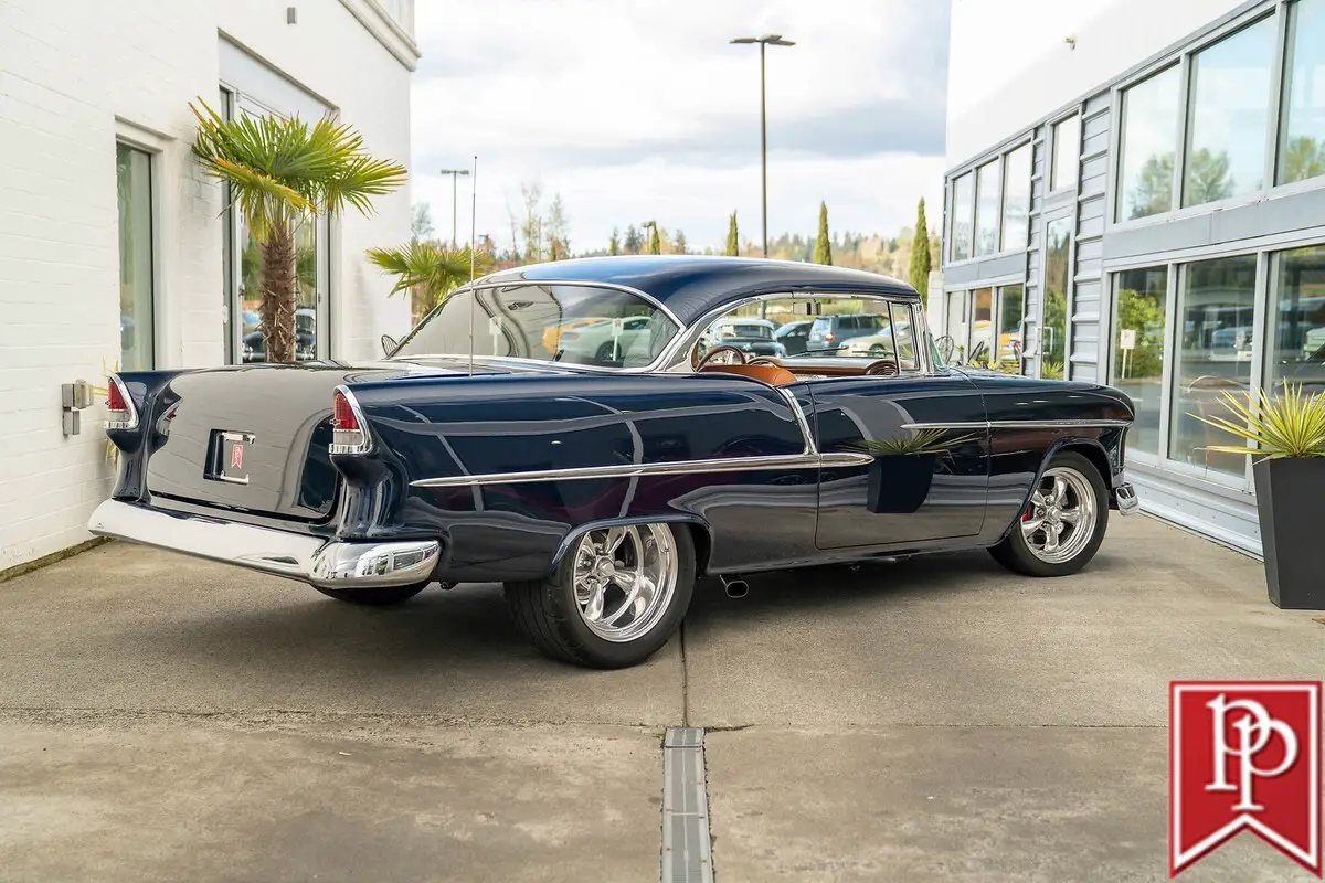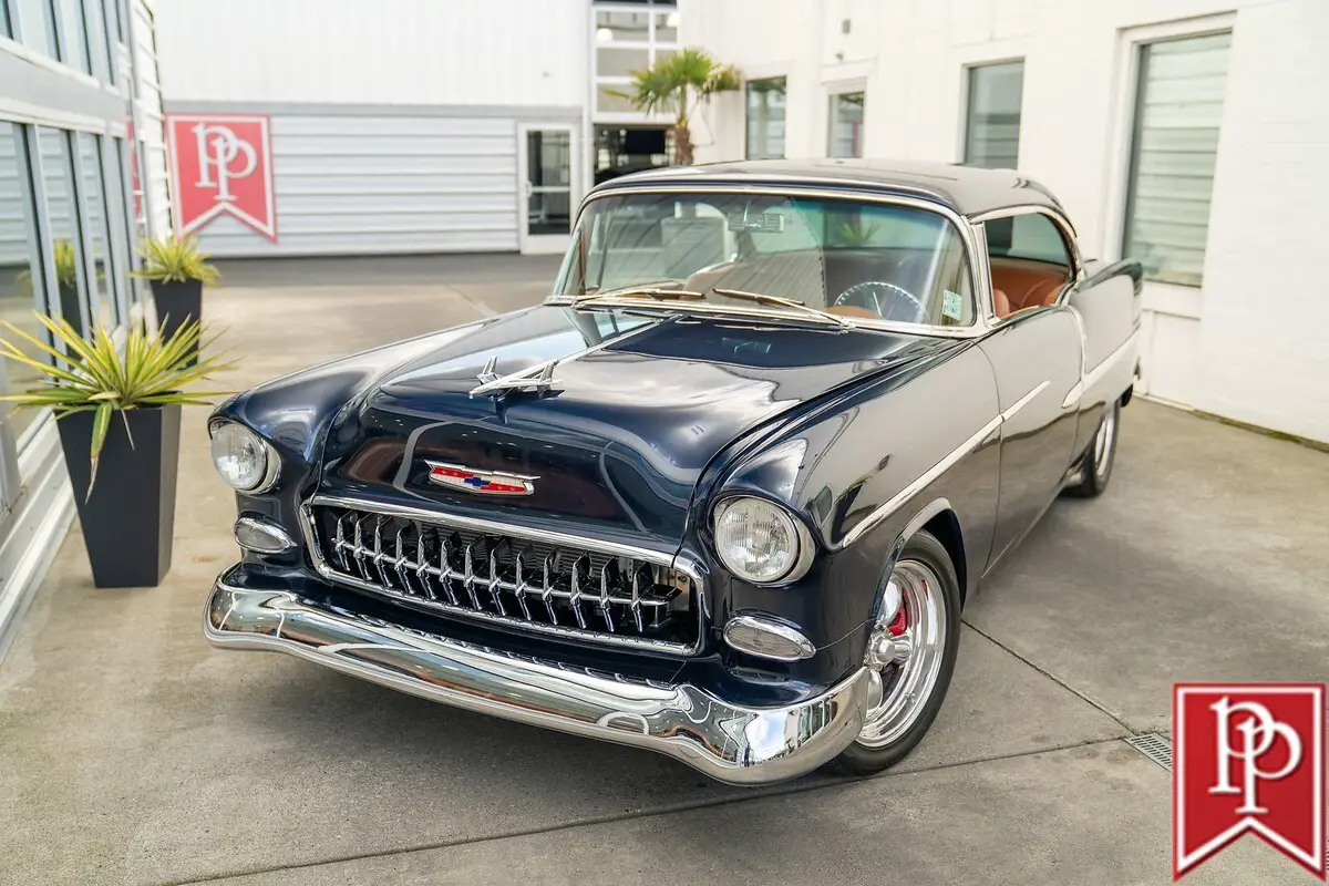 1955 Chevrolet Bel Air Coupe The Tri-Five Chevrolet is an evocative classic. A stunningly designed car, that, during its three year production run between 1955 and 1957, offered looks, performance and luxury, that was not out of reach for the general public. Offered in multiple body-styles and with countless trim packages, the Bel Air was the one to have, with its famous chrome grille, bumpers and side trim. This 1955 Chevrolet Bel Air is a 2-door coupe that has been extensively modified for outstanding performance and comfort, without compromising the original shape that made it so famous. Finished in a stunning shade of deep metallic blue, this Bel Air has had a number of subtle body modifications that enhance the overall appearance, but are subtle enough that you might not even notice. Shaved door handles and trunk lid give the car an almost concept-car look, and are paired with remote poppers on a fob and the chrome bumpers have been smoothed to a single piece as well. The headlights may look classic, but they are actually from Delta Xenon and provide excellent light, while polished American Racing wheels sit in front of Corvette disc brakes in front. A fully custom exhaust features for side pipes on each side of the car that exit just behind the front doors and give this car an appropriately aggressive noise. The interior is undeniably custom, and was completed to a stunning level. Finished in tan leather on the seats, center console, door cards and dash board, the carpets have been reupholstered to match, with leather edging around the cabin. In front, a pair of bucket seats are separated by a large console with auxiliary gauges, controls for the Vintage Air climate control, power window switches and more. Slide behind the wheel and you are met with a billet steering wheel with a leather wrapped rim, and through that a set of white-faced gauges inset within stunning billet metal dashboard trim. The trunk is upholstered to match the interior. Under the hood sits an enormous 540ci V8 from Dart Machinery. This is known to be a manufacturer of high-quality engines, and is topped by a Holley HP carburetor with a ZEX nitrous-oxide system installed as well. Keeping everything cool is a sizable aluminum radiator from Be Cool with dual electric fans, and a serpentine pulley system has also been installed. Power is sent from this engine through a TH400 3-speed automatic to the rear wheels, which are on a 4-link suspension setup. At all four corners, QA1 coilovers have been fitted which allows the owner to dial in the ride height and other suspension characteristics. This 1955 Bel Air is nothing short of a stunning build that will get loads of attention everywhere you go. From its subtle good looks, to the massive power plant under the hood, everything has been thoroughly figured out and with a few thousand miles under its wheels since the build was completed, the teething issues should be all ironed out. Key Features Custom Bodywork Shaved Door Handles Shaved Trunk Lid Badging Removed Motorized Taillight Fuel Filler Cover Remote Door Popper 540ci Dart V8 Holley Carburetor Twin Side-Draft Intake ZEX Nitrous System Aeromotive Fuel Pump Stainless Fuel Tank Be Cool Aluminum Radiator w/Dual-Fans Serpentine Belt Headers TH400 3-Speed Automatic 4-Link Rear Suspension QA1 Coilovers Full Custom Interior Vintage Air Parrot Stereo Head Unit Upgraded Gauges Front Bucket Seats For more information on this 1955 Chevrolet Bel Air Custom or any of our 100+ High-Performance, Exotic and Special Interest cars always in stock, contact one of our friendly and knowledgeable sales consultants or always feel free to drop by our 40,000+ sq ft of Indoor Showrooms in Bellevue, WA - Home of an Exciting Inventory of Luxury, Exotic, High Performance and Collectible Automobiles. With 200+ Always On Site, Nobody Has What We Have!
