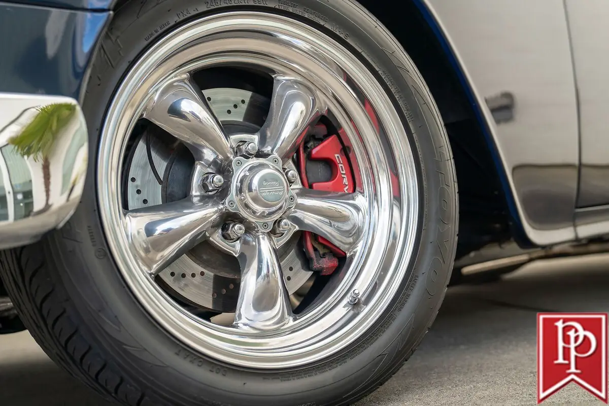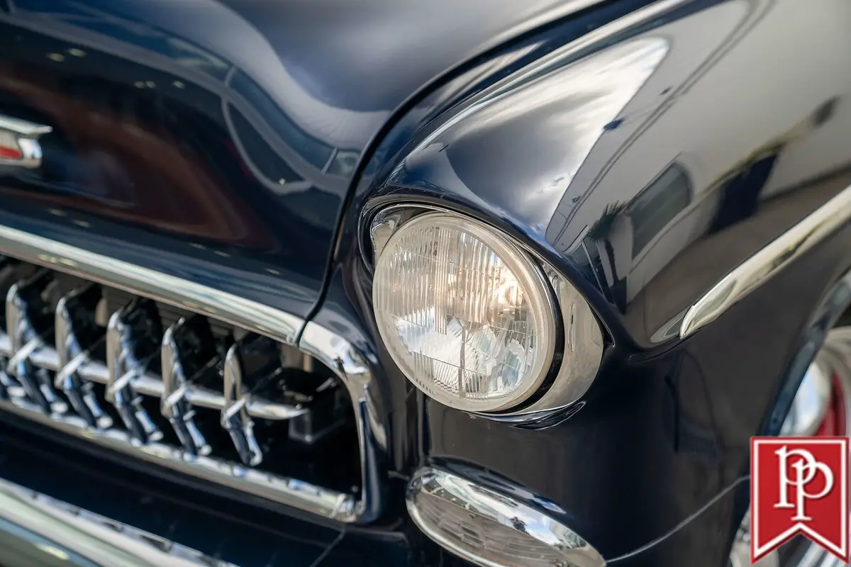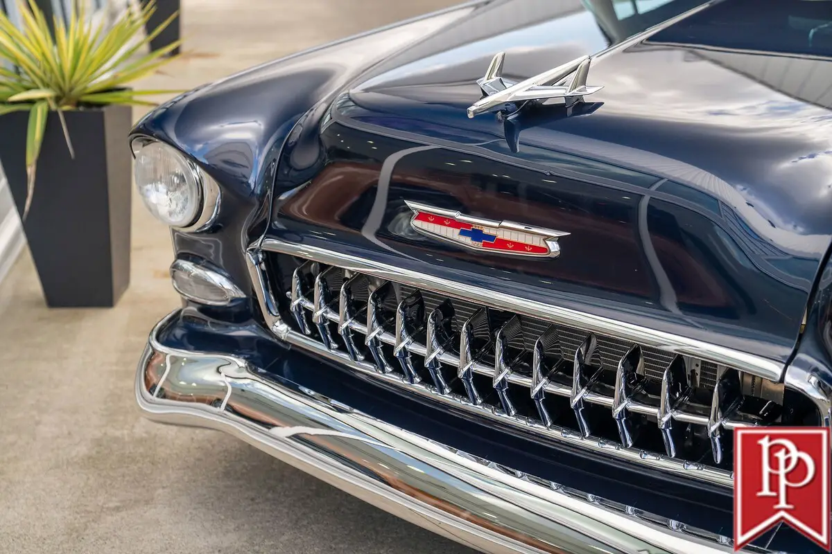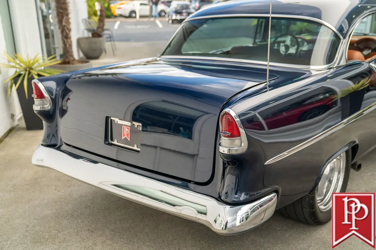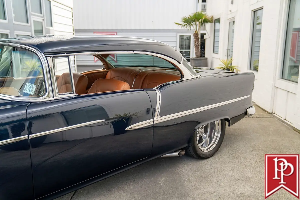 1955 Chevrolet Bel Air Coupe The Tri-Five Chevrolet is an evocative classic. A stunningly designed car, that, during its three year production run between 1955 and 1957, offered looks, performance and luxury, that was not out of reach for the general public. Offered in multiple body-styles and with countless trim packages, the Bel Air was the one to have, with its famous chrome grille, bumpers and side trim. This 1955 Chevrolet Bel Air is a 2-door coupe that has been extensively modified for outstanding performance and comfort, without compromising the original shape that made it so famous. Finished in a stunning shade of deep metallic blue, this Bel Air has had a number of subtle body modifications that enhance the overall appearance, but are subtle enough that you might not even notice. Shaved door handles and trunk lid give the car an almost concept-car look, and are paired with remote poppers on a fob and the chrome bumpers have been smoothed to a single piece as well. The headlights may look classic, but they are actually from Delta Xenon and provide excellent light, while polished American Racing wheels sit in front of Corvette disc brakes in front. A fully custom exhaust features for side pipes on each side of the car that exit just behind the front doors and give this car an appropriately aggressive noise. The interior is undeniably custom, and was completed to a stunning level. Finished in tan leather on the seats, center console, door cards and dash board, the carpets have been reupholstered to match, with leather edging around the cabin. In front, a pair of bucket seats are separated by a large console with auxiliary gauges, controls for the Vintage Air climate control, power window switches and more. Slide behind the wheel and you are met with a billet steering wheel with a leather wrapped rim, and through that a set of white-faced gauges inset within stunning billet metal dashboard trim. The trunk is upholstered to match the interior. Under the hood sits an enormous 540ci V8 from Dart Machinery. This is known to be a manufacturer of high-quality engines, and is topped by a Holley HP carburetor with a ZEX nitrous-oxide system installed as well. Keeping everything cool is a sizable aluminum radiator from Be Cool with dual electric fans, and a serpentine pulley system has also been installed. Power is sent from this engine through a TH400 3-speed automatic to the rear wheels, which are on a 4-link suspension setup. At all four corners, QA1 coilovers have been fitted which allows the owner to dial in the ride height and other suspension characteristics. This 1955 Bel Air is nothing short of a stunning build that will get loads of attention everywhere you go. From its subtle good looks, to the massive power plant under the hood, everything has been thoroughly figured out and with a few thousand miles under its wheels since the build was completed, the teething issues should be all ironed out. Key Features Custom Bodywork Shaved Door Handles Shaved Trunk Lid Badging Removed Motorized Taillight Fuel Filler Cover Remote Door Popper 540ci Dart V8 Holley Carburetor Twin Side-Draft Intake ZEX Nitrous System Aeromotive Fuel Pump Stainless Fuel Tank Be Cool Aluminum Radiator w/Dual-Fans Serpentine Belt Headers TH400 3-Speed Automatic 4-Link Rear Suspension QA1 Coilovers Full Custom Interior Vintage Air Parrot Stereo Head Unit Upgraded Gauges Front Bucket Seats For more information on this 1955 Chevrolet Bel Air Custom or any of our 100+ High-Performance, Exotic and Special Interest cars always in stock, contact one of our friendly and knowledgeable sales consultants or always feel free to drop by our 40,000+ sq ft of Indoor Showrooms in Bellevue, WA - Home of an Exciting Inventory of Luxury, Exotic, High Performance and Collectible Automobiles. With 200+ Always On Site, Nobody Has What We Have!