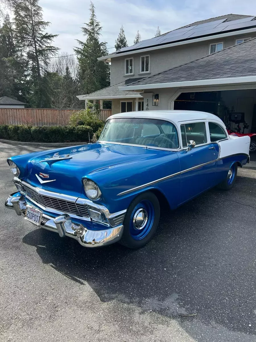 1956 Chevy 210 Post $48,000 OBO Only 1,800 miles on rebuild, Full frame-off rebuild with pictures available upon request. Electric Blue and Pearl White, 90% of All Chrome has been Re-Done, CA 1-Piece Front and Rear Bumpers, Entire Chassis and Sub Parts Powder Coated, West Coast Engines Built 383 Stroker Hydraulic Roller Cam, APE Aluminum Heads, Eagle Crankshaft, Edelbrock Performer RPM Intake, Aluminum Valve Covers, Cloyes Timing Gear(Full Build Specs and Dyno Sheet Available), TCI Street Fighter 700R4 Transmission with Front Mount Maxx Cool Trans Cooler, TCI Street Fighter Torque Converter 3000-3600 Stall, Lokar Trans Dip Stick, Ford 9 Rear End w/ Strange Engineering Pro Iron Eaton TrueTrack-3.50 Gearing, 31 Spline Axles, Aluminum Driveline, Custom 17 Steel Wheels and Dog Dish Hub Caps-Paint Matched, CPP Tubular Control Arms with Lowering Springs, 2 Drop Leaf Rear, Hydroboost Brake System with GM Disc Front and Drum Rear, Custom Built Radiator Support with Twin Cooling Fans, Billet Specialties Aluminum Pulley Set-Up, B&M Quicksilver Shifter, Autometer Old Time Gauges with Custom Billet Aluminum Gauge Insert, Holley Fuel Pressure Regulator, Patriot Tri 5 Ceramic Coated Headers, FlowMaster 40 Series with Turndowns, Holley Street Avenger 770 Carb, MSD Pro Billet Distributor, MSD Street Fire Ignition Box, MSD Blaster 2 Ignition Coil, Full Trunk Coating with Battery Relocation, Custom Autosound Radio made to look period correct and have digital and Bluetooth capability I'm sure I am missing stuff but the car speaks for itself. Only Issues: Has Small Trans Pan Leak Likely From Gasket. Driver Side main window has crack but I do have the replacement pane to fix. Just not installed yet. Car runs awesome with tons of power. $48,000 OBO Buyer to pay all shipping/transportation costs.