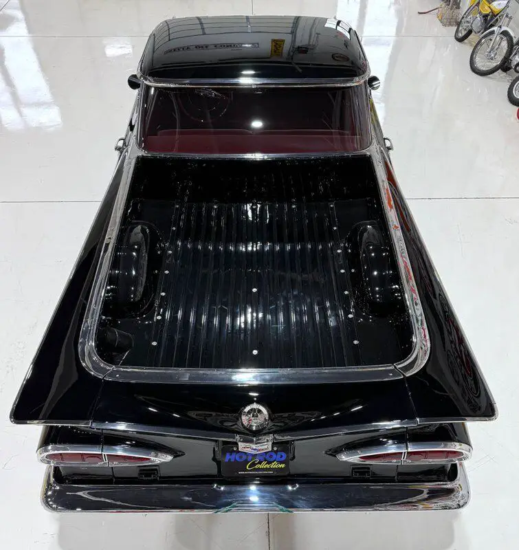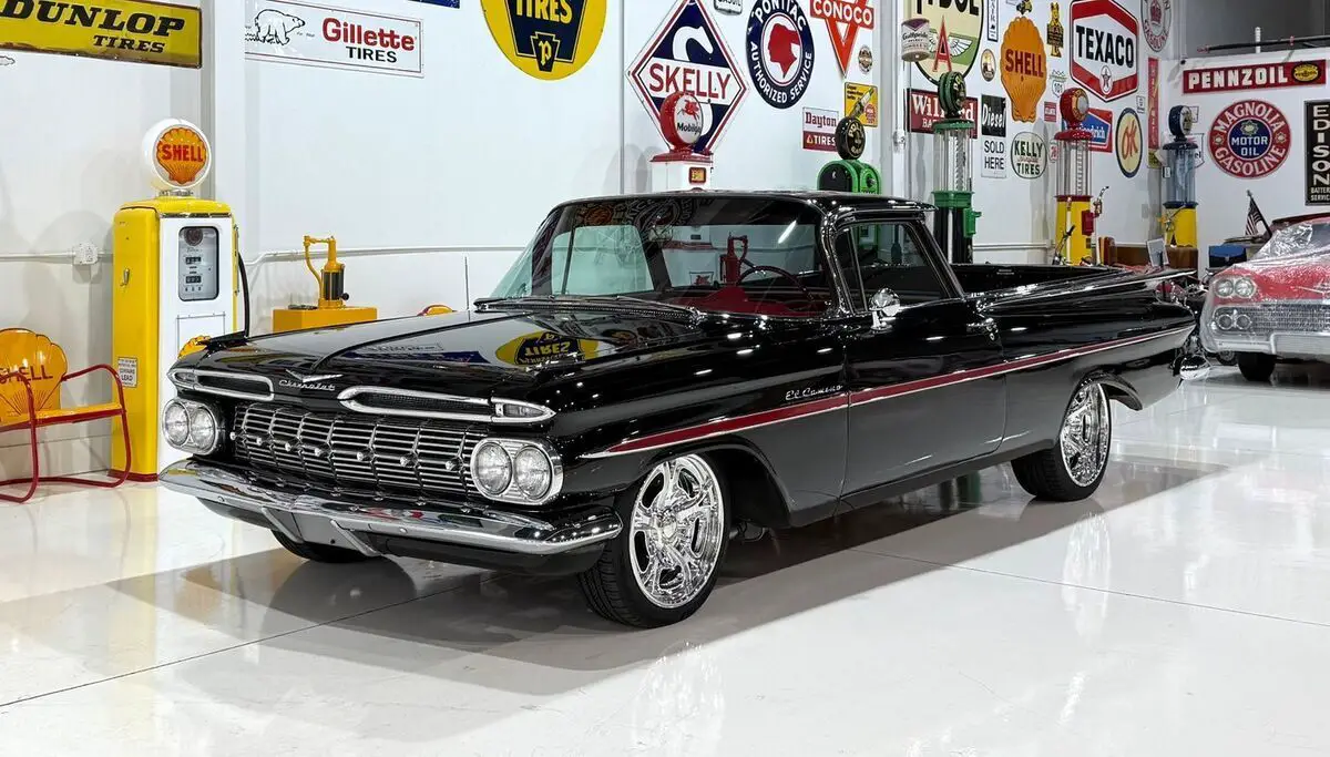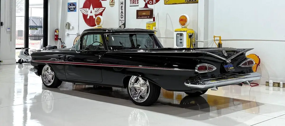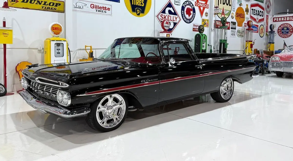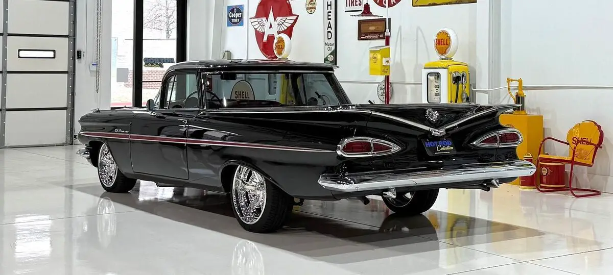Vehicle Original VIN : H59L138892See car on Hotrodcollection. com We welcome trade ins This car comes with two sets of wheels and tires - factory-type wheels and tires PLUS Custom made Schott Wheels with new Michelin 215-45-ZR18 in front and 245-40-ZR20 in the rear. • Chassis: 138891 • 1k Miles Shown, TMU • 283ci V8 • Two-Speed Automatic Transmission • Black Paint • Red Vinyl Upholstery • 14" Steel Wheels and factory hubcaps • AM Radio • Chrome Bed Rails This 1959 Chevrolet El Camino was refurbished under prior ownership and is finished in black over a red interior. Power is provided by a 283ci paired with a two-speed Powerglide automatic transmission, and features include red-accented moldings and chrome bed rails. It is also equipped with an AM radio, a heater, a bench seat, and red and black carpets. The body was refinished in black during the refurbishment in 2019 and features red-accented side moldings, chrome bed rails, and "cat's eye" taillights. Braking is handled by drums at all four corners. The front bench seat is upholstered in red vinyl and is joined by a color-coordinated dashboard, headliner, and door panels. Equipment includes a heater, a push-button radio, and red and black carpets. The two-spoke steering wheel has a chrome horn ring and frames a 120-mph speedometer and auxiliary gauges. The five-digit odometer shows 1k miles, which is said to be the mileage added since the refurbishment. The 283ci V8 features a Rochester carburetor and an orange-finished engine block, intake manifold, and valve covers. Power is delivered to the rear wheels through a replacement aluminum Powerglide two-speed automatic transmission. The Black 14"Factory steel wheels wear bowtie-branded center caps and are mounted with American Classic narrow-whitewall tires comes with the car. A full-size spare is mounted beneath the bed.