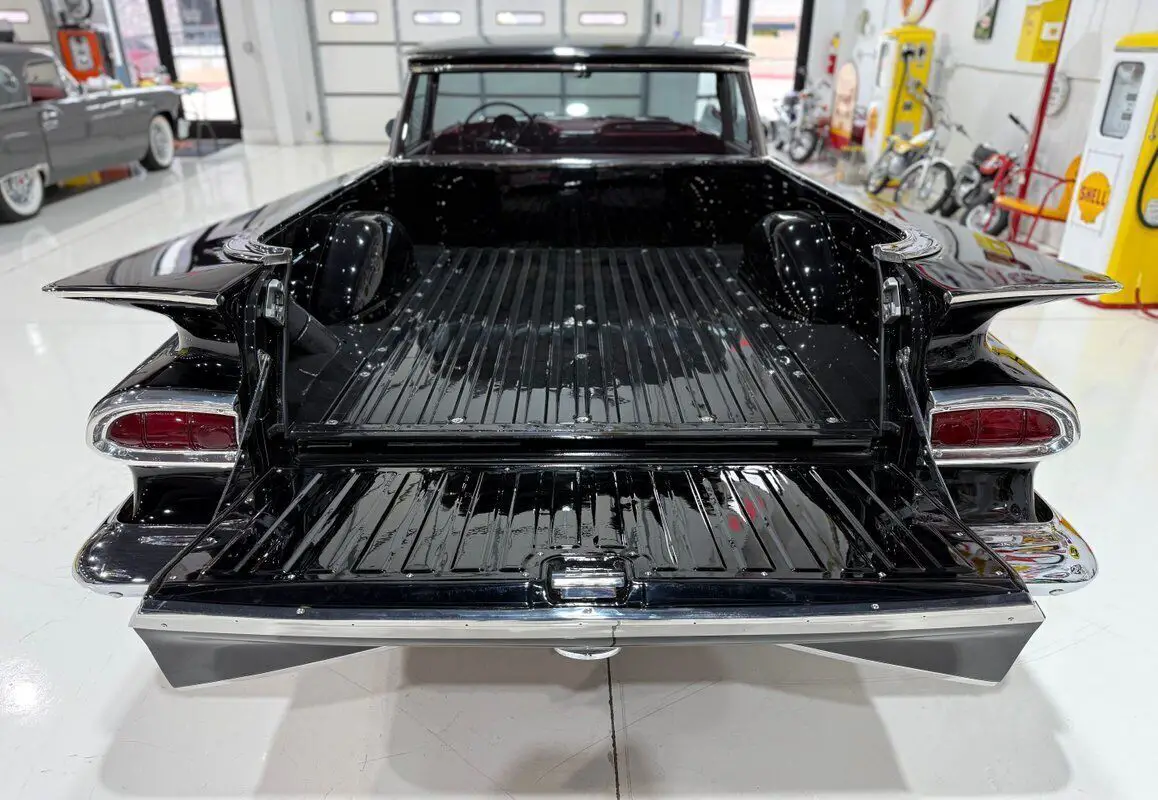 This 1959 Chevrolet El Camino was refurbished under prior ownership and is finished in black over a red interior. Power is provided by a 283ci paired with a two-speed Powerglide automatic transmission, and features include red-accented moldings and chrome bed rails. It is also equipped with an AM radio, a heater, a bench seat, and red and black carpets. The body was refinished in black during the refurbishment in 2019 and features red-accented side moldings, chrome bed rails, and "cat's eye" taillights. Braking is handled by drums at all four corners. The front bench seat is upholstered in red vinyl and is joined by a color-coordinated dashboard, headliner, and door panels. Equipment includes a heater, a push-button radio, and red and black carpets. The two-spoke steering wheel has a chrome horn ring and frames a 120-mph speedometer and auxiliary gauges. The five-digit odometer shows 1k miles, which is said to be the mileage added since the refurbishment. The 283ci V8 features a Rochester carburetor and an orange-finished engine block, intake manifold, and valve covers. Power is delivered to the rear wheels through a replacement aluminum Powerglide two-speed automatic transmission.