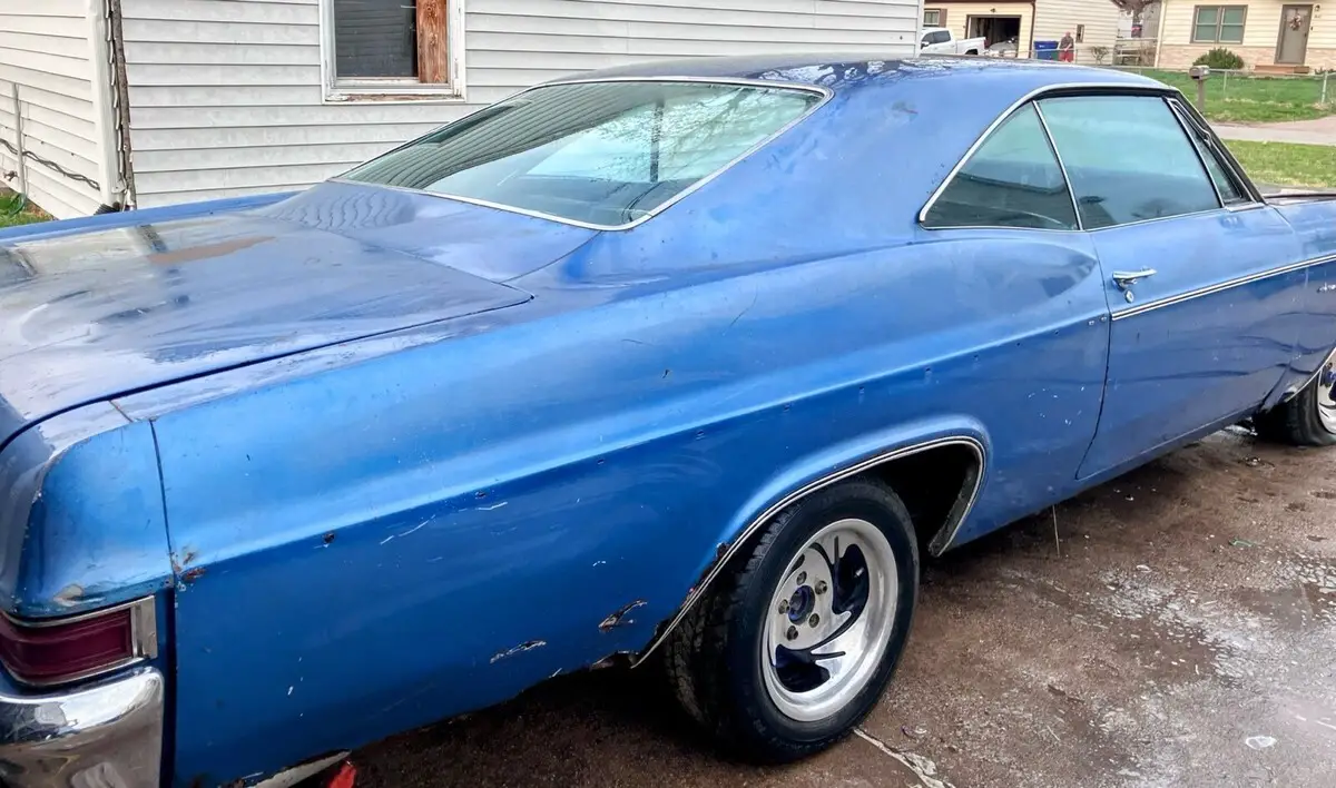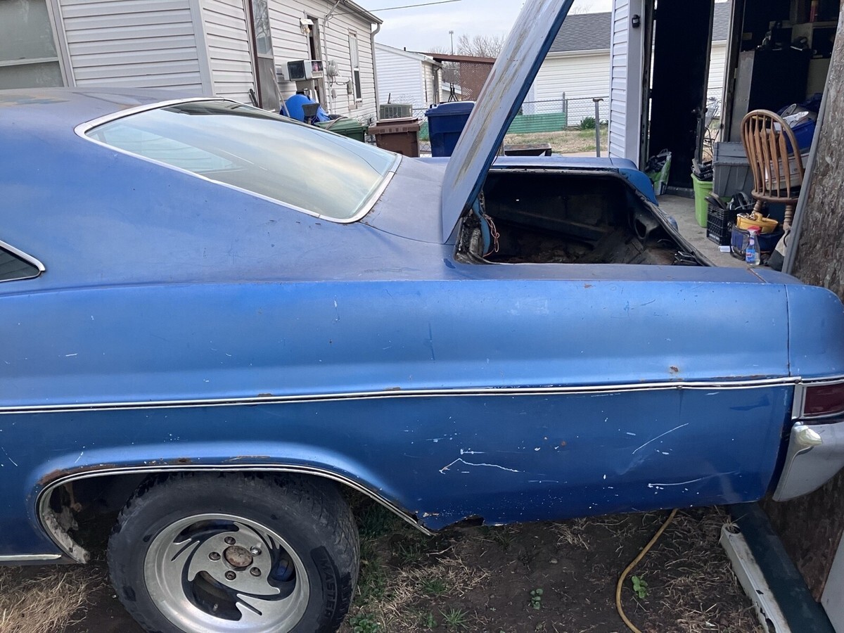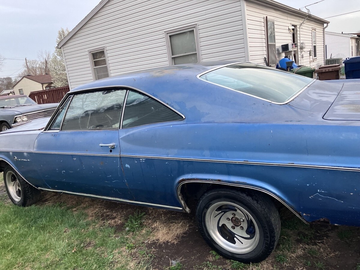 1966 Chevrolet Impala 2-Door Coupe Hardtop. Blue Exterior with Black Interior. This is a Complete, Solid Car with No Holes in any of the Flooring, and No Breaks or Cracks in any of the Glass. It has a 350 Crate Motor, Turbo Transmission, and Driveshaft that was put in about 5 years ago. The Motor Runs Great! There are brand new headliners. It has a Serpentine Belt and the Air Conditioner Blows Cold! There are 4 Bose Speakers, 2 in the front of each door and 2 in the back.