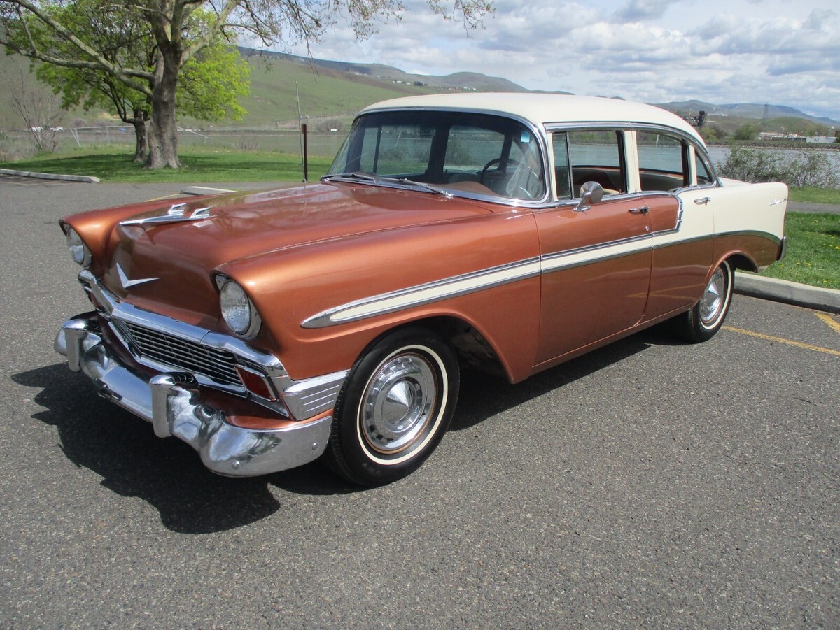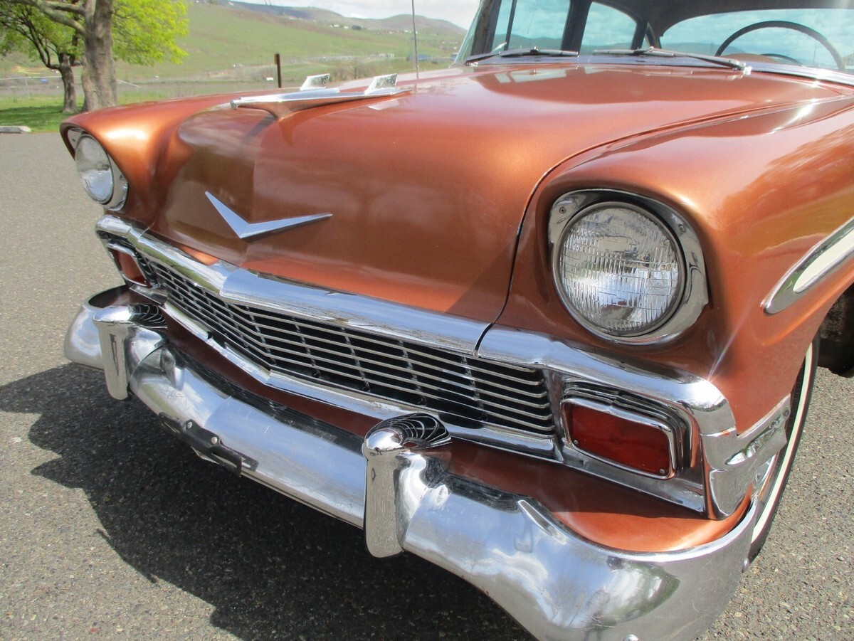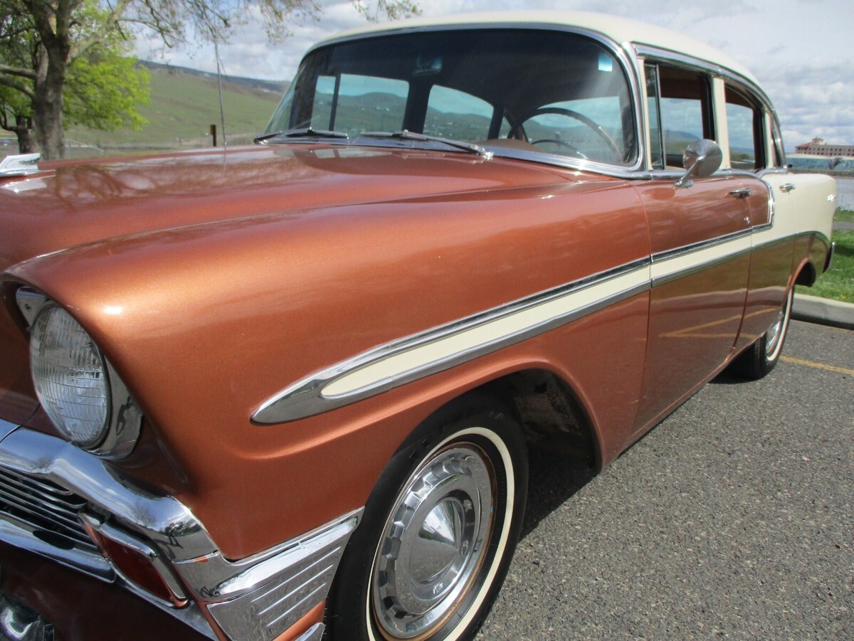 Up for sale is a nice little 1956 Chevy Bel Air that runs and drives very nice. The speedo is showing 102109 Original miles on it. The engine is its original 265 Powerpack 4bbl from the factory and it runs very nice. The original Powerglide transmission has had a rebuild and all brakes are new with new wheel cylinders, new brake hoses and some new brake lines. (it runs and drives well). We couldn't find any rust in the car, but it looks like it has had a minor repair on the front end and the front end has been repainted and doesn't quite match the rest of the car. It also has had a total repaint years ago. It also has a Coupal of very small dings; the worst is on the trunk lid next to the where the license plate goes. (please look at all pictures closely) This car also came from the factory with fender skirts that do come with the car and the original owners' manuals, jack with lug wrench. Also, a car cover dose come with the car. All glass is good except the passenger door window, and it has a crack, but windows roll up and down nicely. The interior has been replaced with new throughout, in its original look even the headliner is new, and it has a padded dash pad. Seatbelts are also in place front and rear. Everything seems to work even the original radio, but the clock and gearshift pointer are not working at this time. The gearshift pointer shows up when in reverse, but I couldn't see it in the other poisons. (very nice Interior and looks new) I'm listing this nice little 56 Chevy for my friend and I will take all questions to him. This is not a show car; it is a nice driver quality car. Buyer is responsible for shipping and all shipping costs. We will help with loading on our end and in anyway we can or just come drive it home. For your questions, please call Bill 208-750-0000.