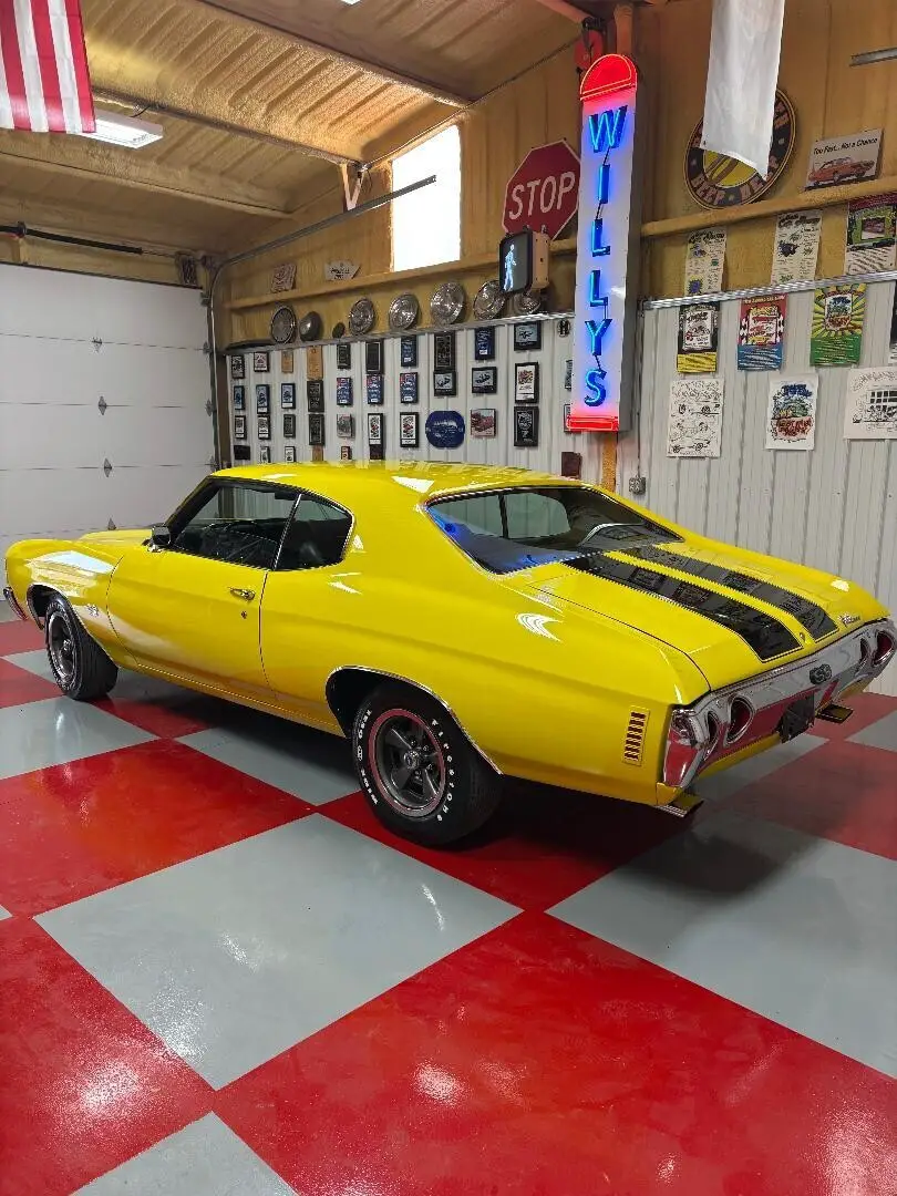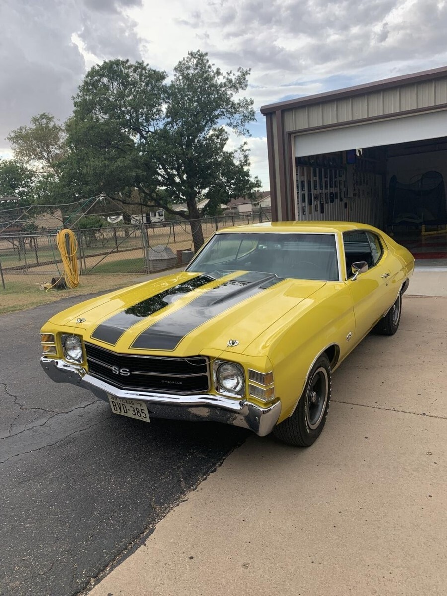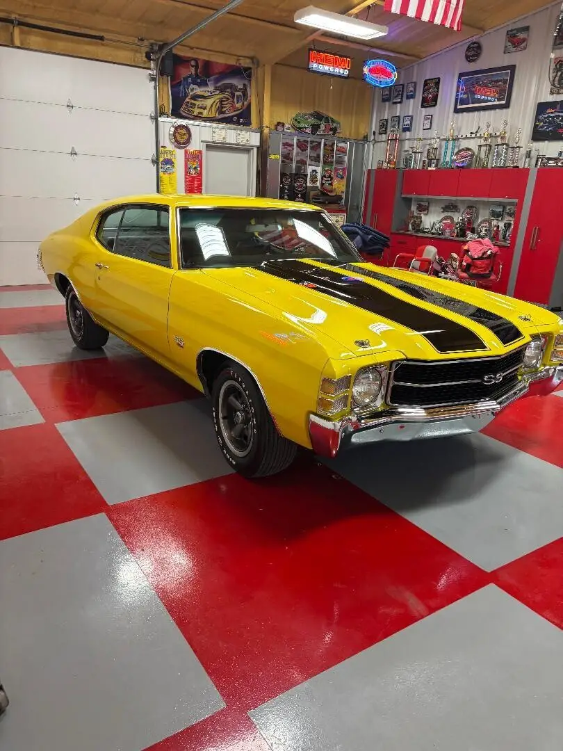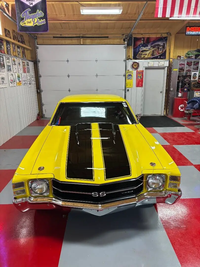 1971 chevelle SS has numbers matching 454/365 HP LS5 Muncie m22 4speed 12 bolt rearend with 3:08 gearsBlack interior with bench seat rare rear window defogger new Led dome lighthas front power disc brakes rear drum brakes finished in original sunflower yellow color with black stripes cowl hoodBumpers are rechromed & are excellent chromed drivers side mirrorargent original style wheels with chrome trim rings firestone wide oval white letter tires