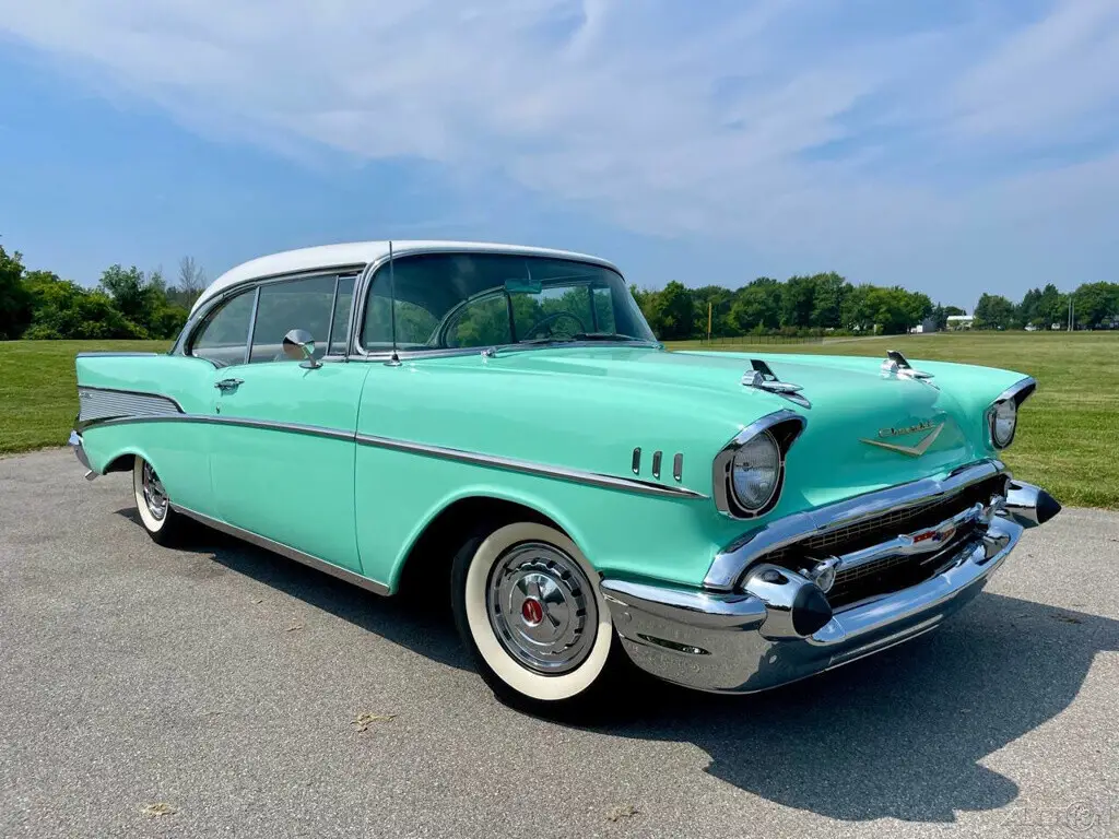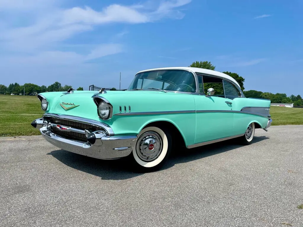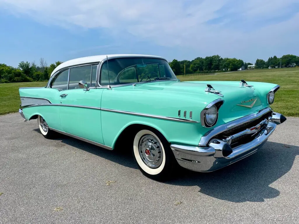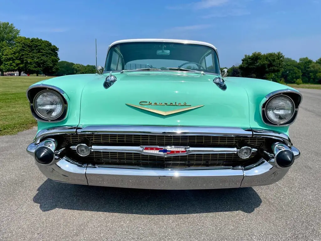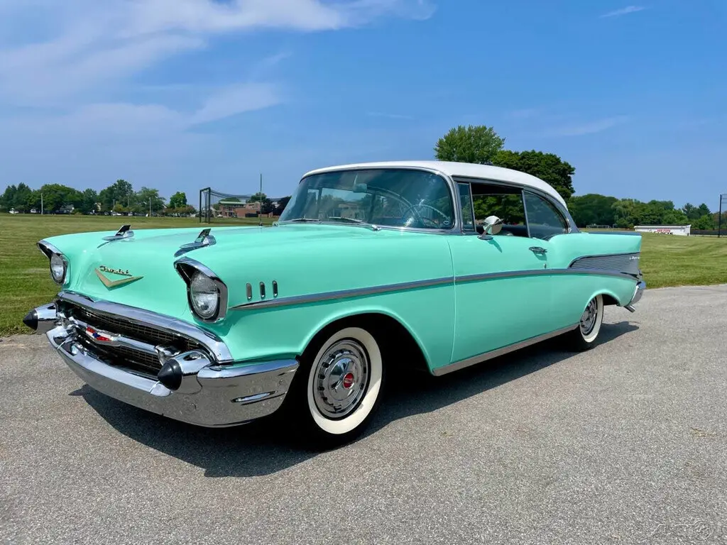 GREAT LAKES CLASSIC CARSPROUDLY PRESENTSThis 1957 Chevrolet Bel Air 2-door Hardtop Beautifuly Finished in Surf Green and White over a Black and Silver interior.The Iconic 'Shoebox' is equipped with a split-folding front bench seat, a cassette stereo, 14" steel wheels, chrome bumpers, back-up lights, rear fender skirts, and a dual exhaust system.The exterior features include twin wind splits, hooded headlights, back-up lights, tinted glass, a fuel filler concealed above the left taillight, and chrome bumpers and trim with 14" steel wheels with faux knock-off covers that are mounted with 205/75 Coker Classic whitewall tires.Phew! That was a run-on...Braking is provided by front and rear drums.The cabin features a split-folding front bench seat upholstered in black and silver cloth and vinyl, appointments include a locking glovebox, a cabin heater, and vent windows.The two-spoke steering wheel features a chrome horn ring and frames a 120-mph speedometer flanked by coolant-temperature and fuel-level gauges.The car is 'Power-Pack' equipped with a 283ci Turbo-Fire V8 that features a four-barrel carburetor paired with a powerglide automatic transmission.We have driven this Beautiful Chevy and can surely attest to its on the road feel as a fine example of a well kept and maintained Tri-Five.We offer competetive interest rates if partial financing is needed and nationwide shipping.THANK YOU FOR YOUR INTEREST IN OUR CHEVY ANDGOOD LUCK 'HAPPY' BIDDING!!