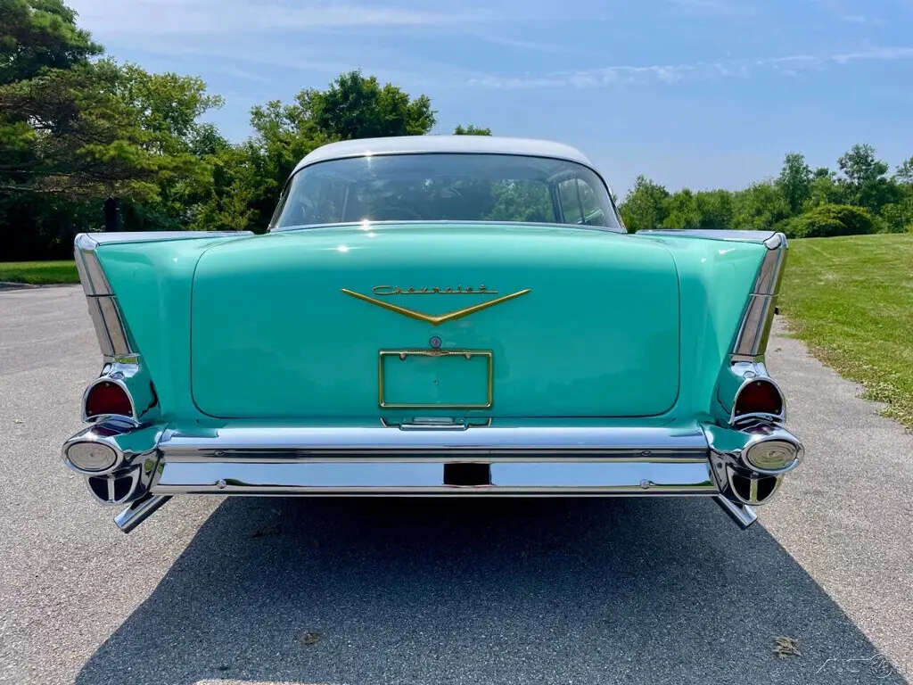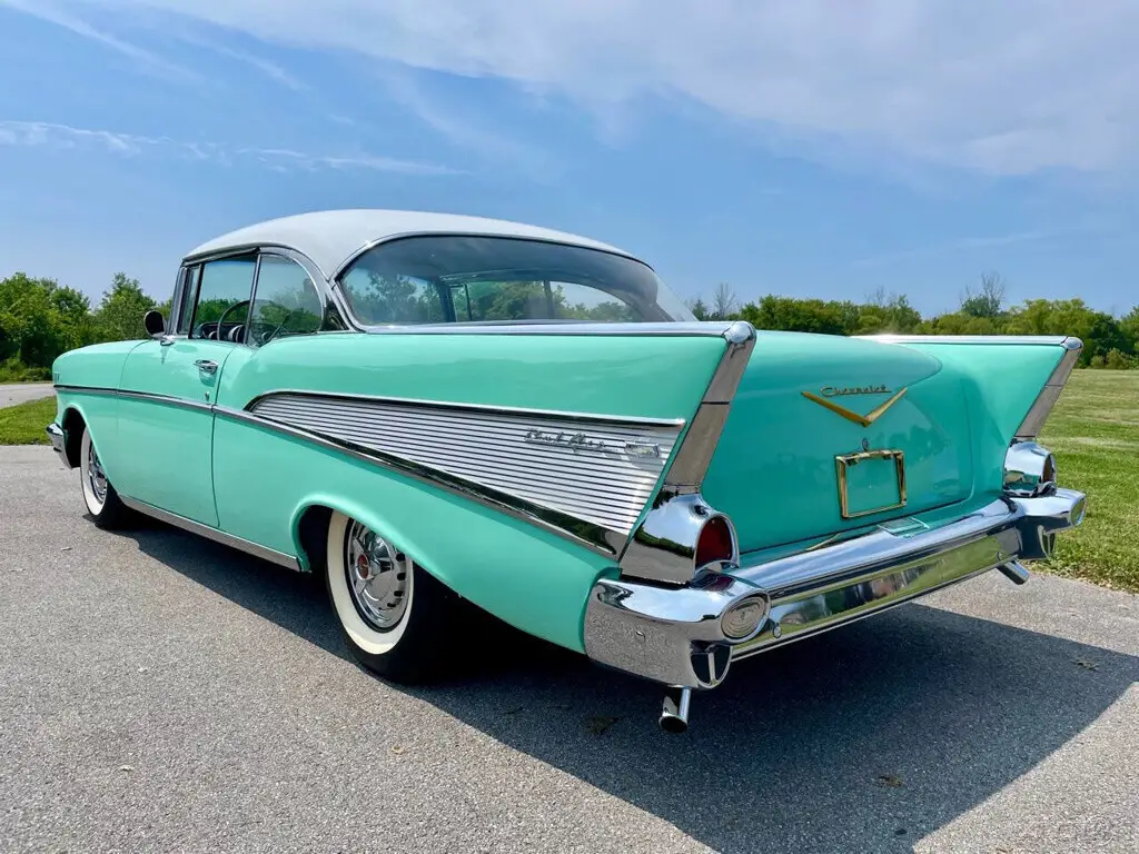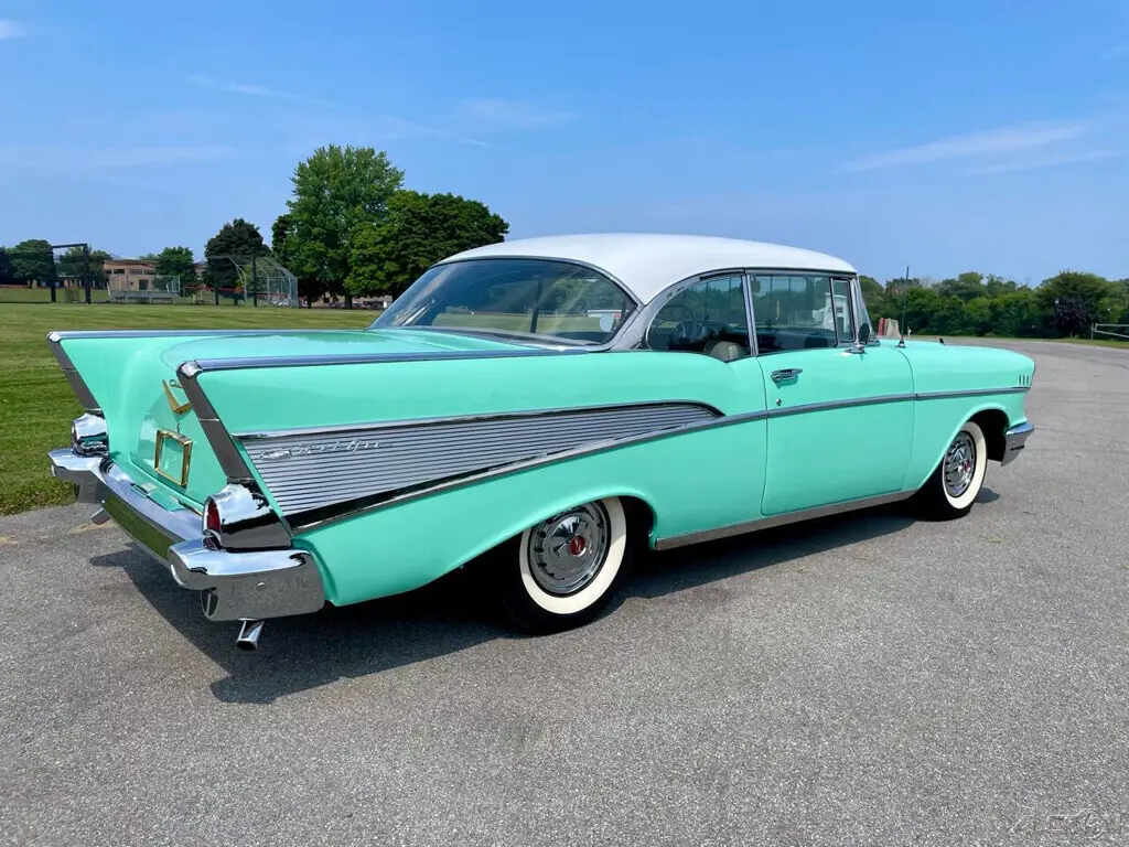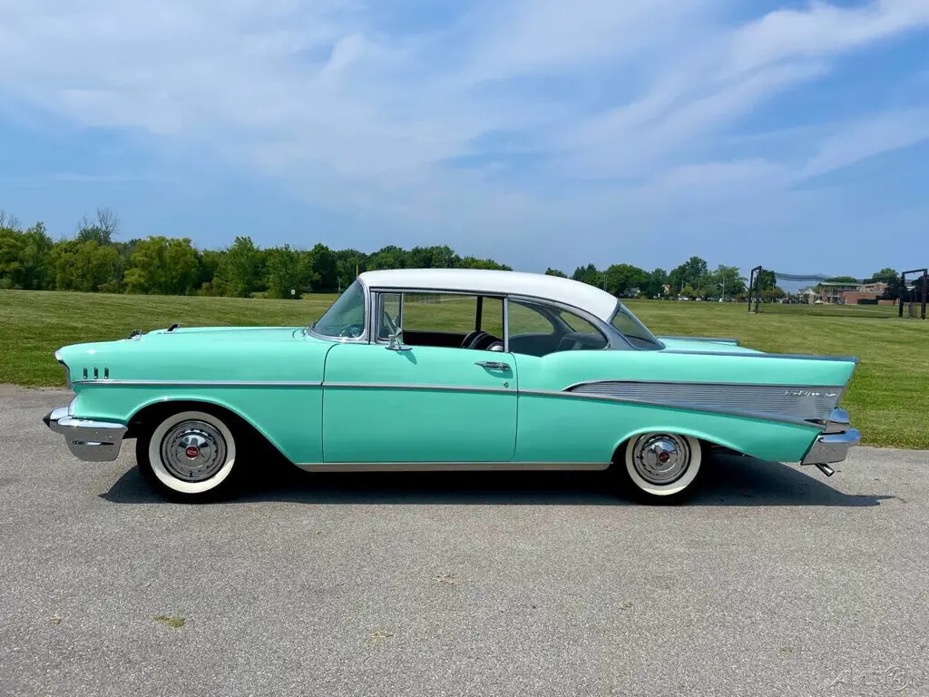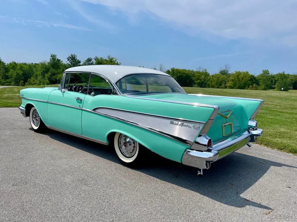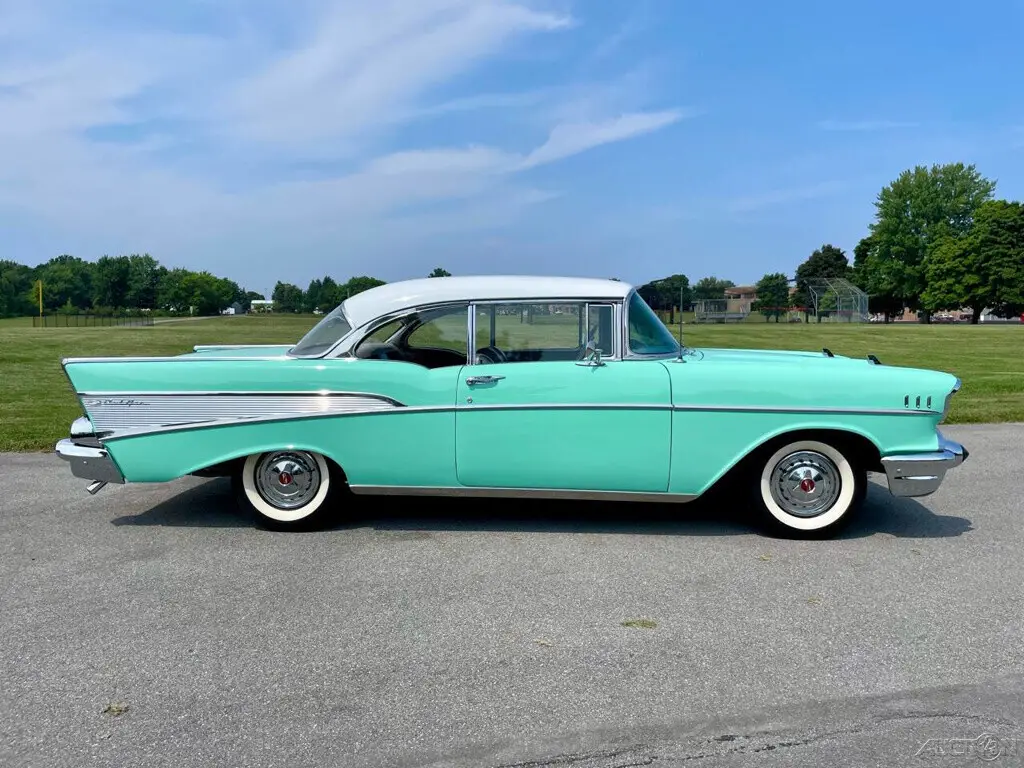 GREAT LAKES CLASSIC CARSPROUDLY PRESENTSThis 1957 Chevrolet Bel Air 2-door Hardtop Beautifuly Finished in Surf Green and White over a Black and Silver interior.The Iconic 'Shoebox' is equipped with a split-folding front bench seat, a cassette stereo, 14" steel wheels, chrome bumpers, back-up lights, rear fender skirts, and a dual exhaust system.The exterior features include twin wind splits, hooded headlights, back-up lights, tinted glass, a fuel filler concealed above the left taillight, and chrome bumpers and trim with 14" steel wheels with faux knock-off covers that are mounted with 205/75 Coker Classic whitewall tires.Phew! That was a run-on...Braking is provided by front and rear drums.The cabin features a split-folding front bench seat upholstered in black and silver cloth and vinyl, appointments include a locking glovebox, a cabin heater, and vent windows.The two-spoke steering wheel features a chrome horn ring and frames a 120-mph speedometer flanked by coolant-temperature and fuel-level gauges.The car is 'Power-Pack' equipped with a 283ci Turbo-Fire V8 that features a four-barrel carburetor paired with a powerglide automatic transmission.We have driven this Beautiful Chevy and can surely attest to its on the road feel as a fine example of a well kept and maintained Tri-Five.We offer competetive interest rates if partial financing is needed and nationwide shipping.THANK YOU FOR YOUR INTEREST IN OUR CHEVY ANDGOOD LUCK 'HAPPY' BIDDING!!