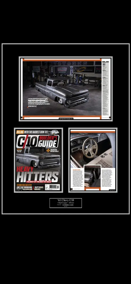 The drive train alone from Nelson Racing Engines is more than 2/3 the value by itself (specs below). That along with the full ACME stage IV frame with every option (specs below) alone covers the full price of what I am selling my 61 C/10 short bed big back window for.Nothing has been left untouched on this build from the custom sheet metal work by Bob Grant and Rocky Seeman to include but not limited to front and rear bumpers. Front fenders extended to line up with the bumpers custom radiator shroud hand built intercooler 2 inch chopped top. All Metal work is completely done bear latches Snowden seat custom dash with recessed defrost vents, push to start air conditioning controls, stereo air ride, controller window switches. Custom bed inside and out with a one off full skin with the body line brought around the back hidden hitch with air jump ports and battery tender. Custom bead rolled panels under the hood and inside the bed and many more items. Cover truck in C10 Builders magazine and featured in Street Trucks magazine and winner of many awards to include best under construction at shows to include but not limited to Battle in Bama, Last Resort and LST - Lone Star Throwdown. Truck does not run needs to be wired and plumbed, the transmission tunnel modified and final assembly. Parts list to include but not limited to