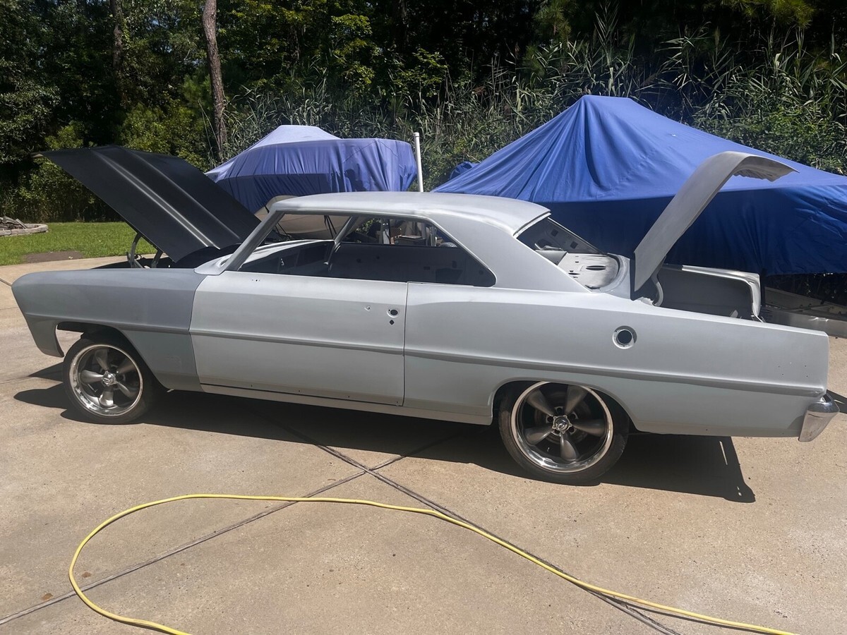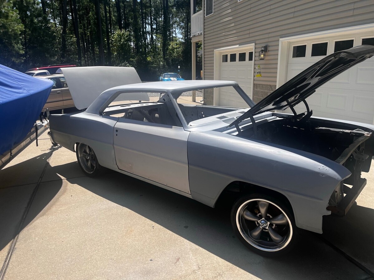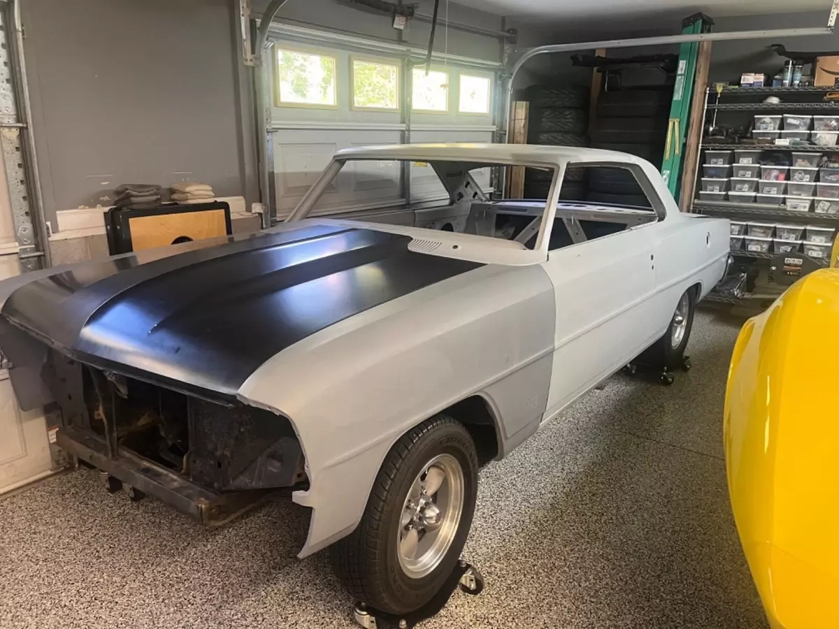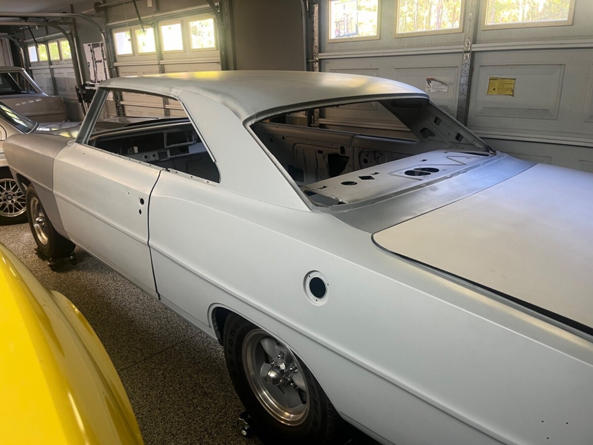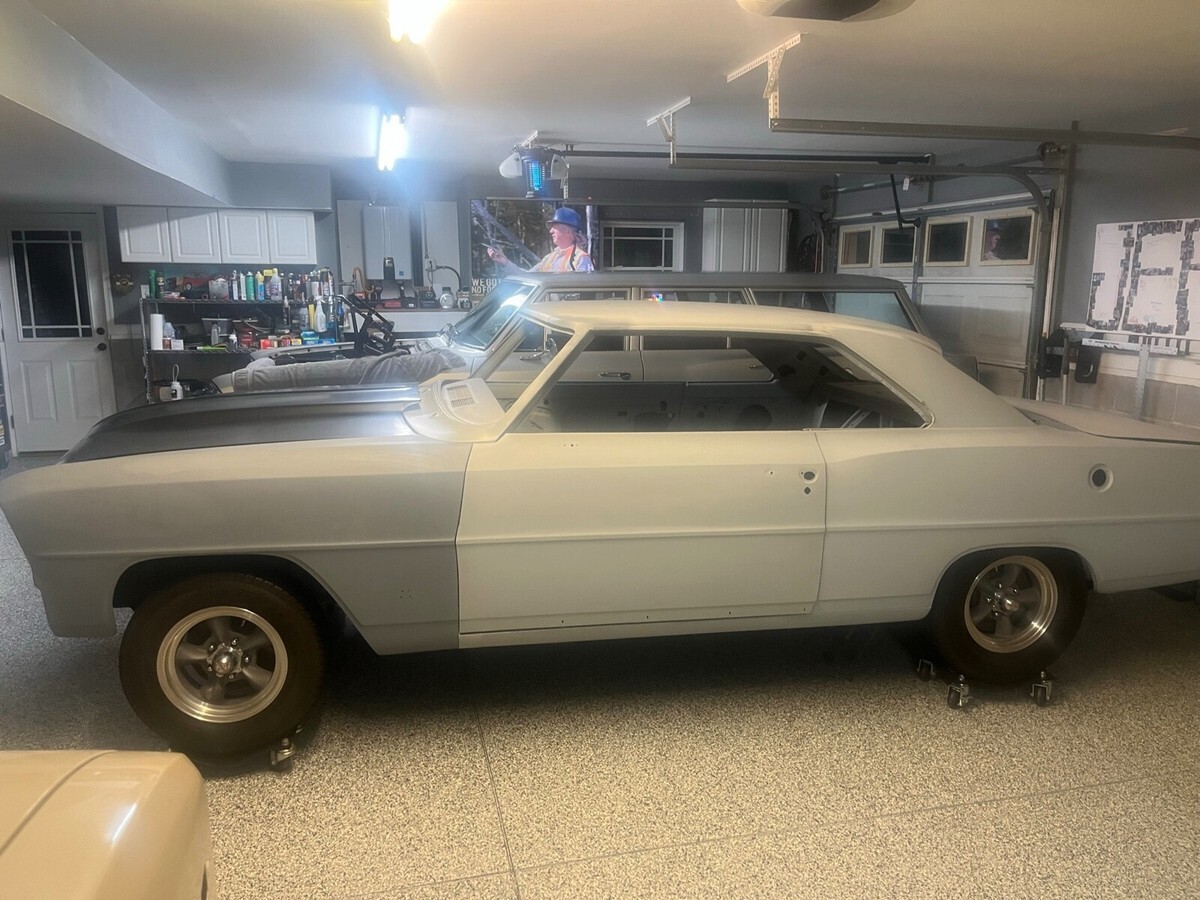 This car was in a restoration shop for a few years ..118 Chevy Nova setup for a 4 speed manual . Body stripped primed and sealed ...the underside painted black ...original front frame is in original condition...Original quarters, floor and doors ...small replacement in the trunk floor, butt welded and done right....tons of parts included, a few missing pieces due to long term storage ...all SS trim included, bucket seat, new gas tank and lots of other new parts. Great solid project car that is hard to find without patches and panel replacements... original power disc brake car.. comes with original hood and AMD cowl hood ...Comes with Coy Wheels in fair shape ..Trades considered ...email me with questions or leave me a number to call.