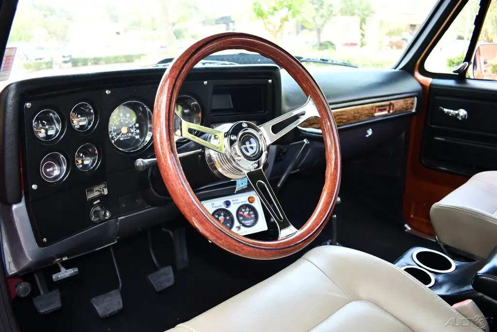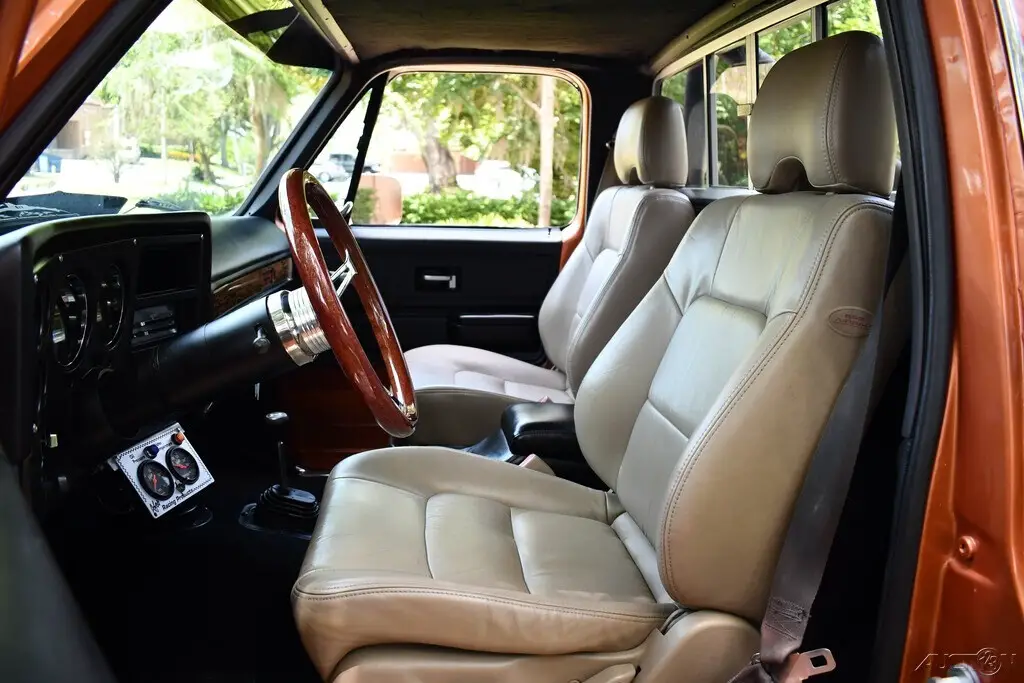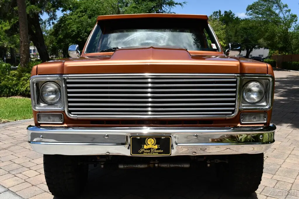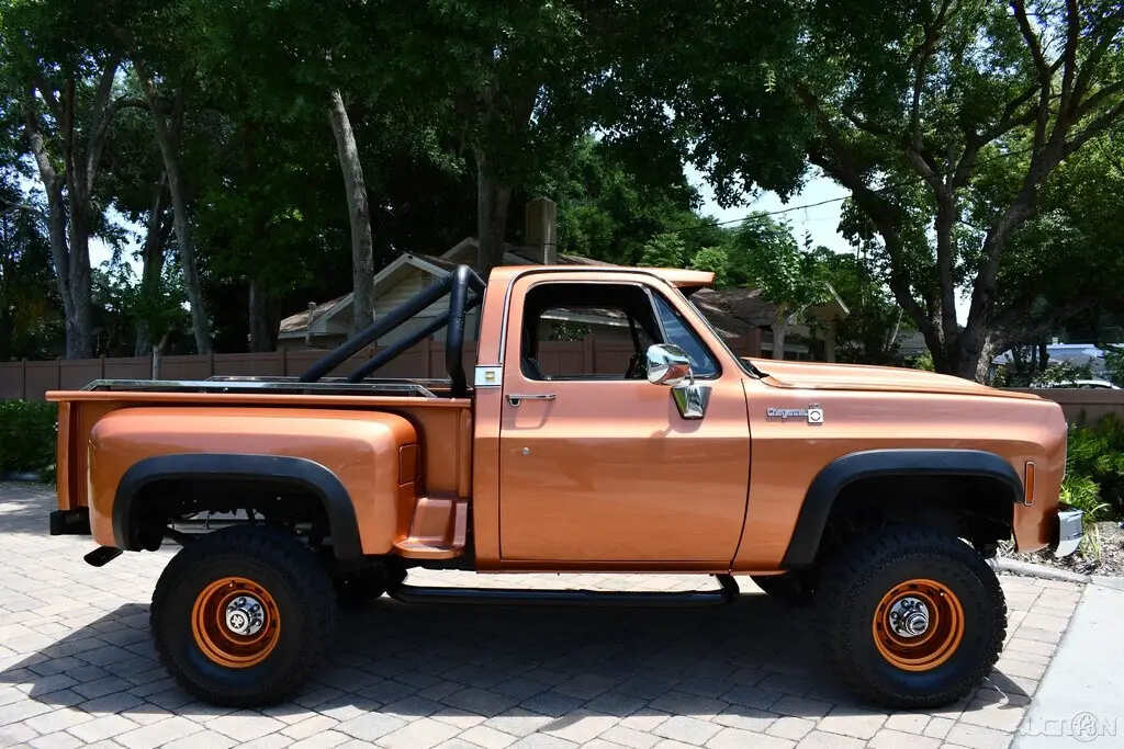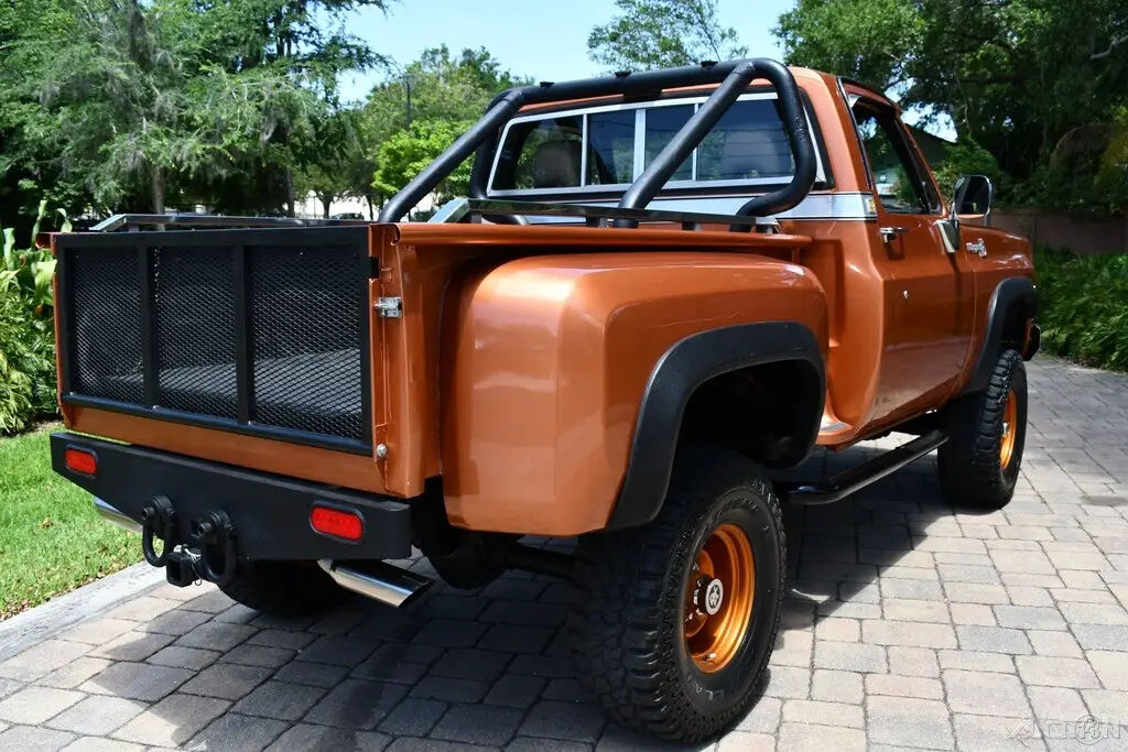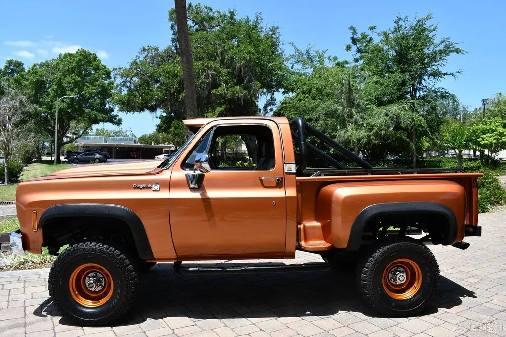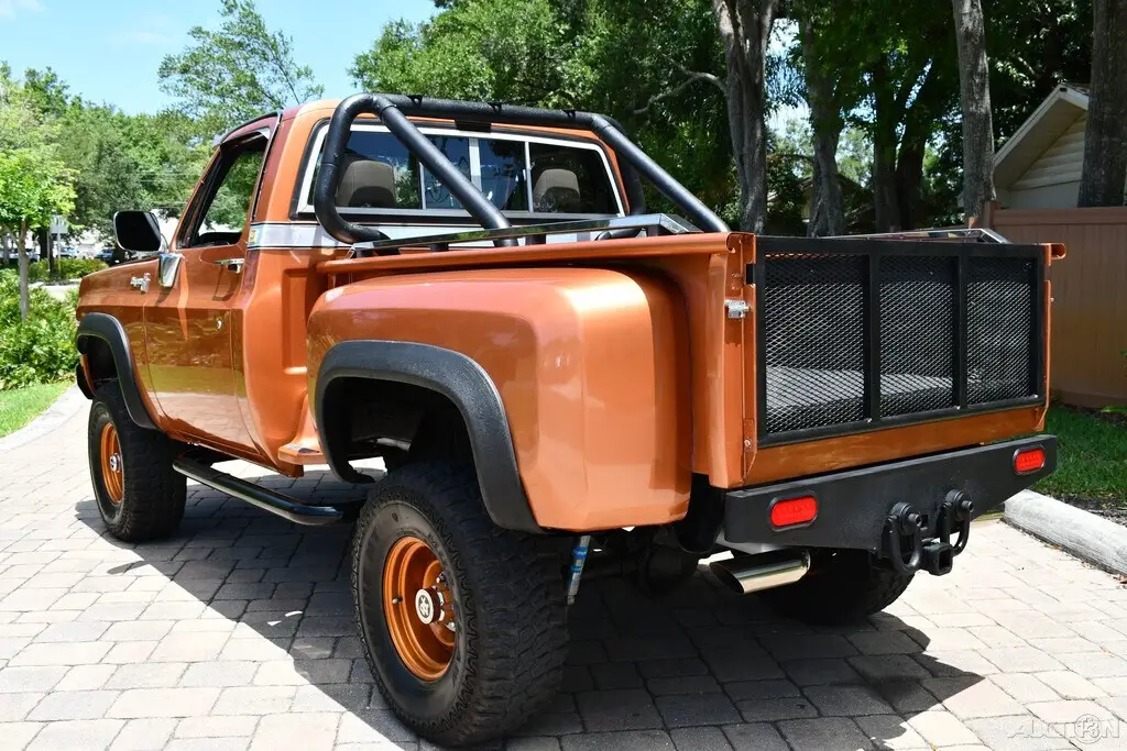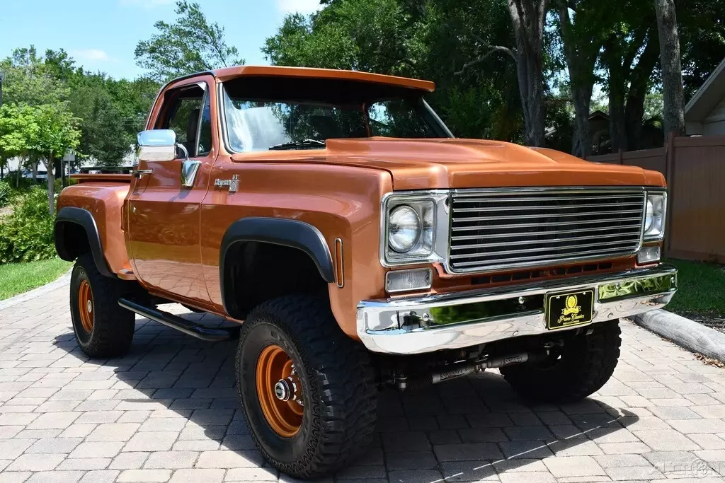 Remarkable 1976 Chevrolet K10 Step Side 355ci V8 Engine Manual Transmission Holley Carburetor Aluminum Radiator Orange Exterior with Black Flares Cowl Hood Roll Bar Power Steering Power Brakes &#