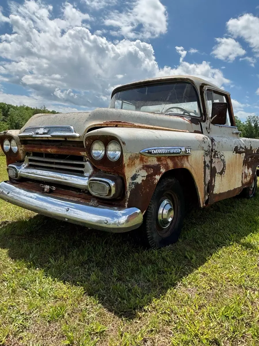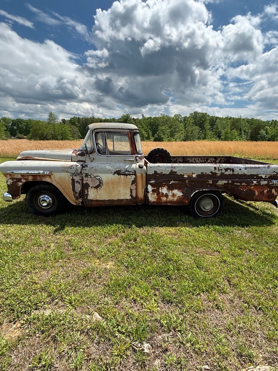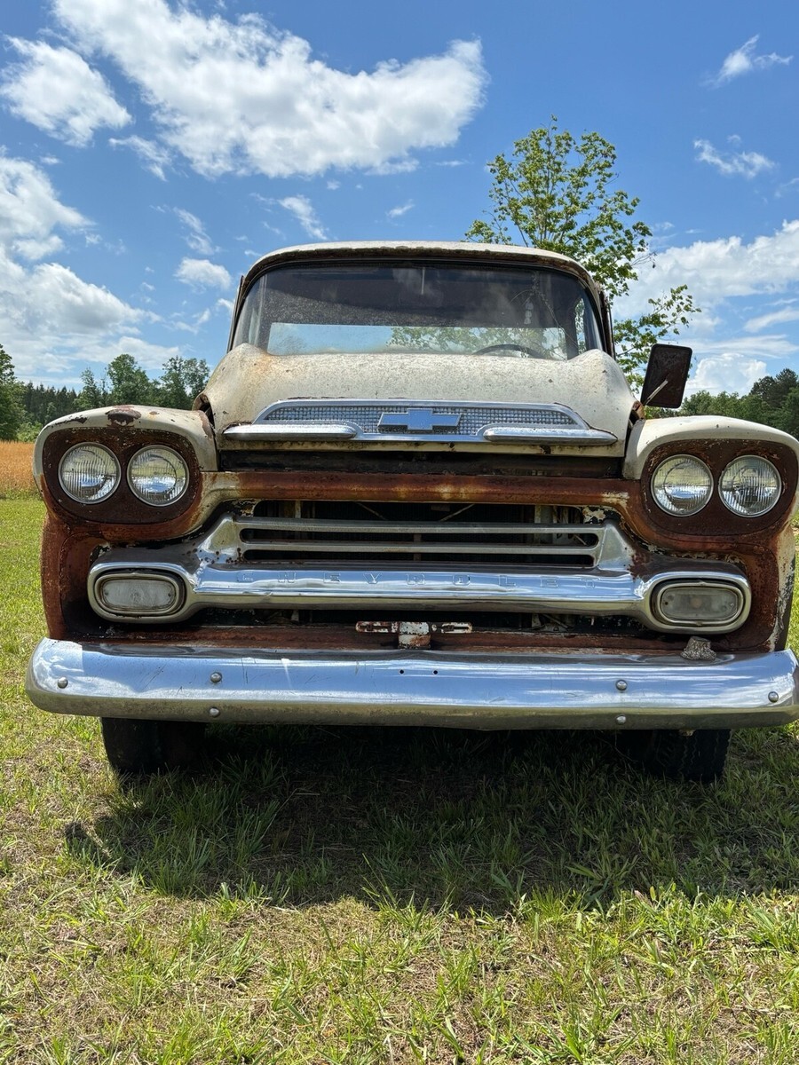 Great project. 1959 Chevy truck Apache big back window, Apache 32 fleet side. This is a double deluxe option that replaced the cameo option. This option was only available in 1959 for a short period of time. This truck has a 235 6 cylinder engine with a 3 speed manual on the column. Last state inspection was 1984. This truck rolls freely and steers. Truck has its body tag and vin number still attached. This truck will come with a bill of sale. No title but should be easy to obtain. Truck will need a full restoration unless you are looking for a rusty patina look. Truck has rust over the passenger side sun visor and will need repaired. Both doors need attention. Bed floor is solid. Front core support and hood look good. Fenders need attention. Interior is complete except the radio. Frame is solid. I have not tried to start it. A lot of good parts and pieces here. Truck also comes with a napco 4x4 conversion. Included are the Rockwell divorced transfer case, 1 driveshaft from trans to t-case and the front Dana 44 closed knuckle front axle. Turn this into a 4x4 like napco did if you choose or leave it original 2wd. Please see pictures for details. I can assist with helping load the truck up if needed. Truck can stay here for 30 days after sale ends for pick up arrangements if needed. Truck is located and can be picked up in southern va mecklenburg/halifax county line. Please ask any questions you have or schedule a time to see it in person. Thanks for looking. Payment can be made in person cash or wire transfer.