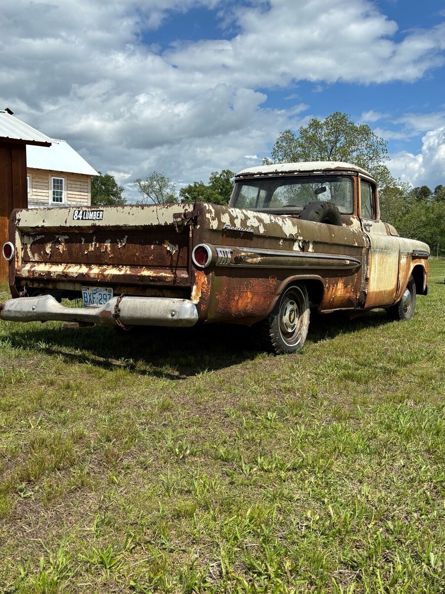 Great project. 1959 Chevy truck Apache big back window, Apache 32 fleet side. This is a double deluxe option that replaced the cameo option. This option was only available in 1959 for a short period of time. This truck has a 235 6 cylinder engine with a 3 speed manual on the column. Last state inspection was 1984. This truck rolls freely and steers. Truck has its body tag and vin number still attached. This truck will come with a bill of sale. No title but should be easy to obtain. Truck will need a full restoration unless you are looking for a rusty patina look. Truck has rust over the passenger side sun visor and will need repaired. Both doors need attention. Bed floor is solid. Front core support and hood look good. Fenders need attention. Interior is complete except the radio. Frame is solid. I have not tried to start it. A lot of good parts and pieces here. Truck also comes with a napco 4x4 conversion. Included are the Rockwell divorced transfer case, 1 driveshaft from trans to t-case and the front Dana 44 closed knuckle front axle. Turn this into a 4x4 like napco did if you choose or leave it original 2wd. Please see pictures for details. I can assist with helping load the truck up if needed. Truck can stay here for 30 days after sale ends for pick up arrangements if needed. Truck is located and can be picked up in southern va mecklenburg/halifax county line. Please ask any questions you have or schedule a time to see it in person. Thanks for looking. Payment can be made in person cash or wire transfer. Buy it now of 2500.00 or offer.