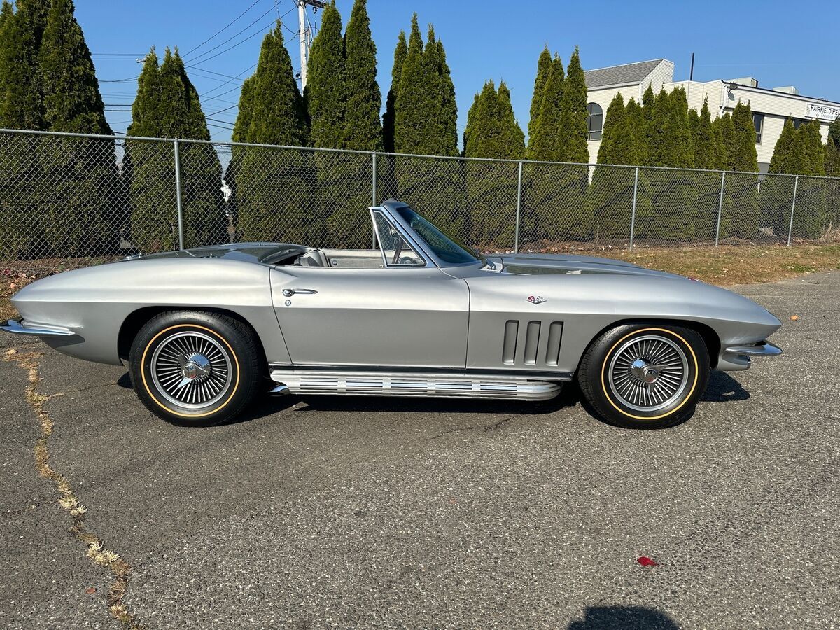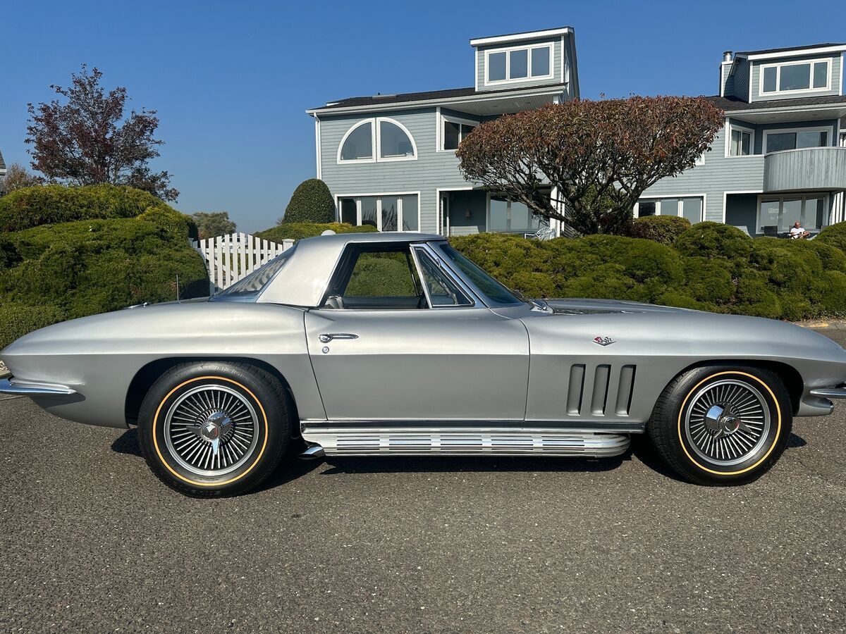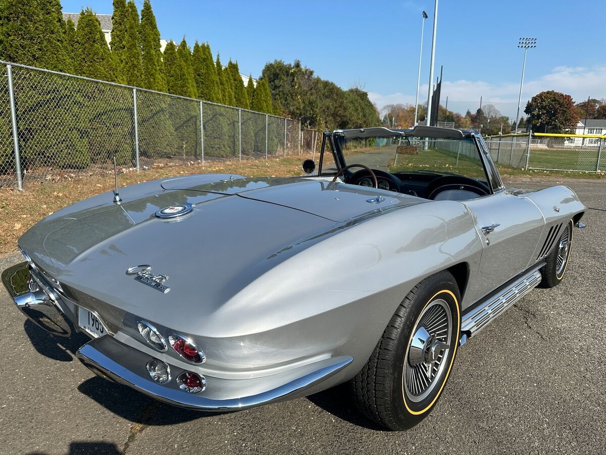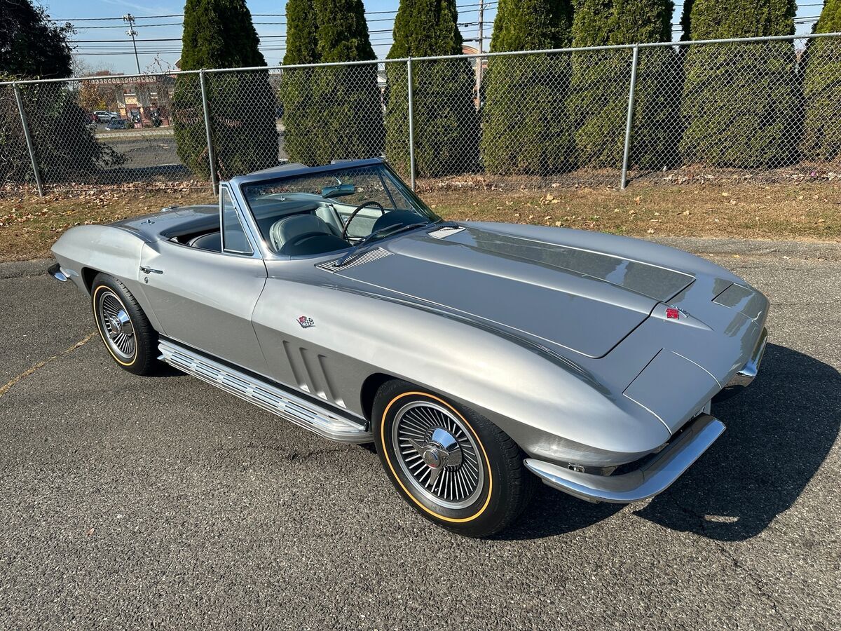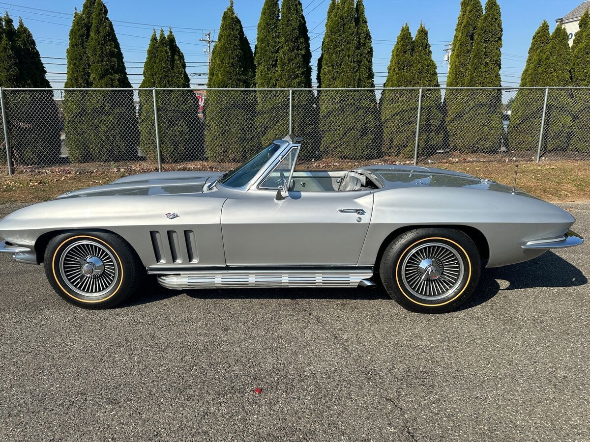 1965 CHEVROLET CORVETTE L-76 - 327/365 H.P. V8 - 4/SPEED 2-TOPS - RARE ONLY 350 MADE YEAR: 1965 MAKE: CHEVROLET MODEL: CORVETTE BODY: CONVERTIBLE COLOR: SILVER PEARL TRIM: RARE SILVER ENGINE: 327CI /365HP L-76 V8 TRANS: 4/SPEED REAR: POSI TRACTION MILES: 16,125 (EXEMPT) SERIAL#: 194675S113906 OPTIONS L-76 327CI /365HP V8 *4/SPEED *HART TOP *SIDE EXHAUST *KNOCK-OFF WHEELS *GOLD-LINE RADIAL TIRES *POSI TRACTION SERIAL BREAK DOWN 1-CHEVROLET 94-CORVETTE 67-CONVERTIBLE 5-1965 S-ST LOUIS 113906-SEQ# BODY TAG MADE H31-BUILT 31ST OF AUGUST STYLE-65 467- 1965 CORVETTE CONVERTIBLE S4494-ST LOUIS PLANT# TRM 426BA. -SILVER. PAINT 900QQ-SILVER DRIVELINE ENGINE 3782870 FO3 IE HH 5113906 327/365HP TRANS 3851325 PO 327 REAR- 0D047 N7E1 POI POSI TRACTION RARITY L76 V8 - ONLY 21% MADE. SILVER PEARL PAINT ONLY 10% MADE. HARDTOP ONLY 3% MADE. SILVER INTERIOR -ONLY 350 MADE. SIDE EXHAUST ONLY 3% MADE COMMENTS THIS BEAUTIFUL 1965 CORVETTE WITH HIGH-PERFORMANCE CORRECT L-76 SOLID LIFTER 327/365HP V8 HOOKED MUNCIE 4/SPEED AND POSI TRACTION REAR. THE CAR WAS RESTORED APPROX 5 YEARS AGO. THE ENGINE WAS REBUILT WITH ONLY AROUND 2000 MILES ON IT. ORIGINAL BODY BONDING STRIPS. ORIGINAL FIBERGLASS FLOOR BOARDS. CAR PERFORMS AND HANDLES AMAZING. ALL FEATURES WORK OTHER THAN CLOCK.
