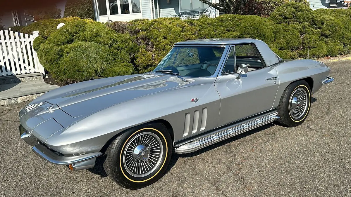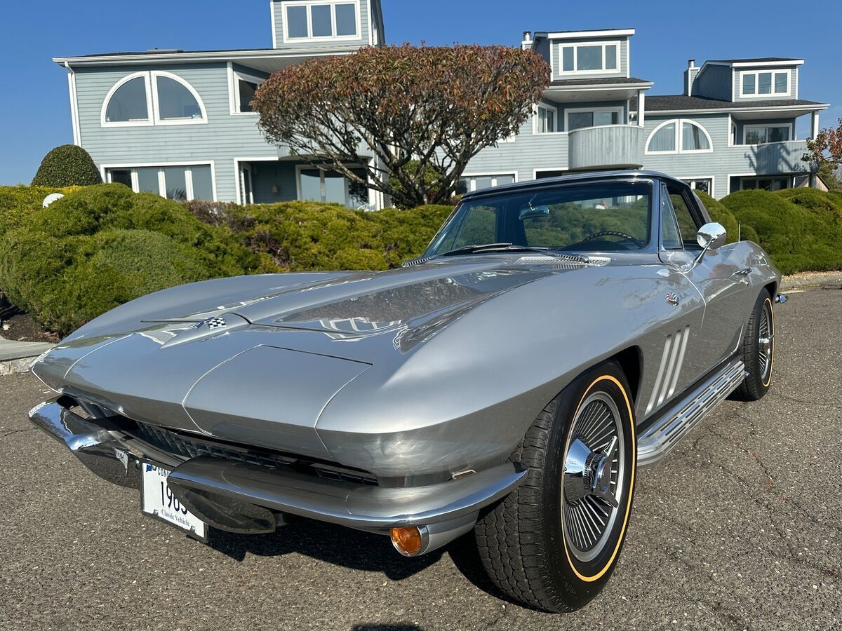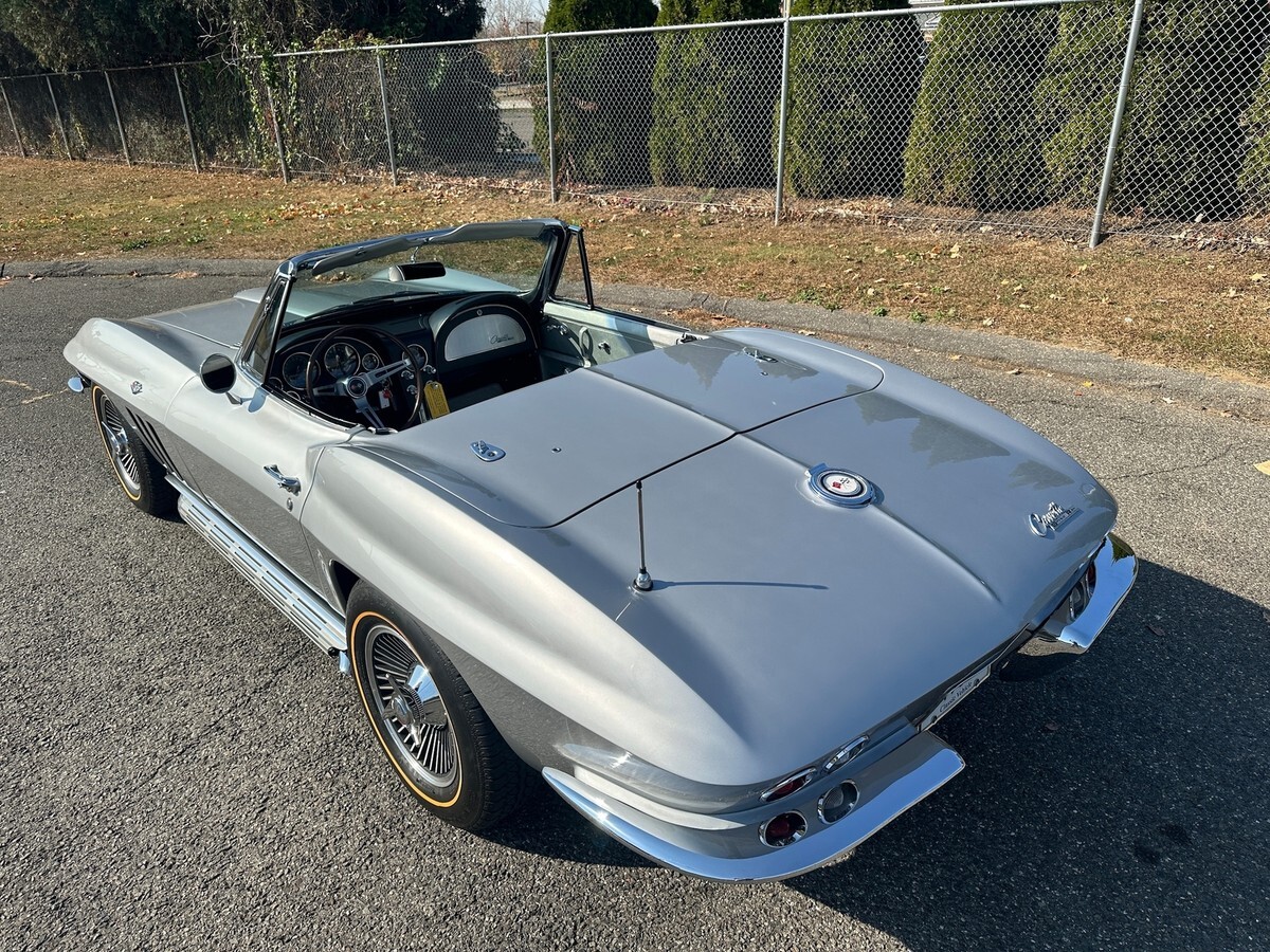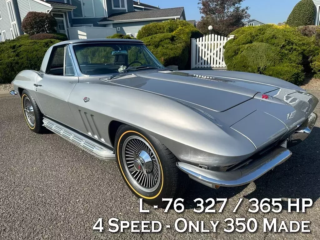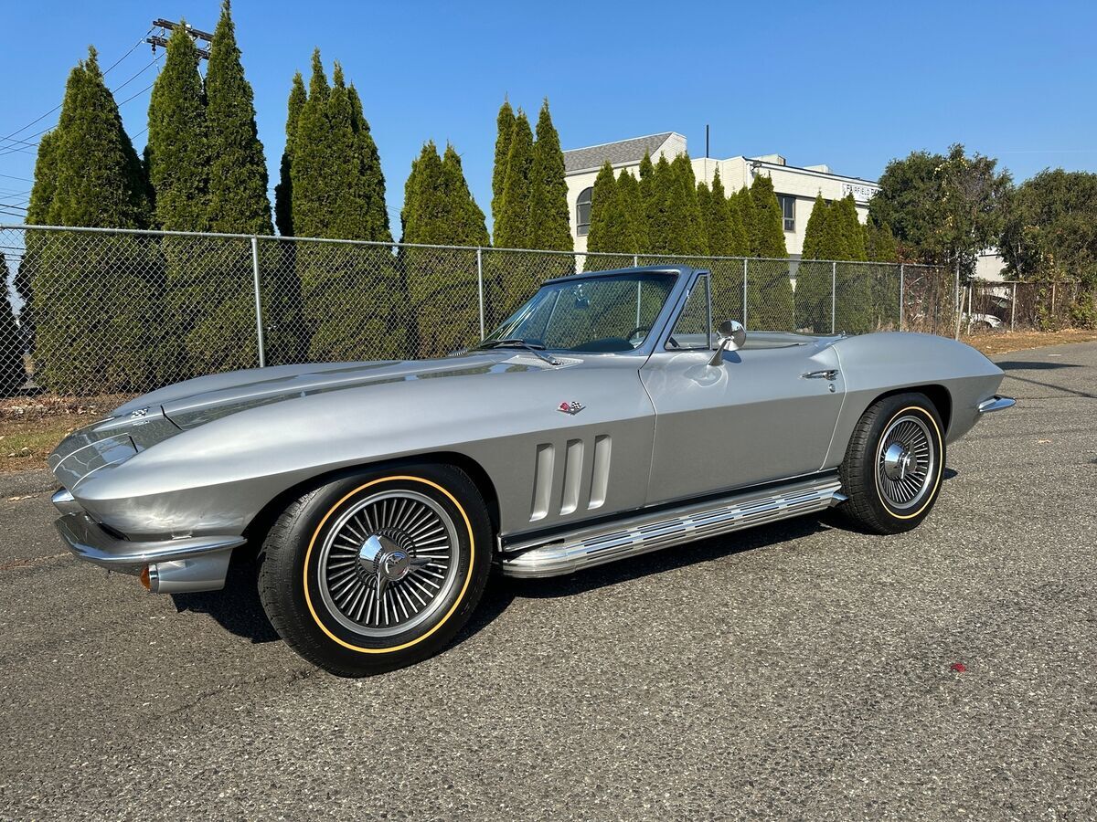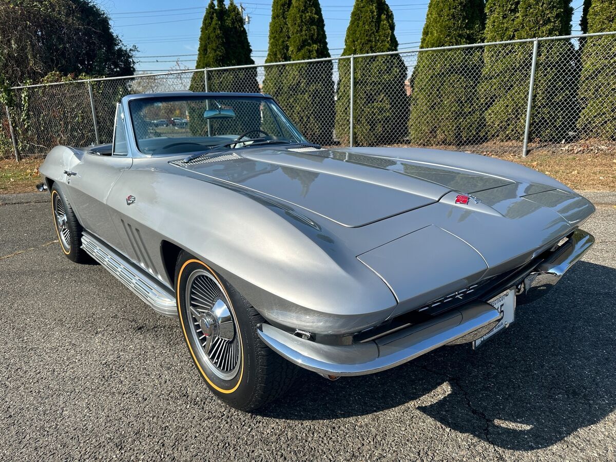1965 CHEVROLET CORVETTE L-76 - 327/365 H.P. V8 - 4/SPEED 2-TOPS - RARE ONLY 350 MADE YEAR: 1965 MAKE: CHEVROLET MODEL: CORVETTE BODY: CONVERTIBLE COLOR: SILVER PEARL TRIM: RARE SILVER ENGINE: 327CI /365HP L-76 V8 TRANS: 4/SPEED REAR: POSI TRACTION MILES: 16,125 (EXEMPT) SERIAL#: 194675S113906 OPTIONS L-76 327CI /365HP V8 *4/SPEED *HART TOP *SIDE EXHAUST *KNOCK-OFF WHEELS *GOLD-LINE RADIAL TIRES *POSI TRACTION SERIAL BREAK DOWN 1-CHEVROLET 94-CORVETTE 67-CONVERTIBLE 5-1965 S-ST LOUIS 113906-SEQ# BODY TAG MADE H31-BUILT 31ST OF AUGUST STYLE-65 467- 1965 CORVETTE CONVERTIBLE S4494-ST LOUIS PLANT# TRM 426BA. -SILVER. PAINT 900QQ-SILVER DRIVELINE ENGINE 3782870 FO3 IE HH 5113906 327/365HP TRANS 3851325 PO 327 REAR- 0D047 N7E1 POI POSI TRACTION RARITY L76 V8 - ONLY 21% MADE. SILVER PEARL PAINT ONLY 10% MADE. HARDTOP ONLY 3% MADE. SILVER INTERIOR -ONLY 350 MADE. SIDE EXHAUST ONLY 3% MADE COMMENTS THIS BEAUTIFUL 1965 CORVETTE WITH HIGH-PERFORMANCE CORRECT L-76 SOLID LIFTER 327/365HP V8 HOOKED MUNCIE 4/SPEED AND POSI TRACTION REAR. THE CAR WAS RESTORED APPROX 5 YEARS AGO. THE ENGINE WAS REBUILT WITH ONLY AROUND 2000 MILES ON IT. ORIGINAL BODY BONDING STRIPS. ORIGINAL FIBERGLASS FLOOR BOARDS. CAR PERFORMS AND HANDLES AMAZING. ALL FEATURES WORK OTHER THAN CLOCK.
