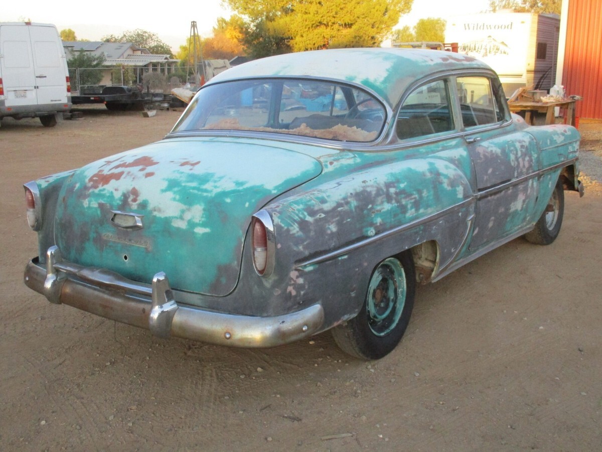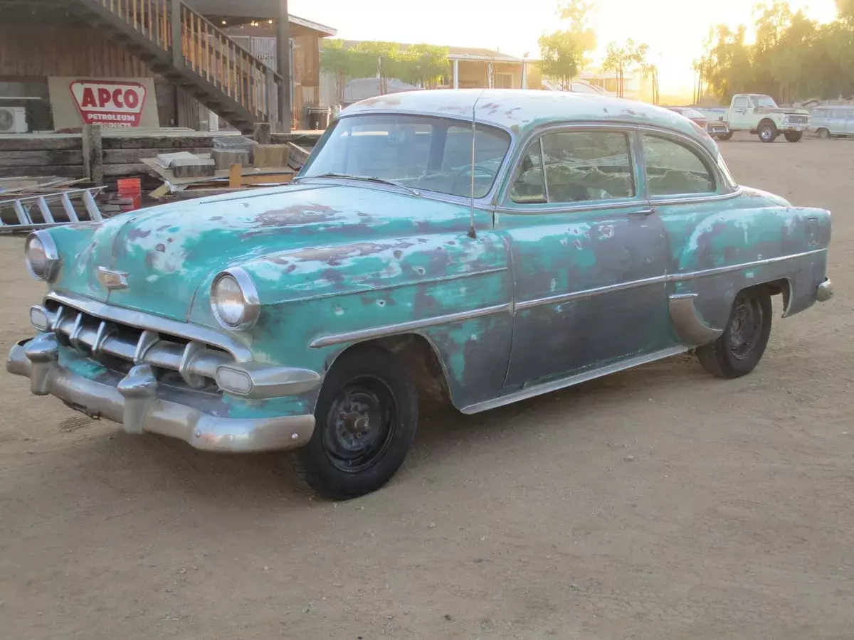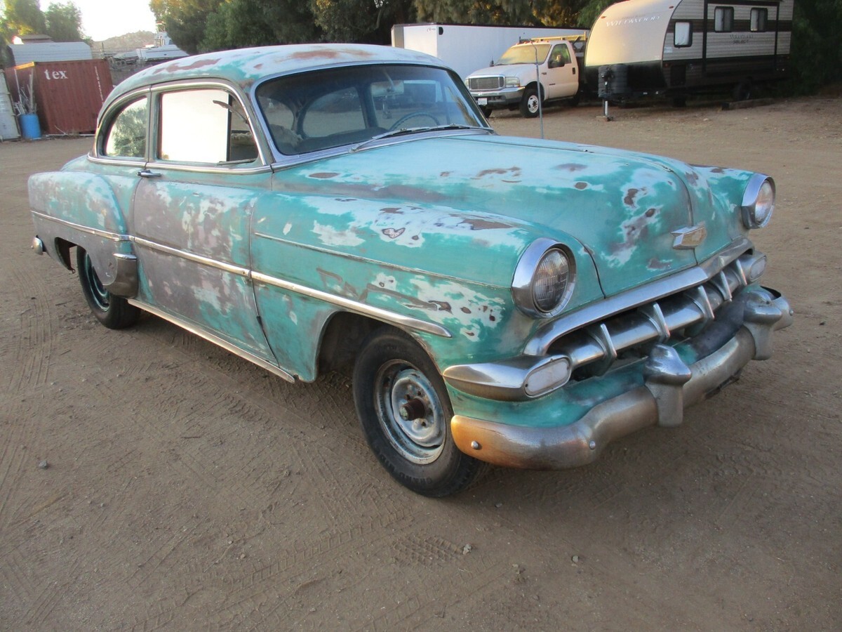 Garage Classics is proud to offer you a1954 Chevrolet 210 sedan.I have a current California Title(pink slip)1 year body style 2 door model.I am happy to answer any questions over the phone.714 364 7320Happy to send as many pictures as you need..Cowl #s are as follows...Body # VN 699Style 54 1011WATrim 333 (light Green)Paint code 555 (two tone India Ivory and Surf Green)TOP ACCEZ1Engine looks to be the original 235 ( I have not confirmed this)with a manual trans (column shift).Engine Cylinder head and pan were removed decades ago so engine will need to be removed and rebuilt.Condition of transmission is unknown. Car rolls easily.BodyBody panels are excellent.Only very minor dings and dents.There is a little filler in some areas but nothing major(mostly on passenger door).The body, floor and trunk are very solid.I don't see any rust holes in the floor.Roof has a fist dent on the driver side.Drip rail area is solid, No rust.Quarters are solid with not rust holes or repair.This car is super solid.Hood and trunk look great with no rust issues or repairs.Hood, trunk and Doors open and shut nicely and hinges are tight.I believe it was repainted a darker green over the original Surf Green paint.Hood is missing the ornament.Bumpers are pretty straight and both have the cool bumper guards.Odometer shows 80000 miles.All the glass is in good condition with the exception of the driver side vent window that has discoloration.The passenger side vent window is missing and the vent frame is broken from the door frame.The windshield has a little discoloration on the edges but is in pretty good condition.There are 2 dents on the passenger side window trim but the rest of the upper stainless is very good.The lower stainless trim most of which is present, has the typical dings and dents.There are no keys.The steering center link was detached so I installed two bolts so we could move it around.Car rolls easily.I will be happy to provide any additional info or pictures.Just send me a text or call.Craig 714 364 7320Overall this is a very solid straight car that would make a great builder for a LS swap, Gasser or restore to original.They look incredible when restomodedCar was a stored in the high dry desert for more than 30 years.I have a current California title in my name.We require a Non Refundable $1000 deposit and full payment within 7 days.We can store the car for up to 30 days.Give us a call if you need any additional information.714 364 7320 CraigCheck out our Garage Classics store for more parts! Track Page Views WithAuctiva's Counter