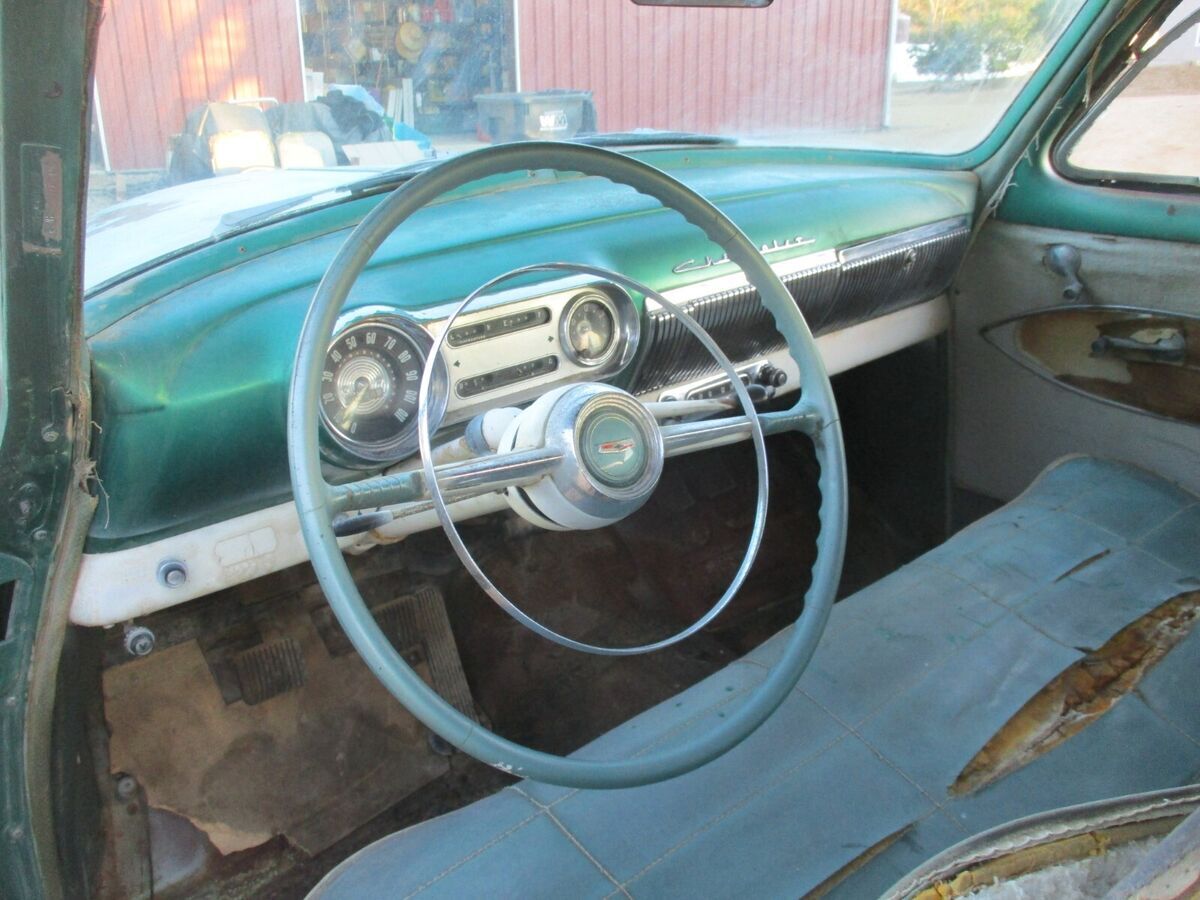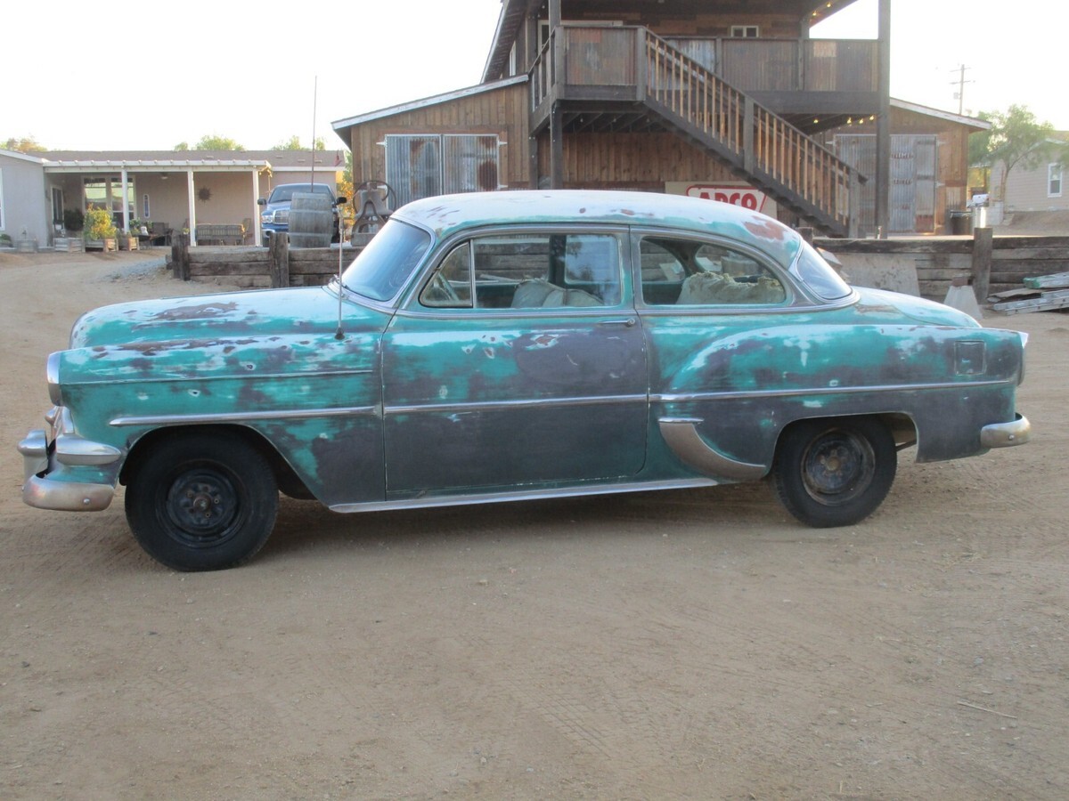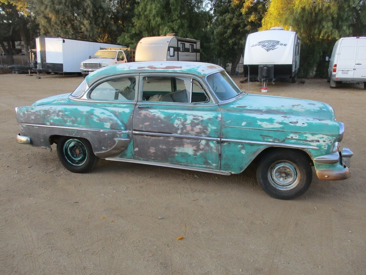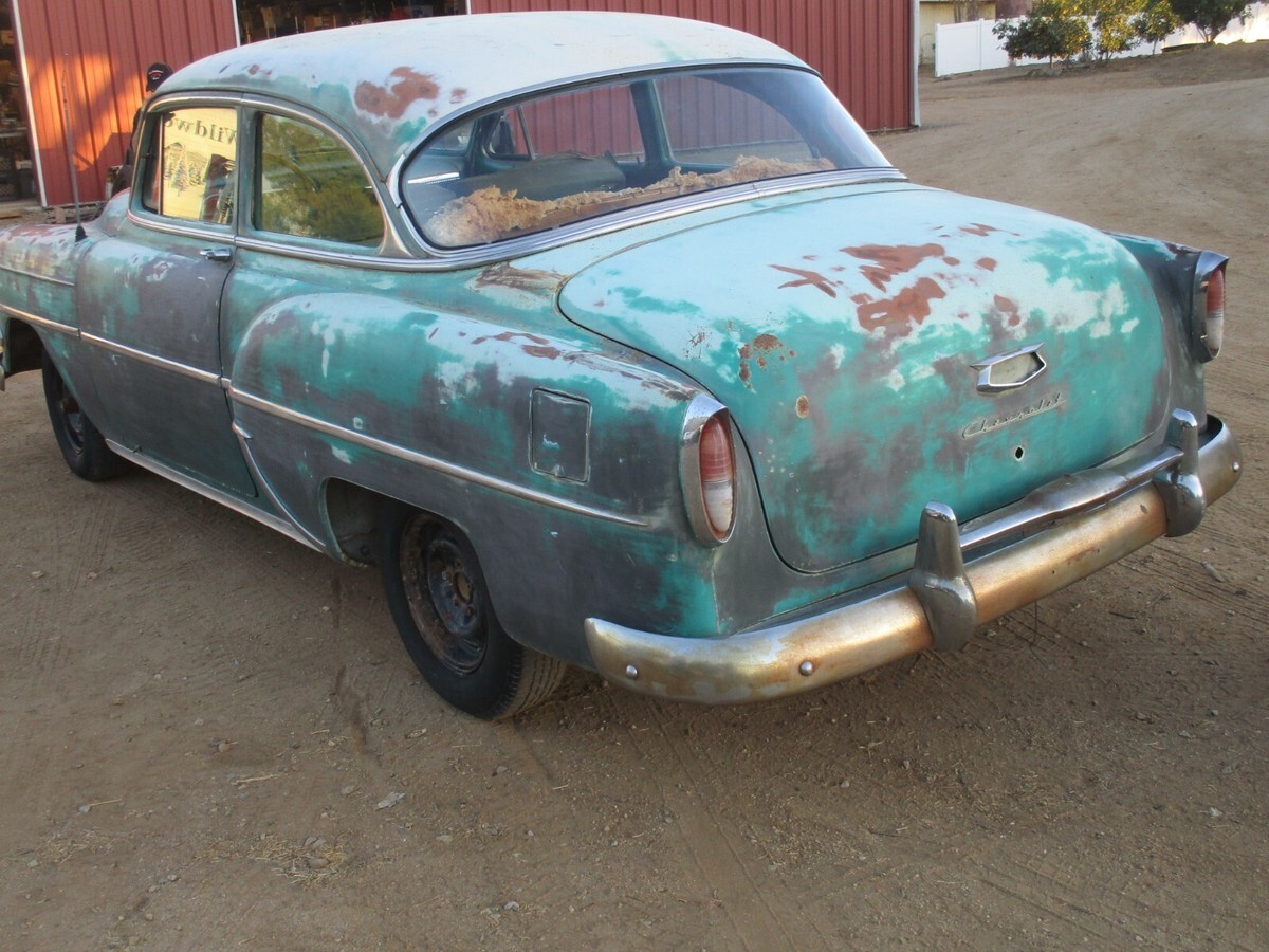 Garage Classics is proud to offer you a1954 Chevrolet 210 sedan.I have a current California Title(pink slip)1 year body style 2 door model.I am happy to answer any questions over the phone.714 364 7320Happy to send as many pictures as you need..Cowl #s are as follows...Body # VN 699Style 54 1011WATrim 333 (light Green)Paint code 555 (two tone India Ivory and Surf Green)TOP ACCEZ1Engine looks to be the original 235 ( I have not confirmed this)with a manual trans (column shift).Engine Cylinder head and pan were removed decades ago so engine will need to be removed and rebuilt.Condition of transmission is unknown. Car rolls easily.BodyBody panels are excellent.Only very minor dings and dents.There is a little filler in some areas but nothing major(mostly on passenger door).The body, floor and trunk are very solid.I don't see any rust holes in the floor.Roof has a fist dent on the driver side.Drip rail area is solid, No rust.Quarters are solid with not rust holes or repair.This car is super solid.Hood and trunk look great with no rust issues or repairs.Hood, trunk and Doors open and shut nicely and hinges are tight.I believe it was repainted a darker green over the original Surf Green paint.Hood is missing the ornament.Bumpers are pretty straight and both have the cool bumper guards.Odometer shows 80000 miles.All the glass is in good condition with the exception of the driver side vent window that has discoloration.The passenger side vent window is missing and the vent frame is broken from the door frame.The windshield has a little discoloration on the edges but is in pretty good condition.There are 2 dents on the passenger side window trim but the rest of the upper stainless is very good.The lower stainless trim most of which is present, has the typical dings and dents.There are no keys.The steering center link was detached so I installed two bolts so we could move it around.Car rolls easily.I will be happy to provide any additional info or pictures.Just send me a text or call.Craig 714 364 7320Overall this is a very solid straight car that would make a great builder for a LS swap, Gasser or restore to original.They look incredible when restomodedCar was a stored in the high dry desert for more than 30 years.I have a current California title in my name.We require a Non Refundable $1000 deposit and full payment within 7 days.We can store the car for up to 30 days.Give us a call if you need any additional information.714 364 7320 CraigCheck out our Garage Classics store for more parts! Track Page Views WithAuctiva's Counter