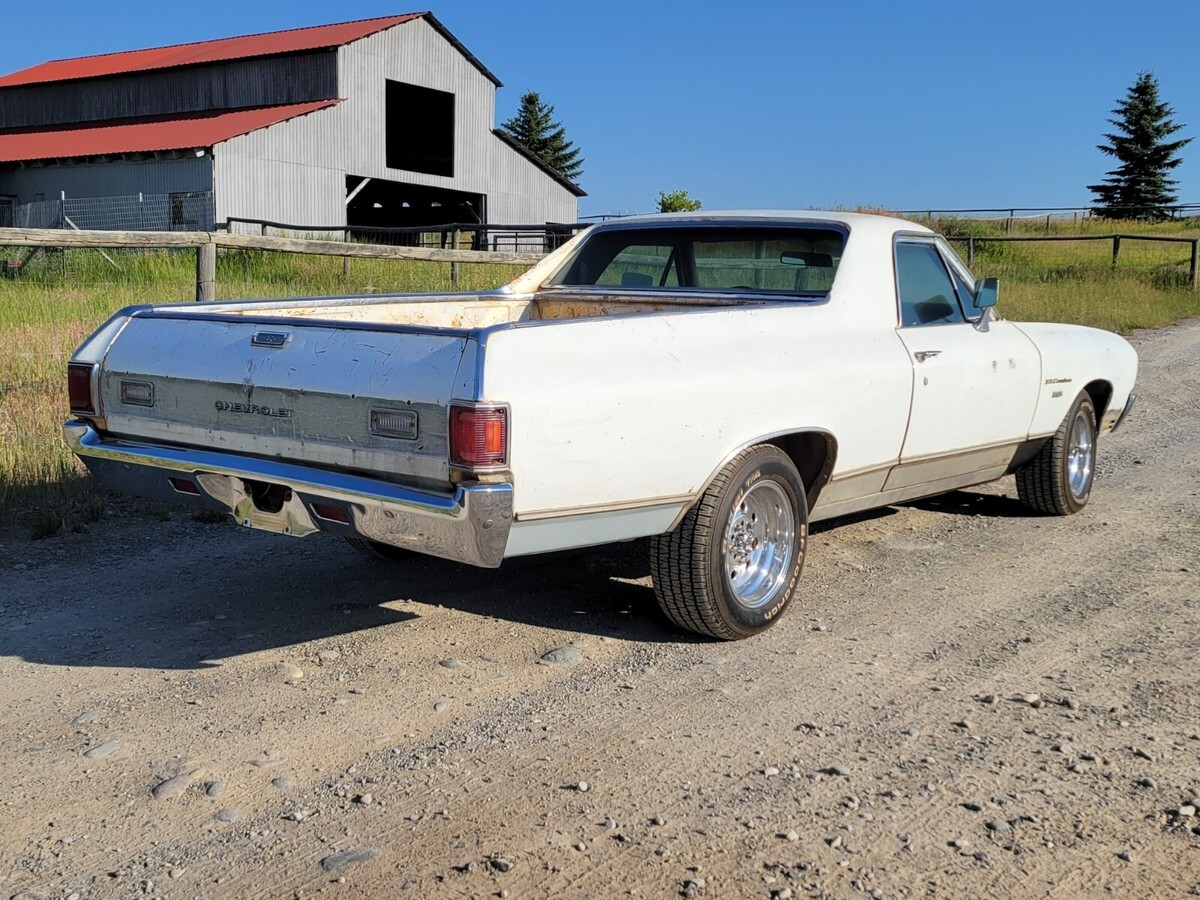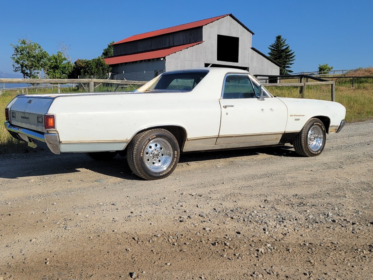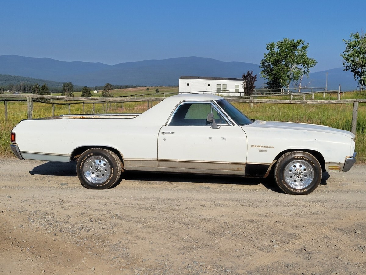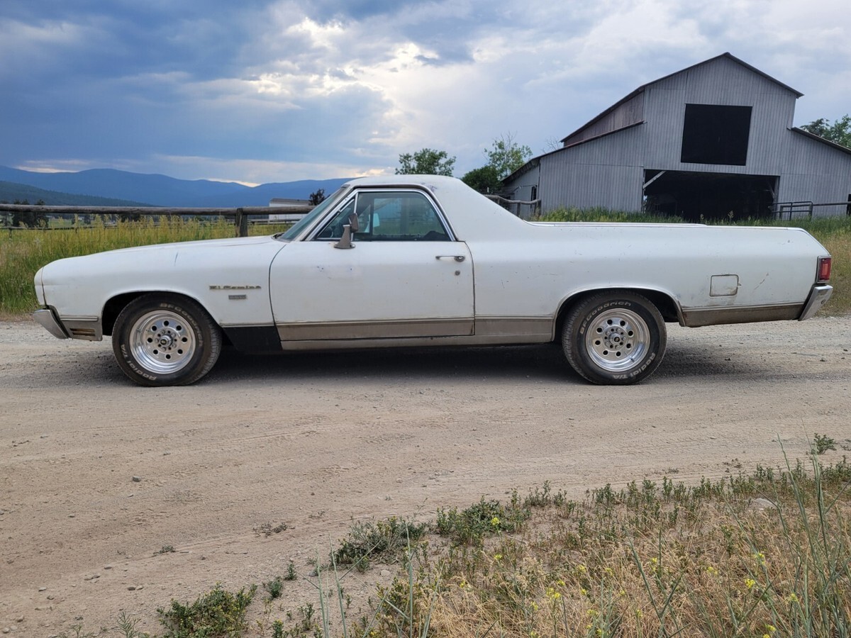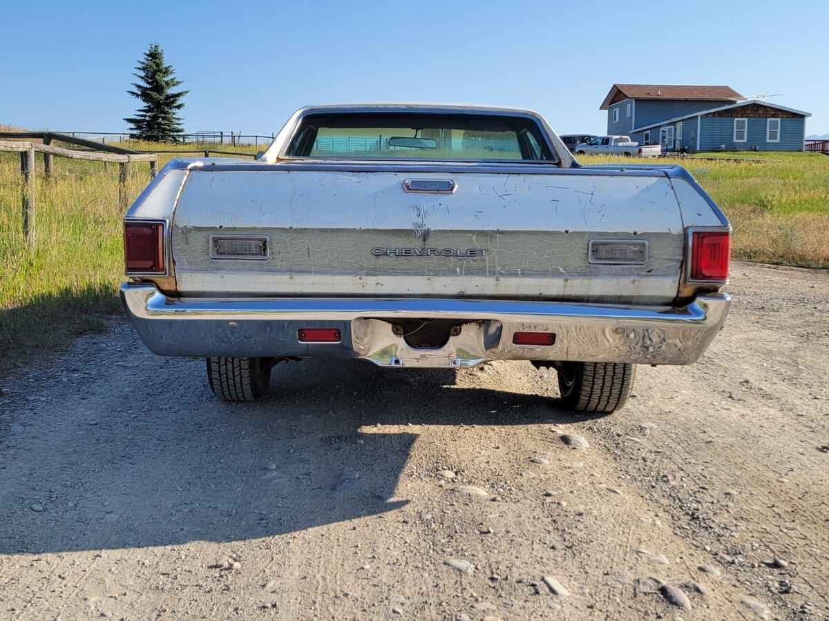 The El Camino has the 350 small block V8, with turbo 350 automatic transmission. The engine runs nice. It does not smoke, tick or knock. There are no leaks of concern. It does have the usual old-car seepage from gaskets, but nothing I feel needs replaced. The engine has good oil pressure and does not overheat or anything abnormal. The oil looks fine. There is no water in the oil, or oil in the water. This has the 2-barrel carburetor. The engine runs nice and smooth, but I would recommend some of the usual tune-up stuff since it hasn't been a daily driver for years. I'd change the fluids, filters, belts and hoses. Basic stuff like that. The aluminum wheels in the pics aren't included. I just borrowed those from another car to see how they'd look. It comes with old turbine-style wheels. It does need new tires. The brake light is on. I'm not sure why and I haven't checked it out. The headlights, taillights, and turn signals work. It has dual exhaust that comes out by the rear axle. It sounds ok, but needs tailpipes. The rear axle is a 10-bolt. The transmission works fine. All gears work fine and there is no slipping or anything abnormal. The car doesn't need much to be a daily driver.