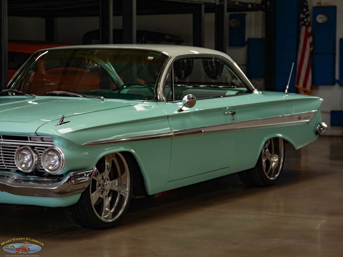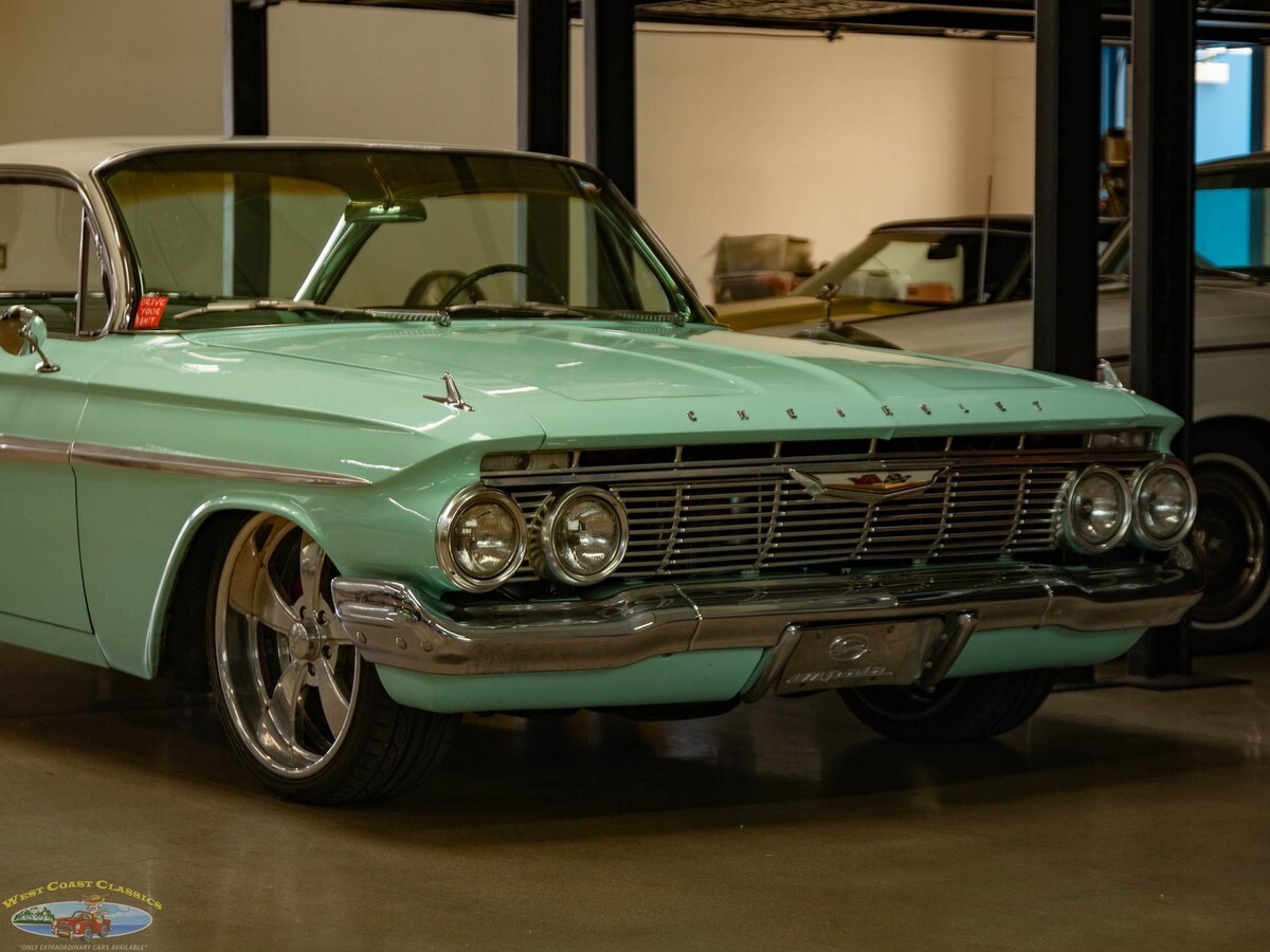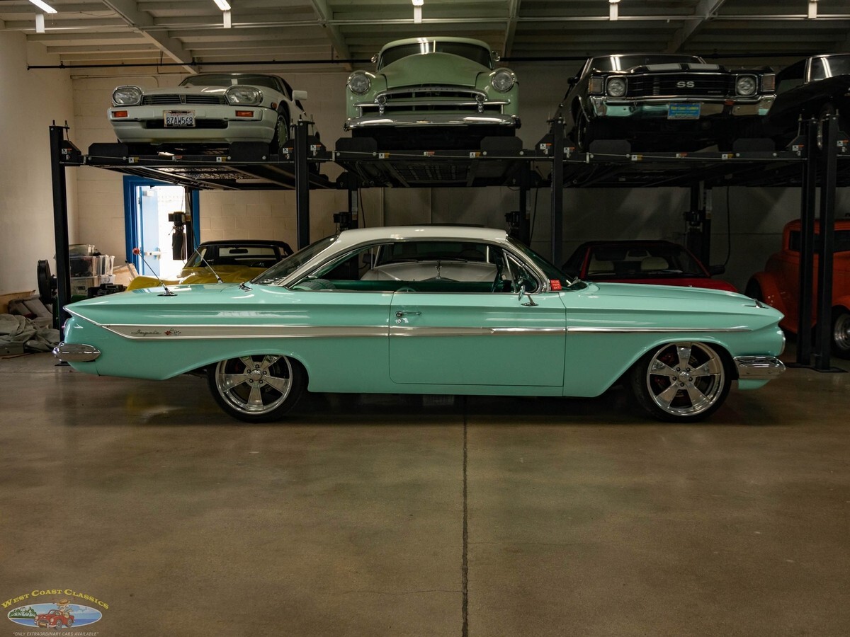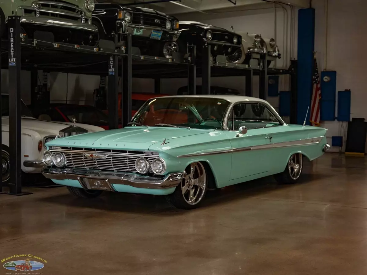 West Coast Classics presents are proud to present an exceptional example of this custom built 1961 Chevrolet Impala 2 door Coupe with a crate 350 V8 440HP V8 engine matched to a 700R4 4 speed automatic transmission with a shift kit & with 4 wheel disc brakes & striking chrome 'Foose' wheels. Please note we sold this car a few years back and since then the new owner installed a new digital dash cluster and a Holley Sniper Electronic Fuel Injection tank, A/C system with 2 custom A/C lines with R134, 700R4 Stage 2 rebuild kit with high energy W clutches, 10' Torque convertor 2600 stall, beast sun shell, electric window kit ($600), 2 way vents, coil over kit front & rear, ($21,192.49)Big brake kit front and rear ($1,995)Electronic modern upgrades:Installed Dakota Digital Instrumentation, dual antenas, seat belts, MDS EFI system, 'Champion' aluminum radiator & coolant fan & shroud, front & rear performance shocks, new EFI ready fuel tank with sending unit & pump, MSD digital box, MSD ready to run distributor & ignition, Edelbrock air cleaner. ($5,280)Sound System:Power Acoustic 1" tweeter, JBL 6.5 stadium 2 way speaker, JBL 6.9 stadium GTO 930, Sound Stream 1000.1, Nesa 2000.4 td-48, Pioneer 12 flat sw 1500 watts, 12" box 112 top port box, Blaupunk 4gage amp kit, alarm system ($1900). The car is finished in a stunning 'Solid Twilight Turquoise' over a 'White' hardtop color repaint with a new matching Turquoise stock looking interior and trim and the car already had a superb build with an all new drive shaft, U joints, belts, plugs, hoses, radiator, exhaust and with custom 'Stewart Warner' gauges before the upgrades were installed! The 1961 full-size Chevrolet model was totally revamped for the new year. As with all other full-size GM lines, the new cars finally finished with the knee-banger, wrap around windshields and tailfins and shed some of the length and width that had been popular in the prior three years. The front end sported a full width grille with dual headlamps mounted at each end with the turn signals and parking lamps mounted above the headlamps. The car boasted all the regular Bel Air equipment plus Nylon pattern cloth seats, electric clock, full carpeting and dual backup lights.The Impala was restyled on the existing GM B platform for 1961. The new body styling was more trim and boxy than the 1958-60 models. Sport Coupe models featured a 'bubbleback' roof line style for '61 and a unique model, the 2-door pillared sedan, was available for 1961 only. It was rarely ordered and a scarce collectible today. The rare Super Sport (SS) option debuted for 1961 and was retired in 1968. The 1962 model featured new 'C' pillar styling for all models except the 4-door hardtop 'Sport Sedan.' Sport Coupe models now featured the 'convertible roof' styling, shared with other GM 'B' full size hardtop coupes.This particular example is an obvious a fully customized car with no expense spared and yet still very stock looking and boasts a lot of its original equipment including the AM radio and with original floor boards and trunk and a very straight body. It has received a beautiful date correct 'Solid Twilight Turquoise' color repaint with an 'Ermine White' hardtop and has a matching interior trim and seats and rides on striking 'Foose' chrome wheels.We are including photos of the car both after the upgrades and before for your information.This car must be seen and driven to be fully appreciated - the engine is extremely strong and responsive, the transmission shifts smoothly through the gears and the engine temperature always remains cool. The car's re-paint is of a very high quality and in very fine shape and the car has very few flaws.In summary, this is a wonderful example of a very striking 1961 Chevrolet Impala 2 Door Hardtop coupe muscle car in turn-key ready daily driving and daily head-turning condition, most definitely one very collectible and attractive example of an early sixties full-size classic all American muscle car!
