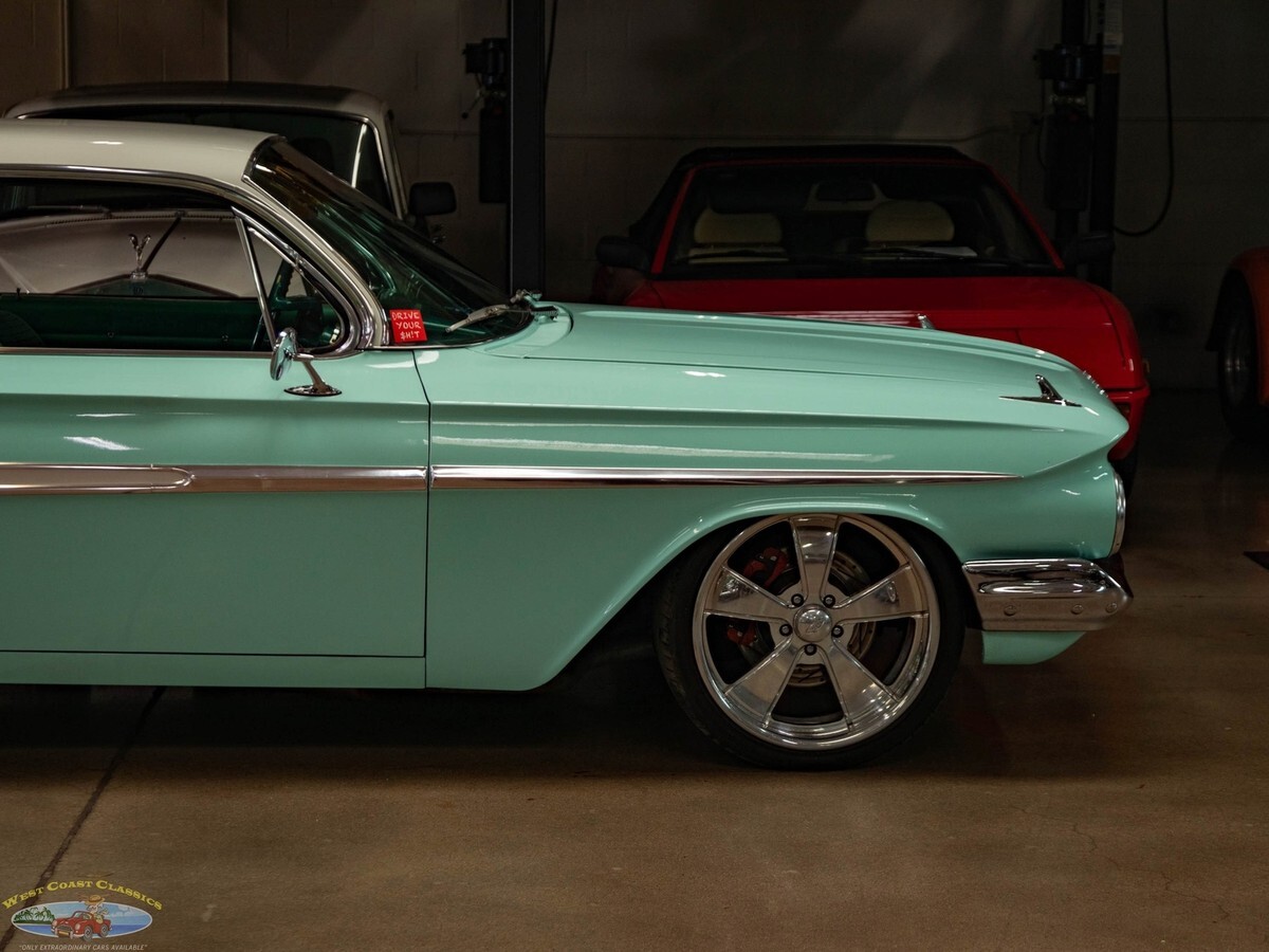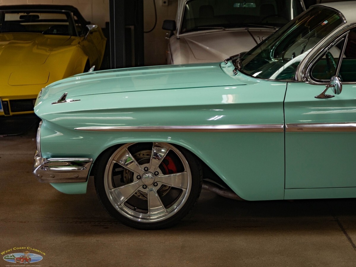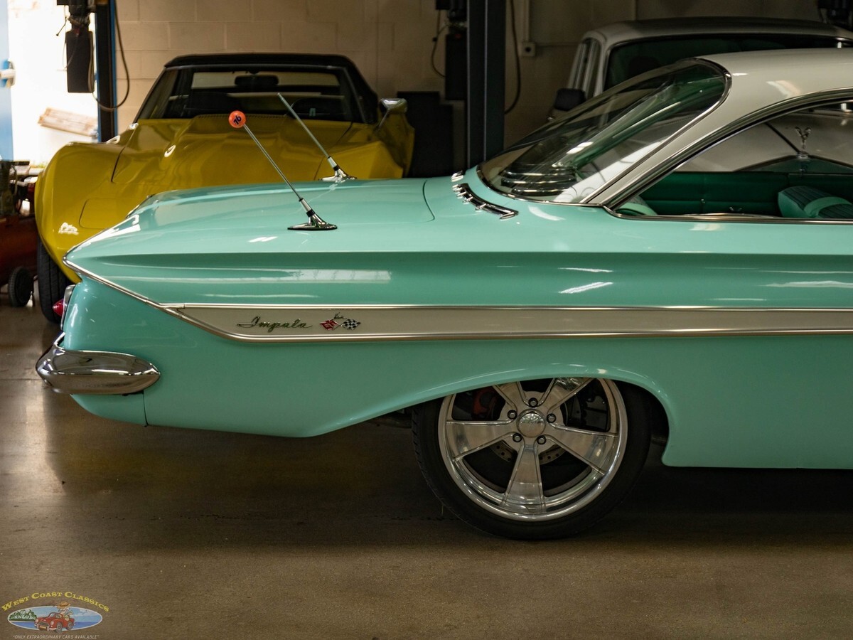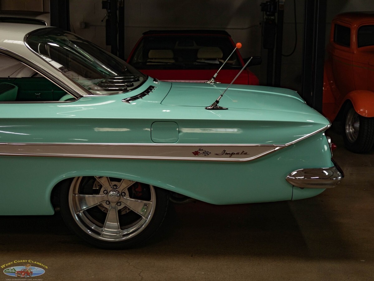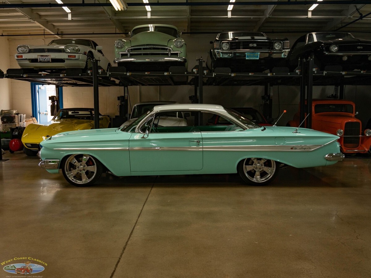 West Coast Classics presents are proud to present an exceptional example of this custom built 1961 Chevrolet Impala 2 door Coupe with a crate 350 V8 440HP V8 engine matched to a 700R4 4 speed automatic transmission with a shift kit & with 4 wheel disc brakes & striking chrome 'Foose' wheels. Please note we sold this car a few years back and since then the new owner installed a new digital dash cluster and a Holley Sniper Electronic Fuel Injection tank, A/C system with 2 custom A/C lines with R134, 700R4 Stage 2 rebuild kit with high energy W clutches, 10' Torque convertor 2600 stall, beast sun shell, electric window kit ($600), 2 way vents, coil over kit front & rear, ($21,192.49)Big brake kit front and rear ($1,995)Electronic modern upgrades:Installed Dakota Digital Instrumentation, dual antenas, seat belts, MDS EFI system, 'Champion' aluminum radiator & coolant fan & shroud, front & rear performance shocks, new EFI ready fuel tank with sending unit & pump, MSD digital box, MSD ready to run distributor & ignition, Edelbrock air cleaner. ($5,280)Sound System:Power Acoustic 1" tweeter, JBL 6.5 stadium 2 way speaker, JBL 6.9 stadium GTO 930, Sound Stream 1000.1, Nesa 2000.4 td-48, Pioneer 12 flat sw 1500 watts, 12" box 112 top port box, Blaupunk 4gage amp kit, alarm system ($1900). The car is finished in a stunning 'Solid Twilight Turquoise' over a 'White' hardtop color repaint with a new matching Turquoise stock looking interior and trim and the car already had a superb build with an all new drive shaft, U joints, belts, plugs, hoses, radiator, exhaust and with custom 'Stewart Warner' gauges before the upgrades were installed! The 1961 full-size Chevrolet model was totally revamped for the new year. As with all other full-size GM lines, the new cars finally finished with the knee-banger, wrap around windshields and tailfins and shed some of the length and width that had been popular in the prior three years. The front end sported a full width grille with dual headlamps mounted at each end with the turn signals and parking lamps mounted above the headlamps. The car boasted all the regular Bel Air equipment plus Nylon pattern cloth seats, electric clock, full carpeting and dual backup lights.The Impala was restyled on the existing GM B platform for 1961. The new body styling was more trim and boxy than the 1958-60 models. Sport Coupe models featured a 'bubbleback' roof line style for '61 and a unique model, the 2-door pillared sedan, was available for 1961 only. It was rarely ordered and a scarce collectible today. The rare Super Sport (SS) option debuted for 1961 and was retired in 1968. The 1962 model featured new 'C' pillar styling for all models except the 4-door hardtop 'Sport Sedan.' Sport Coupe models now featured the 'convertible roof' styling, shared with other GM 'B' full size hardtop coupes.This particular example is an obvious a fully customized car with no expense spared and yet still very stock looking and boasts a lot of its original equipment including the AM radio and with original floor boards and trunk and a very straight body. It has received a beautiful date correct 'Solid Twilight Turquoise' color repaint with an 'Ermine White' hardtop and has a matching interior trim and seats and rides on striking 'Foose' chrome wheels.We are including photos of the car both after the upgrades and before for your information.This car must be seen and driven to be fully appreciated - the engine is extremely strong and responsive, the transmission shifts smoothly through the gears and the engine temperature always remains cool. The car's re-paint is of a very high quality and in very fine shape and the car has very few flaws.In summary, this is a wonderful example of a very striking 1961 Chevrolet Impala 2 Door Hardtop coupe muscle car in turn-key ready daily driving and daily head-turning condition, most definitely one very collectible and attractive example of an early sixties full-size classic all American muscle car!