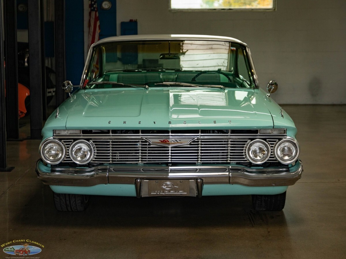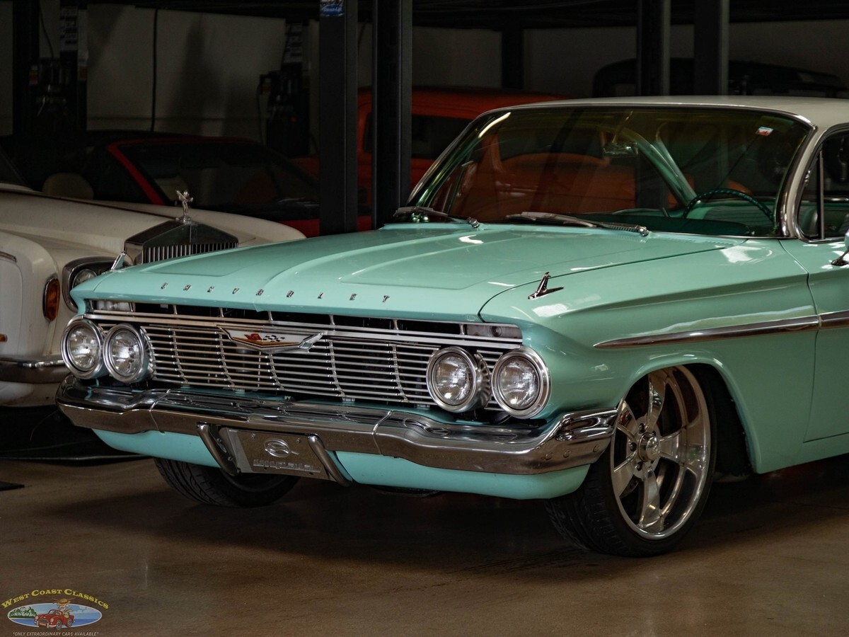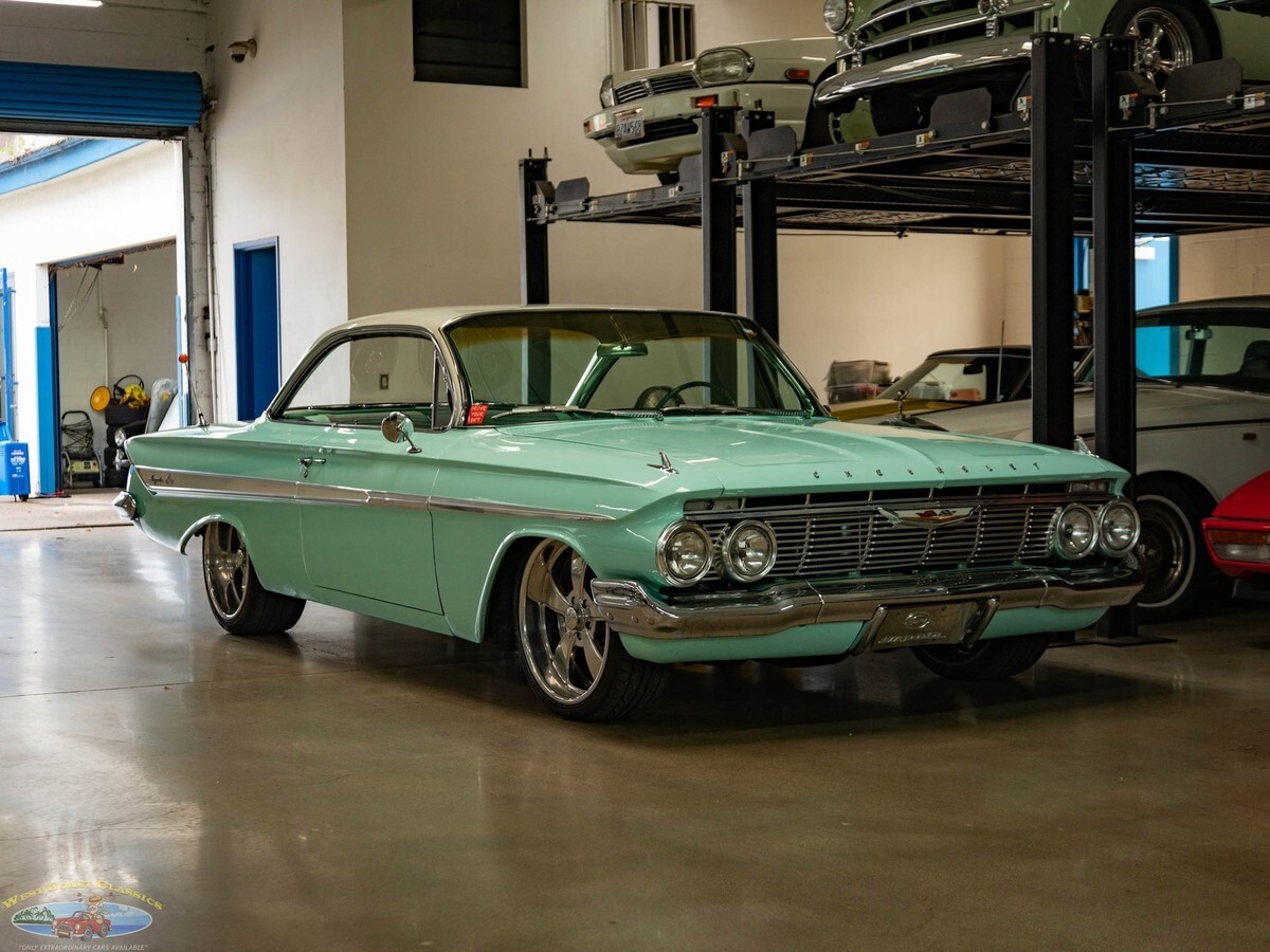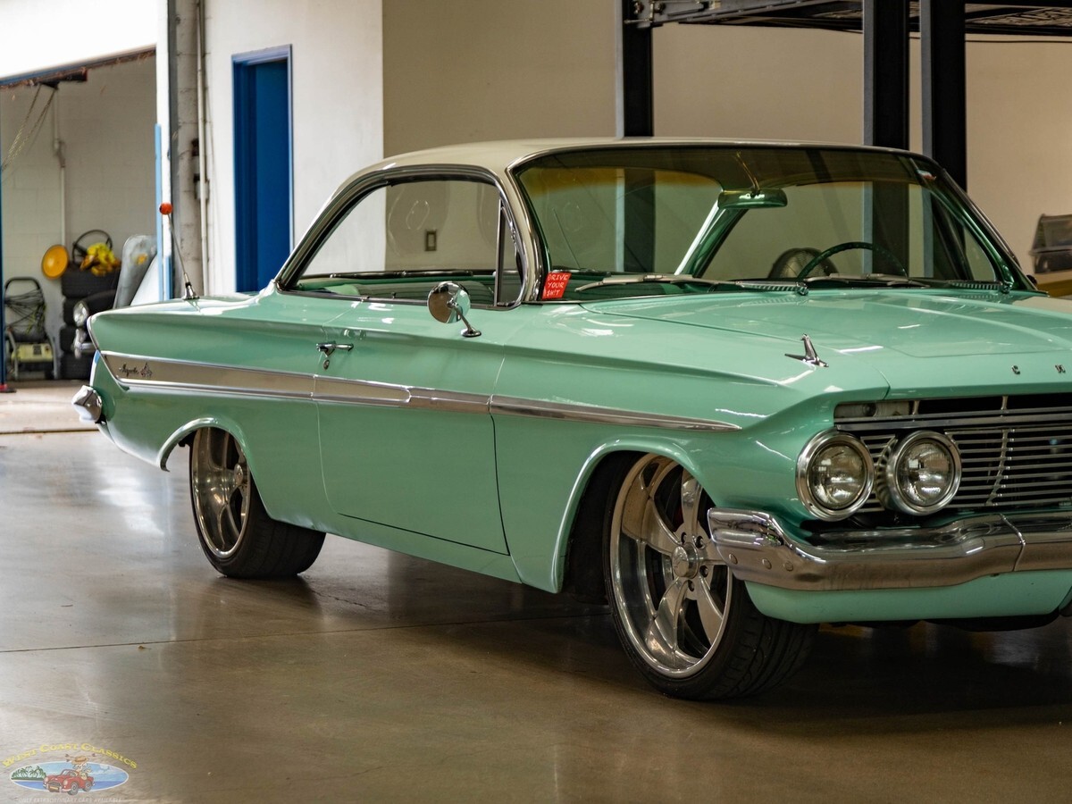 West Coast Classics presents are proud to present an exceptional example of this custom built 1961 Chevrolet Impala 2 door Coupe with a crate 350 V8 440HP V8 engine matched to a 700R4 4 speed automatic transmission with a shift kit & with 4 wheel disc brakes & striking chrome 'Foose' wheels. Please note we sold this car a few years back and since then the new owner installed a new digital dash cluster and a Holley Sniper Electronic Fuel Injection tank, A/C system with 2 custom A/C lines with R134, 700R4 Stage 2 rebuild kit with high energy W clutches, 10' Torque convertor 2600 stall, beast sun shell, electric window kit ($600), 2 way vents, coil over kit front & rear, ($21,192.49)Big brake kit front and rear ($1,995)Electronic modern upgrades:Installed Dakota Digital Instrumentation, dual antenas, seat belts, MDS EFI system, 'Champion' aluminum radiator & coolant fan & shroud, front & rear performance shocks, new EFI ready fuel tank with sending unit & pump, MSD digital box, MSD ready to run distributor & ignition, Edelbrock air cleaner. ($5,280)Sound System:Power Acoustic 1" tweeter, JBL 6.5 stadium 2 way speaker, JBL 6.9 stadium GTO 930, Sound Stream 1000.1, Nesa 2000.4 td-48, Pioneer 12 flat sw 1500 watts, 12" box 112 top port box, Blaupunk 4gage amp kit, alarm system ($1900). The car is finished in a stunning 'Solid Twilight Turquoise' over a 'White' hardtop color repaint with a new matching Turquoise stock looking interior and trim and the car already had a superb build with an all new drive shaft, U joints, belts, plugs, hoses, radiator, exhaust and with custom 'Stewart Warner' gauges before the upgrades were installed! The 1961 full-size Chevrolet model was totally revamped for the new year. As with all other full-size GM lines, the new cars finally finished with the knee-banger, wrap around windshields and tailfins and shed some of the length and width that had been popular in the prior three years. The front end sported a full width grille with dual headlamps mounted at each end with the turn signals and parking lamps mounted above the headlamps. The car boasted all the regular Bel Air equipment plus Nylon pattern cloth seats, electric clock, full carpeting and dual backup lights.The Impala was restyled on the existing GM B platform for 1961. The new body styling was more trim and boxy than the 1958-60 models. Sport Coupe models featured a 'bubbleback' roof line style for '61 and a unique model, the 2-door pillared sedan, was available for 1961 only. It was rarely ordered and a scarce collectible today. The rare Super Sport (SS) option debuted for 1961 and was retired in 1968. The 1962 model featured new 'C' pillar styling for all models except the 4-door hardtop 'Sport Sedan.' Sport Coupe models now featured the 'convertible roof' styling, shared with other GM 'B' full size hardtop coupes.This particular example is an obvious a fully customized car with no expense spared and yet still very stock looking and boasts a lot of its original equipment including the AM radio and with original floor boards and trunk and a very straight body. It has received a beautiful date correct 'Solid Twilight Turquoise' color repaint with an 'Ermine White' hardtop and has a matching interior trim and seats and rides on striking 'Foose' chrome wheels.We are including photos of the car both after the upgrades and before for your information.This car must be seen and driven to be fully appreciated - the engine is extremely strong and responsive, the transmission shifts smoothly through the gears and the engine temperature always remains cool. The car's re-paint is of a very high quality and in very fine shape and the car has very few flaws.In summary, this is a wonderful example of a very striking 1961 Chevrolet Impala 2 Door Hardtop coupe muscle car in turn-key ready daily driving and daily head-turning condition, most definitely one very collectible and attractive example of an early sixties full-size classic all American muscle car!