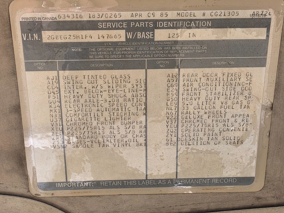 This is a 1985 G20 Conversion Van. I'm selling this van for a friend of mine. He has had it since 1990. He mainly used it for camping. The miles are actual. It has a new fuel pump and radiator. It has original paint with no rust. I drove it about 100 miles the other day with no problems. I do have the spare tire, the holder, and cover for it. I'm selling this with No Reserve. Please only bid if you're wanting to own it. If you have less than a 5 rating, you'll need to contact me to let me know that you're a serious buyer. If I don't hear from you, your bid will be retracted and you'll be blocked from bidding. Buyer is responsible for shipping. Please contact me with questions between 8am - 10pm CST. Larry 316-393-5275