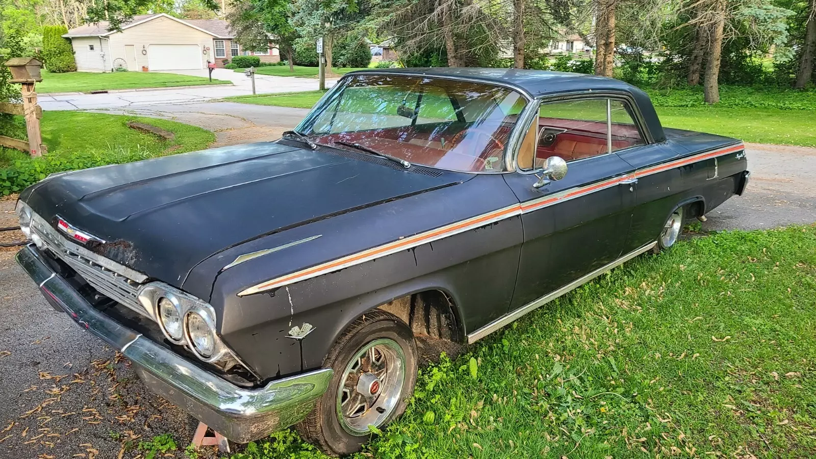 1962 2 door hardtop Impala. Factory original AC. It's a project car at the moment. It runs and rolls perfectly fine, but would need word to be on the road as its been about 10 years since the last time she was. I hate to see this car go - thought I would have it for life, but it's been 15 years of it not making it to the top of my project list, and it never will, so better to move on than rust away.Pictures tell most of it's condition, has rust in several places on the exterior and drivers floorboard. Otherwise solid car.Bit of it's story:Been in the family for 45 years. It was my Grandfathers car, then my Dad's, then became mine when I turned 16 and was my daily driver for many years, till it became a 2nd car, then a 3rd, and then eventually no driving and just sitting. Car was originally sold in OK to someone who lived in Texas. During some work I did in the trunk, I removed the original lining and found two receipts from the day the guy bought the car and drove it home. One for a AAA motel in TX that cost $6.18 for the night, and a gas receipt for 11.9 Gallons that cost $3.66. Not that any of that ads to the value, but they go with the car for it's story. Same for the Midas muffler install paperwork in the 1980's we did that has a "Lifetime Guarantee" that I've always wanted to try and test 40 years later.It went through a restoration in 1997 - body, paint, interior. Engine had about 93,000 miles on it and was fully rebuilt at a professional shop. The original 2-speed Turbo Glide was replaced with a Turbo350 (it was the original aluminum Turboglide, and unfortunately I never did pick it up from the shop all those years ago).Since the rebuild, the engine and transmission likely have less than 30,000 miles on them. For as long as she's been sitting, still starts and purs great, and with a tune-up and fresh fluids, runs 100% perfectly.Other obvious issues: Cracked windshield. Gas tank has rust in it, needs replacing. Running it right now with a rigged pony tank/gas can to move it around. Rear taillights have had a on and off ghost for decades, not working right now. . Two tires hold air, two do but not for long. The spare on the car right now came with the car when my Grandfather bought it in 1980, so it dates from the late 70's. The 4th matching rim for the 3 on the car is in the trunk. That is why the car is on jacks - just to keep the tiers off the ground till I inflate them again.Comes with all of it's trim pieces, interior, exterior, beauty rings and bezels, AC ducts and chrome vents. Also allot of extra other parts I've collected - both new and old, some in great shape, some OK.Any questions, please ask.