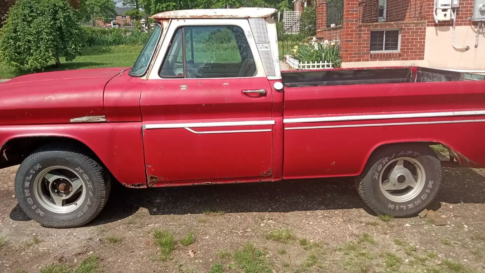 1966 C10 short bed .283 manual was a 3 on the tree. Someone put in a floor shifter cond unknown.Engine sounds good.windshield has a crack in it.selling as is cond.with clean MD title in my name.Truck not drivable driveshaft out.Body as seen.Has rust.Frame solid.Tires fair.New battery and master cylinder.Wont take much to make road worthy.Bid to win .No reserve.running off gas can.Tank needs cleaner.
