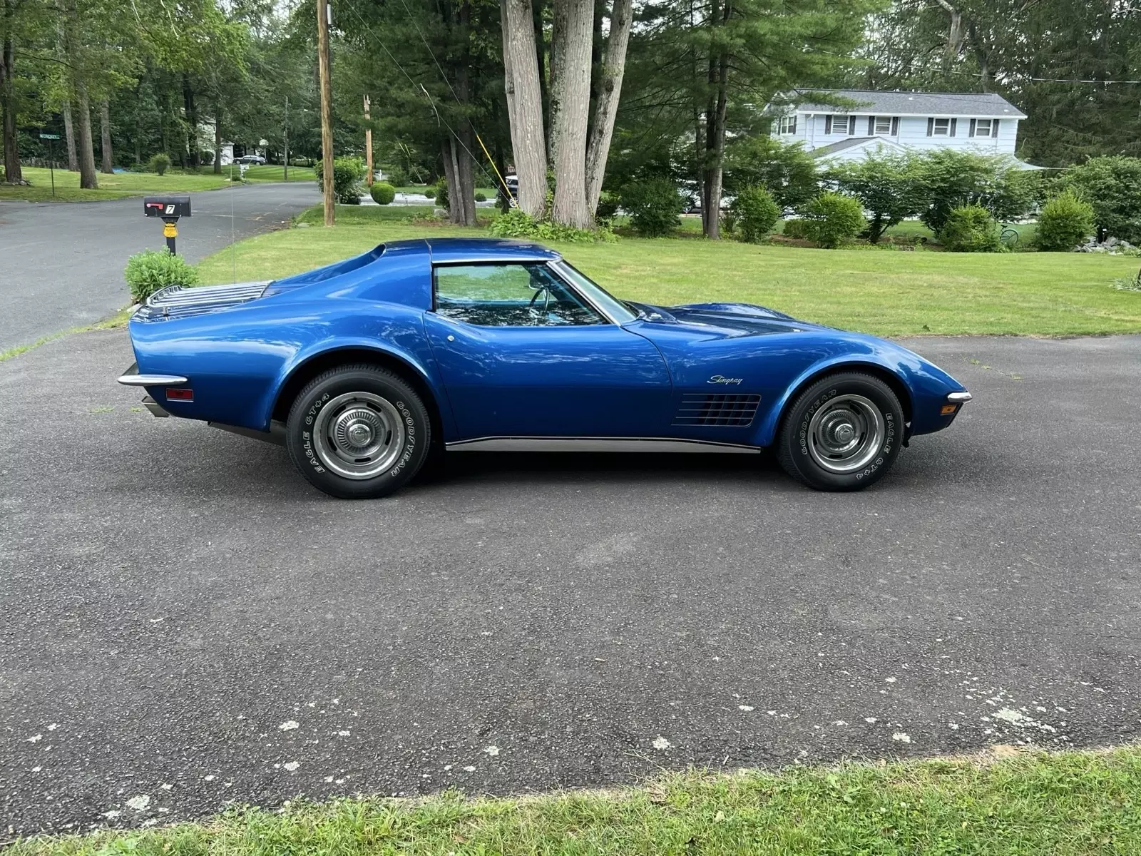 Beautiful Bridgehampton blue with bright blue vinyl interior. Power steering, power brakes, air conditioning ( yes it works), tilt telescoping steering column. Matching numbers. This car was purchased locally 11 years ago as a car for my clients wife. She loved the colors. But she could not drive a standard. This car was factory built as a 4-speed car. It was converted to an automatic with 400 turbo transmission doing all the factory changes needed to make the conversion. At that time the engine was completely rebuilt to its factory 300 hp specs. A rebuilt turbo 400 and stock converter installed, new radiator, carb rebuilt,new carpet, restored the steering column. Rebuilt pedal assembly. Replaced all the gauge lamp bulbs. Everything works as it should. Very clean solid car. Inspected well prior to choosing it for this project. The transmission, bellhousing, shifter, etc and associated parts go with car if desired. Its a solid no rot ever frame, the car was undercoated long ago. Has a new aluminized stock exhaust sytem from Corvette Central. The exhaust manifolds were machined flat at the head mating surfaces. The a/c system was serviced, it is still using R-12 refrigerant. It got all new SS sleeved O-ring seal style brake calipers and pads, park brakes work well, new booster and master cylinder. New power steering control valve, hoses, New Delco gas shocks. Has its original seat belts in excellent condition, original jack, storage bin, t-top straps and rear window storage tray. With the exception of a small crack in dash vinyl the entire interion including door panels are excellent. All the glass is excellent. It has the factory stereo radio option which was working when car was purcased, it currently is not working, turns on but no sound. The t-tops fit the car very well and the liners are excellent. Exterior paint is gorgeous as shown, all chrome and bright work very good. Does not appear to ever been in an accident, all body lines and panel gaps are good. Headlamps and wipers operate as they should. Tires are great. Engine compartment is clean and detailed. The driveshaft got new u-joints and was balanced with a new transmission yoke. The car sounds great, runs great, drives perfect. Car was aligned also. This couple restored/built this car to cruise and enjoy, with dependability. All this work was done in 2015. They have put a few thousand miles on it only. Used for local cruise nights and shows and has made the 300 mile round trip to the September Lake George show 3 times. Its time to let it go.