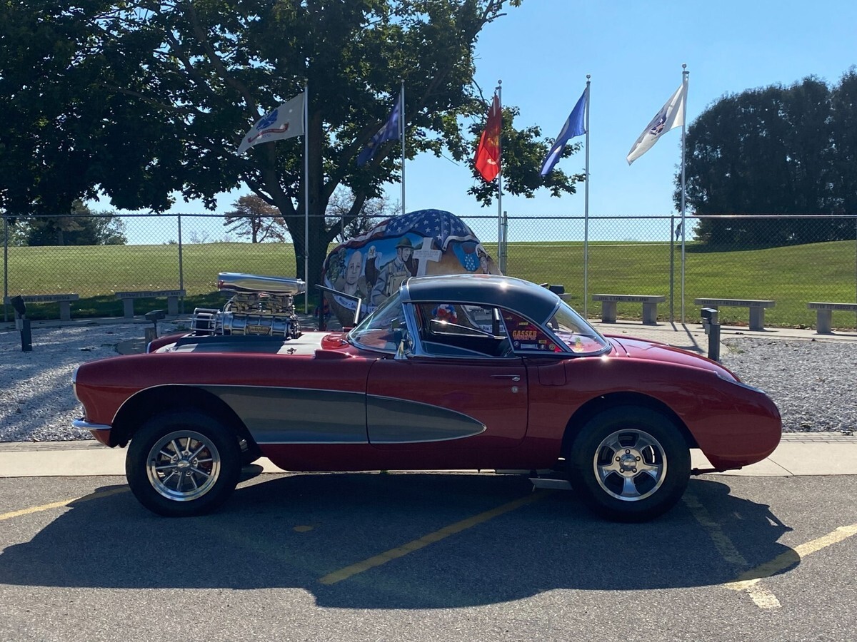 This is the 1957 Chevrolet Corvette that the Fired-Up Garage completed on the show back in April 2016. Since then, the Corvette has undergone some changes and is currently a “gasser”. This Corvette can easily be lowered back down by removing the 4” I beam spacers built for the front and switching the spring shackles in the rear. The car is powered by a Blown 355ci SBC with all the good stuff which we can go over… Dart heads, blower pistons, crank, Weiand 671 with polished 4” spacer and Holley Sniper feeding the engine with a Powerglide transmission and new driveshaft to the rearend. The car is finished in maroon with grey coves and hardtop. Exhaust headers can be very loud with a switch mounted on the dash or a nice quiet cruiser with the blower belt whine and the exhaust out the back. An aluminum radiator with an electric fan cools the engine, A B&M shifter controls the powerglide. 15″ Rocket wheels with Mickey Thompson narrow and wide tires, Front wheel disc brakes, drum brakes on rear. New 57 Corvette fuel tank.