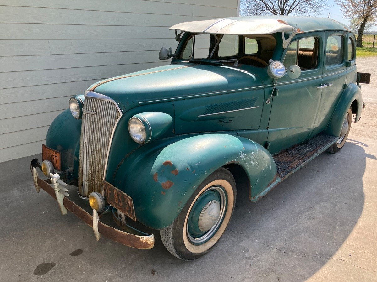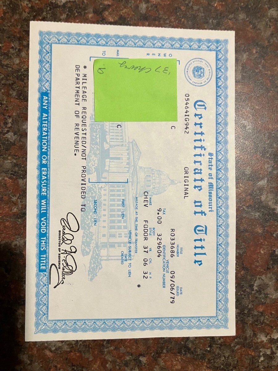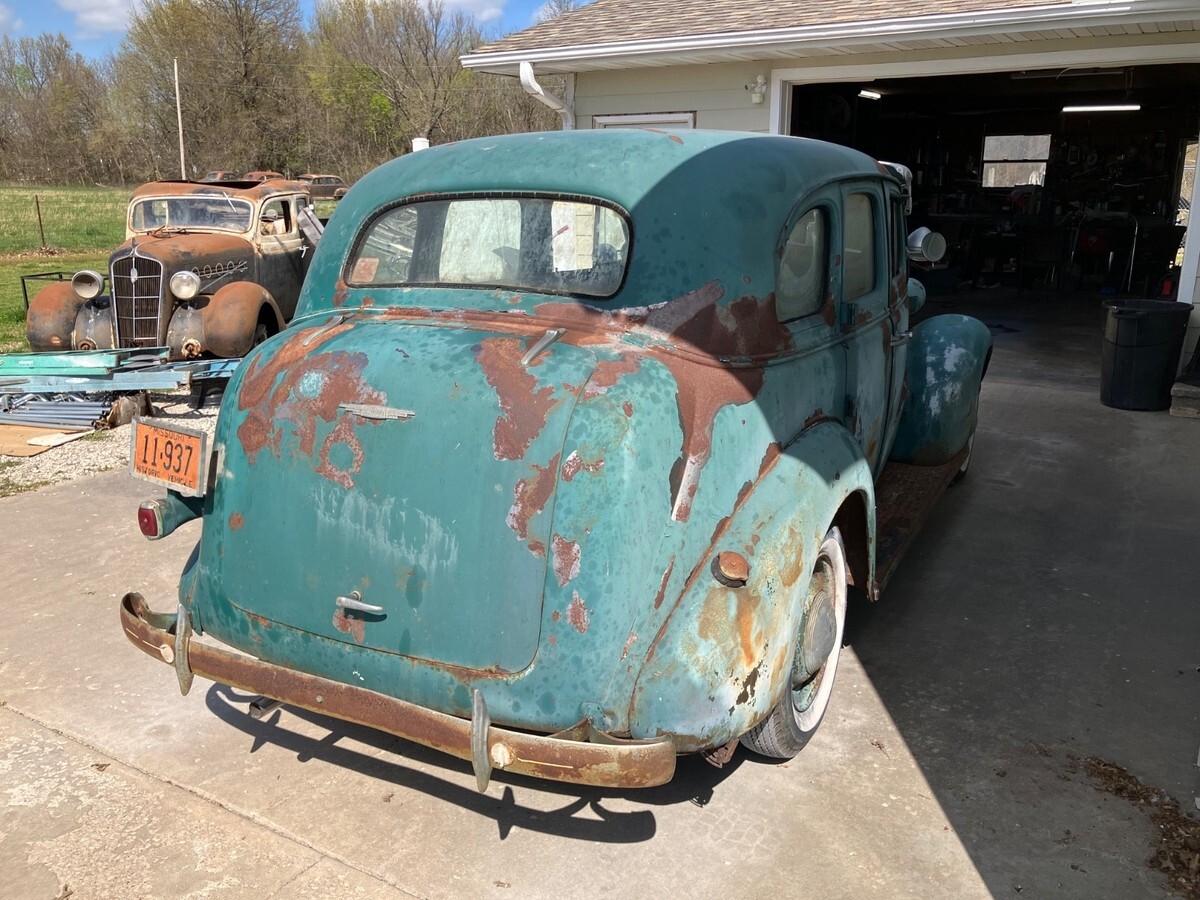 1937 suicide doors Chevy, 3 speed manual, interior is complete and in great condition, 216 original engine that runs great, this car was stored inside since 1979. I pulled it from storage replaced hoses and spark plugs and it started no problems, it is not the original color, was blue, now green and is peeling on one side, there is no rust in this car, just a little surface where paint is peeling, car was painted in California back in the seventies before being put in the collection then stored till a few months ago. I know drive it once a week or so. Put new radial tires on it and it runs great down the road.