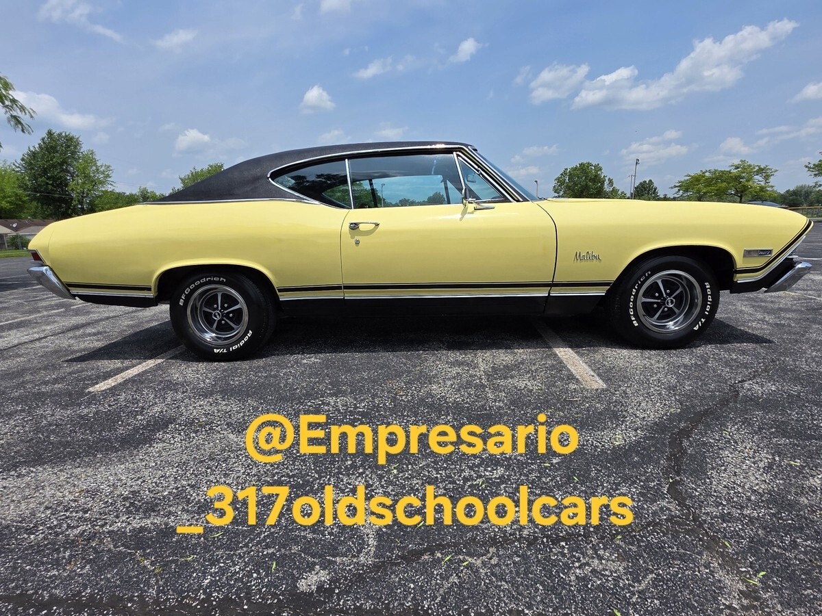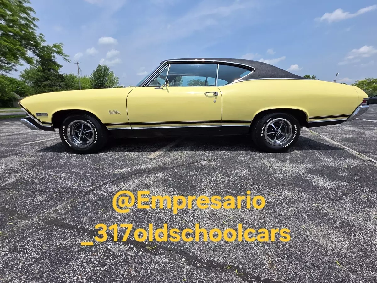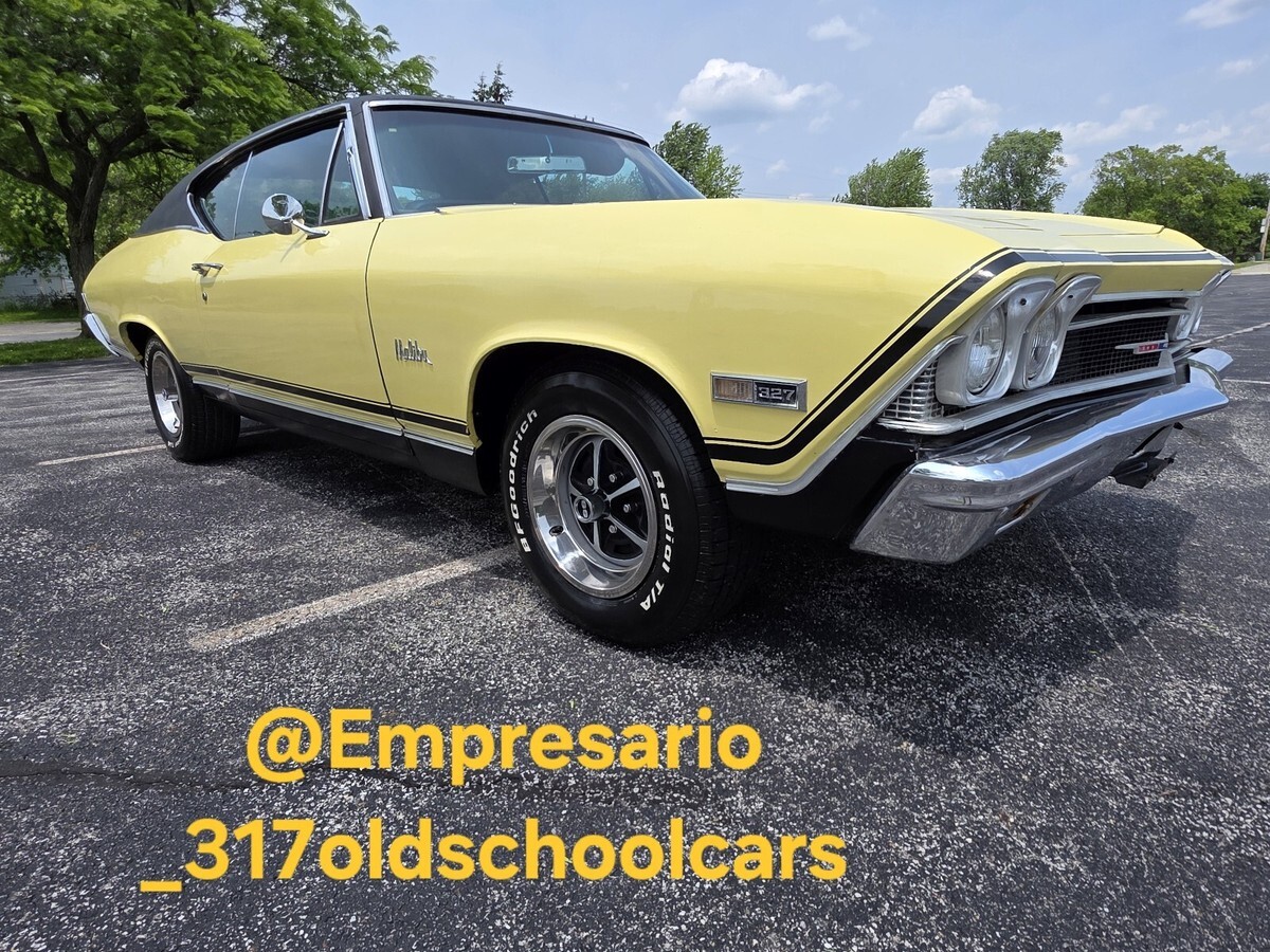 1968 Chevrolet Chevelle Malibu coupe. True California car. Hardtop Butternut Yellow with a black vinyl top. Number Matching 327 V8 engine with 275 horse, number matching transmission two speed power glide automatic. Rear end & all have been reconditioned a few years back. Have original paperwork including dealership bill of sale, protector plate & user's manaul when purchased from original dealership in California. All new interior with reciepts. Runs and drives good. New wheels and tires. New black vinyl top. Front end was rebuilt last spring, at that time the tires where balanced and then car was put on a four wheel laser alignment. Had new gauges installed last spring, oil, volts, temperature, all working condition. Turn signal, brakes, lights, etc. work. Newer dual exhaust two years ago. Clean body. Good paint. All new floor pans & trunk pan. Clean title. $30,000. No trades. Located in Indiana.