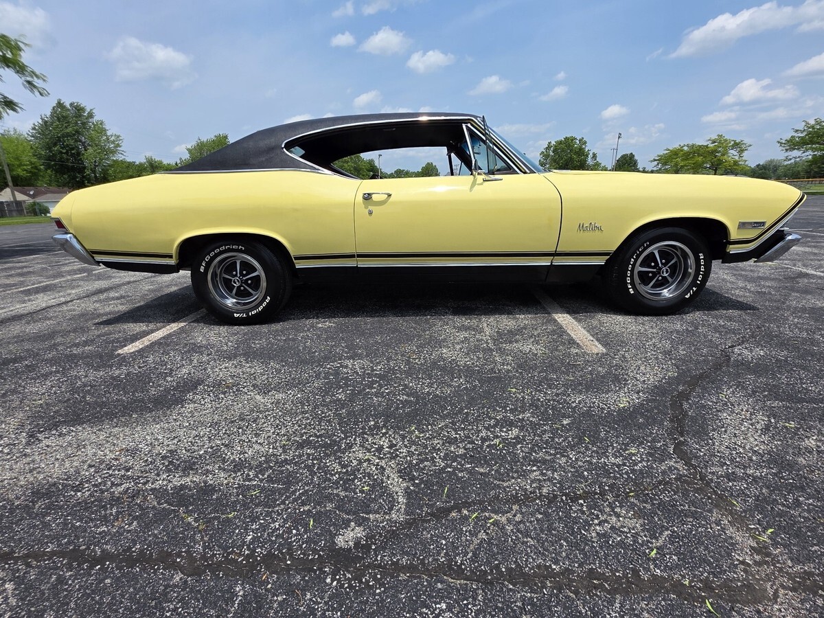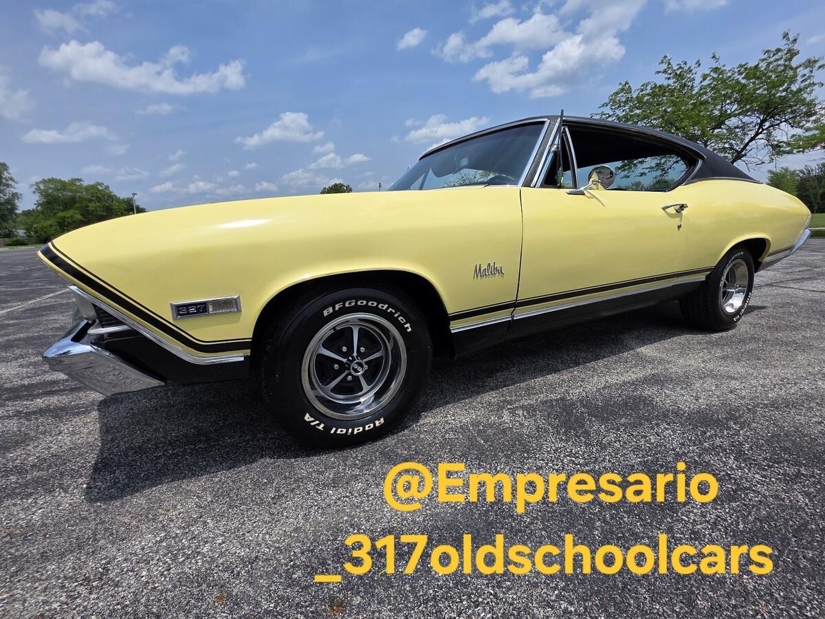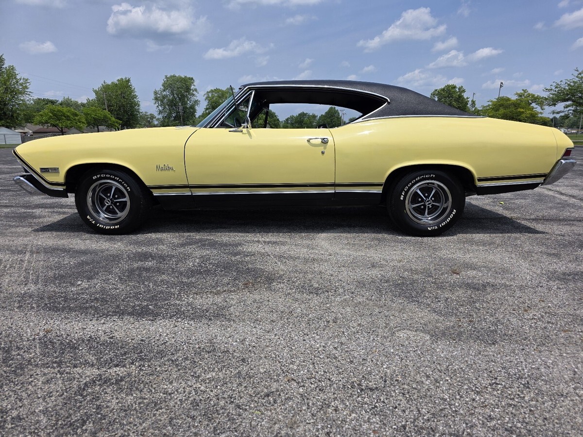 1968 Chevrolet Chevelle Malibu coupe. True California car. Hardtop Butternut Yellow with a black vinyl top. Number Matching 327 V8 engine with 275 horse, number matching transmission two speed power glide automatic. Rear end & all have been reconditioned a few years back. Have original paperwork including dealership bill of sale, protector plate & user's manaul when purchased from original dealership in California. All new interior with reciepts. Runs and drives good. New wheels and tires. New black vinyl top. Front end was rebuilt last spring, at that time the tires where balanced and then car was put on a four wheel laser alignment. Had new gauges installed last spring, oil, volts, temperature, all working condition. Turn signal, brakes, lights, etc. work. Newer dual exhaust two years ago. Clean body. Good paint. All new floor pans & trunk pan. Clean title. $30,000. No trades. Located in Indiana.