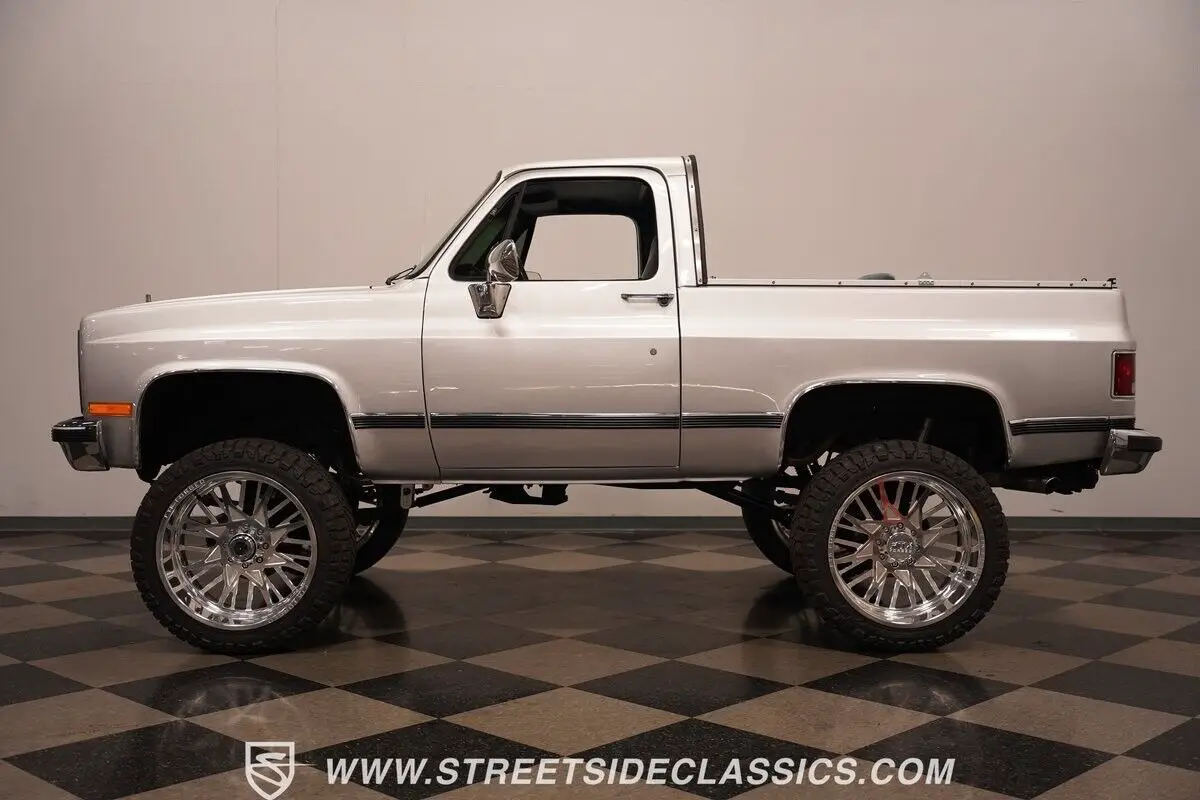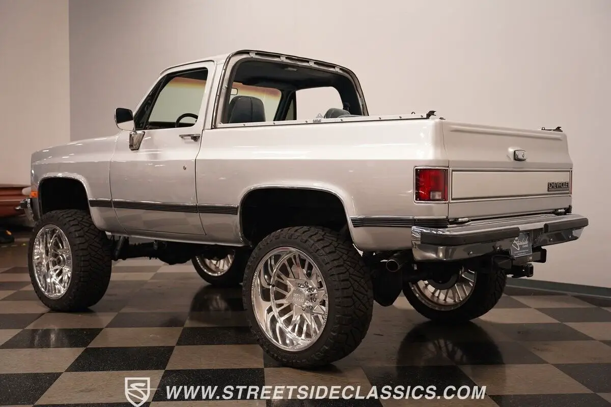 With its robust stance and gleaming silver finish, this 1989 Chevrolet Blazer K5 4x4 captures the spirit of adventure that defined the era. The vehicle flaunts a full repaint in a striking Silver base, contrasting beautifully against the rugged outlines of its design. The large 24-inch chrome wheels, wrapped in LT315/45R24 tires, complement its commanding presence, further highlighted by updated Bilstein shocks and a lifted suspension that beckons a look from every bystander. Notably, this model also celebrates the debut year for an updated grille that links its aesthetic with contemporary Chevrolet trucks, enhancing its appeal with a distinctive front-end look.