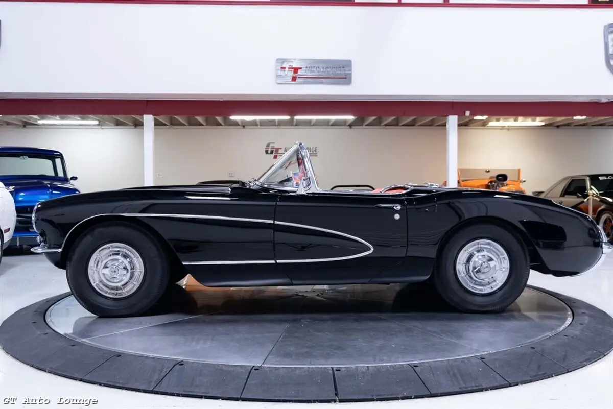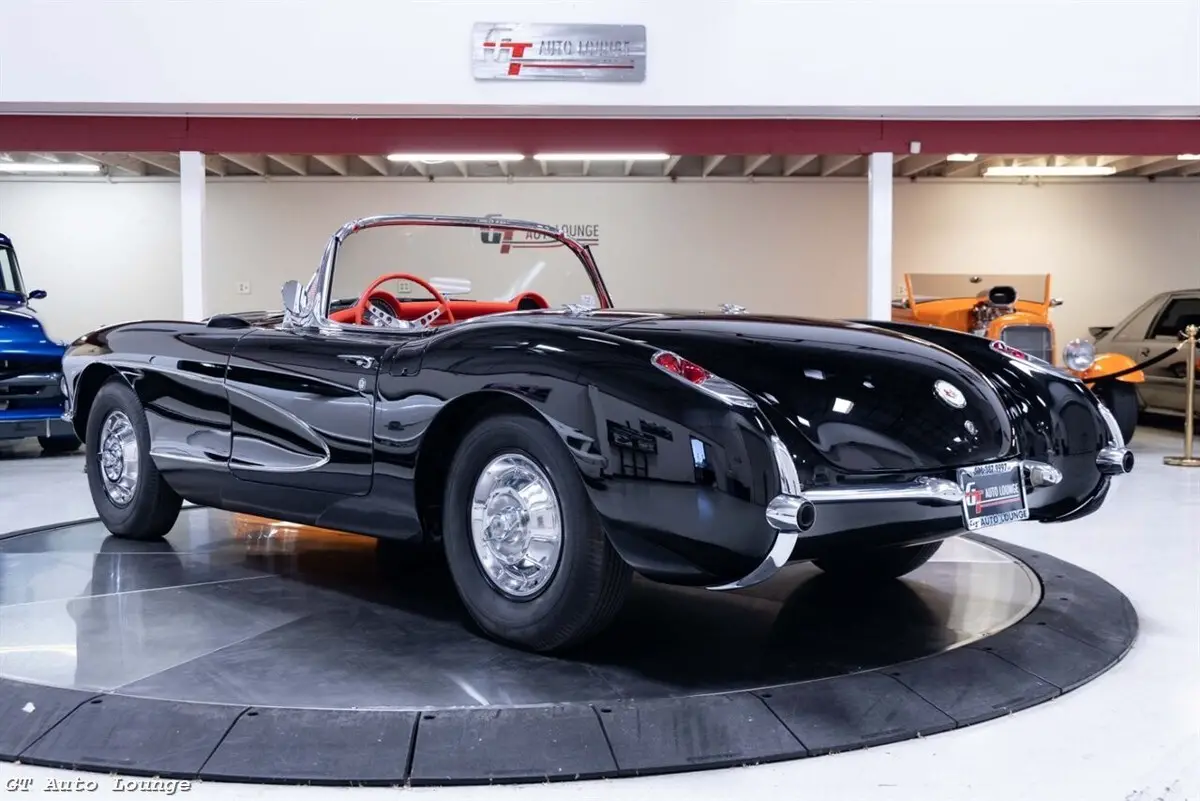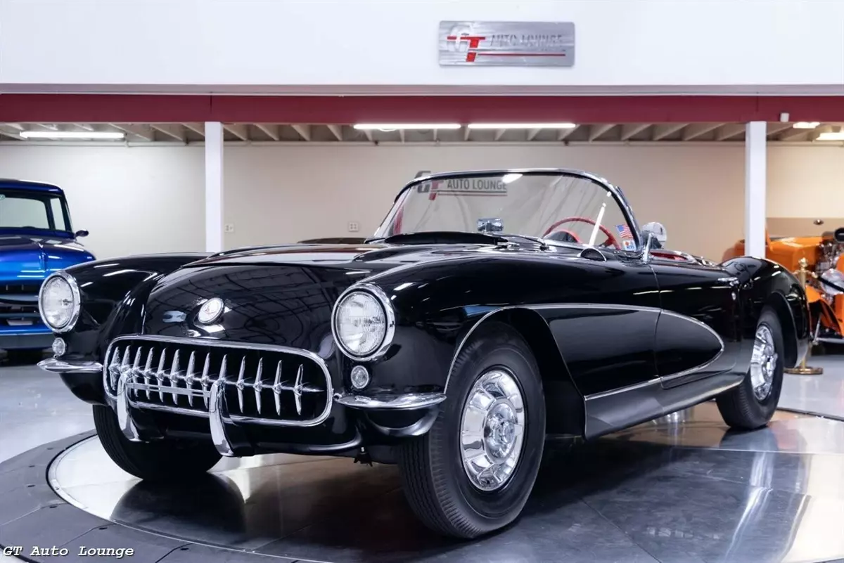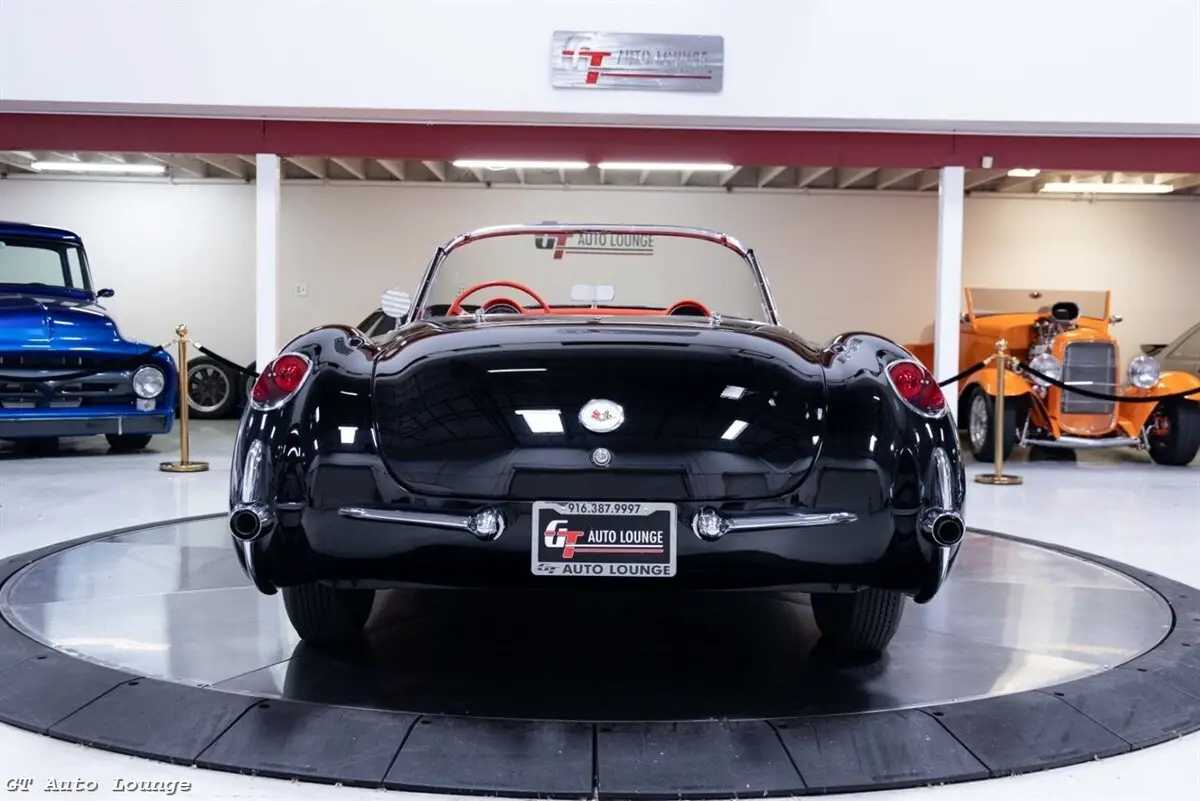 1956 Chevrolet Corvette Roadster in Onyx Black over Red interior. Equipped with it's original 265ci 240hp V8 mated to a 4 Speed Manual Transmission and is one of only 111 equipped with a factory high lift camshaft. This stunning Corvette has has received an NCRS-Duntov Mark of Excellence Award, NCRS Performance Verification Award, and Bloomington Gold Certification, as well as multiple NCRS Top Flight Awards. Features include: Body Colored Removable Hardtop, Black Soft Top, Interior Chrome Trim, Waffle Patterned Seat Inserts, Dash Mounted Rear View Mirror and more! Sale includes awards documentation and service manuals. This Corvette is ready to be shown or driven! For more information please call 916-387-9997.