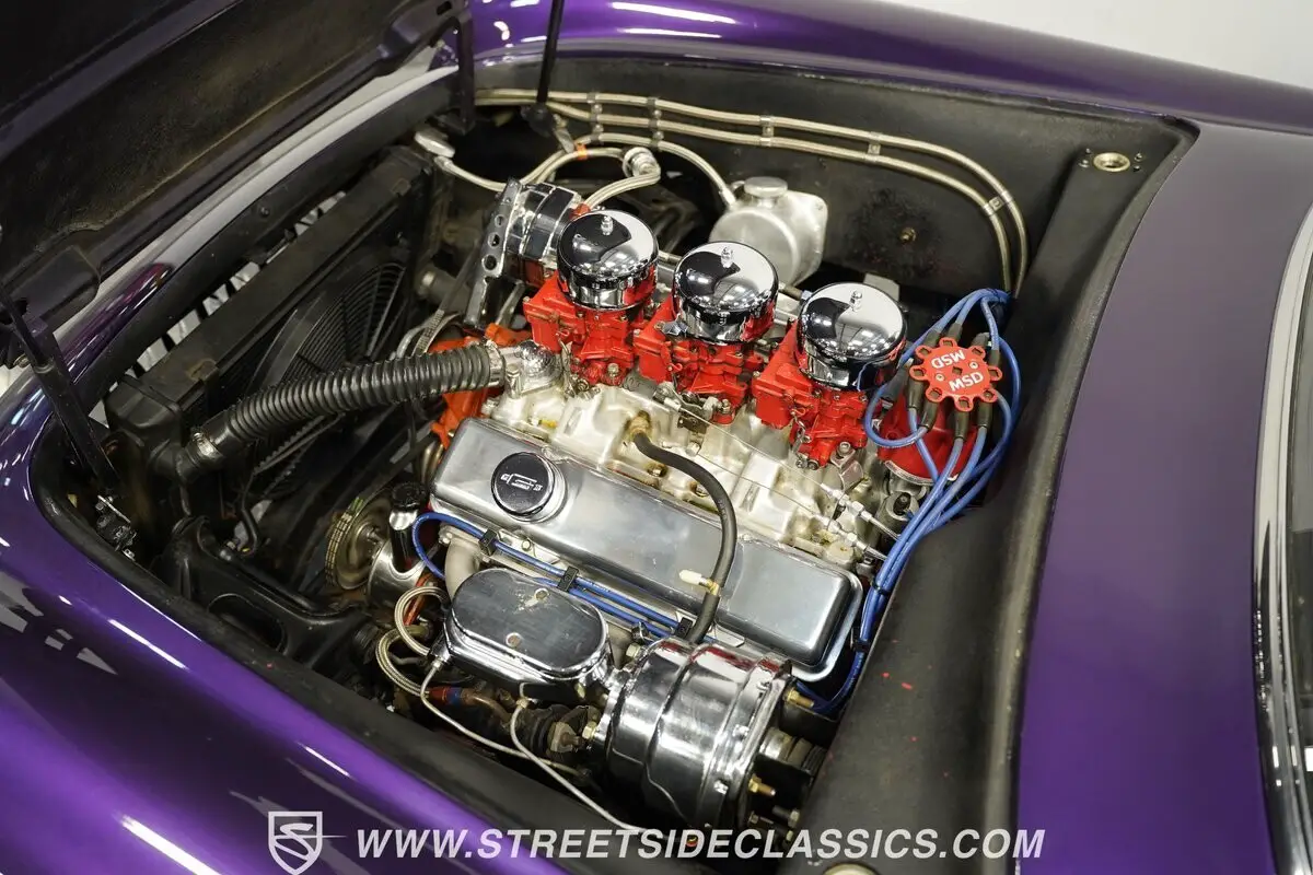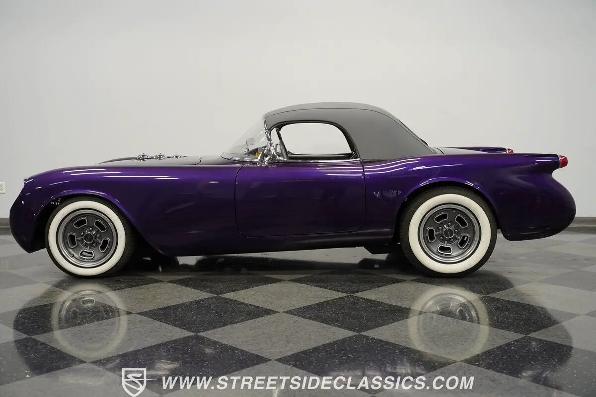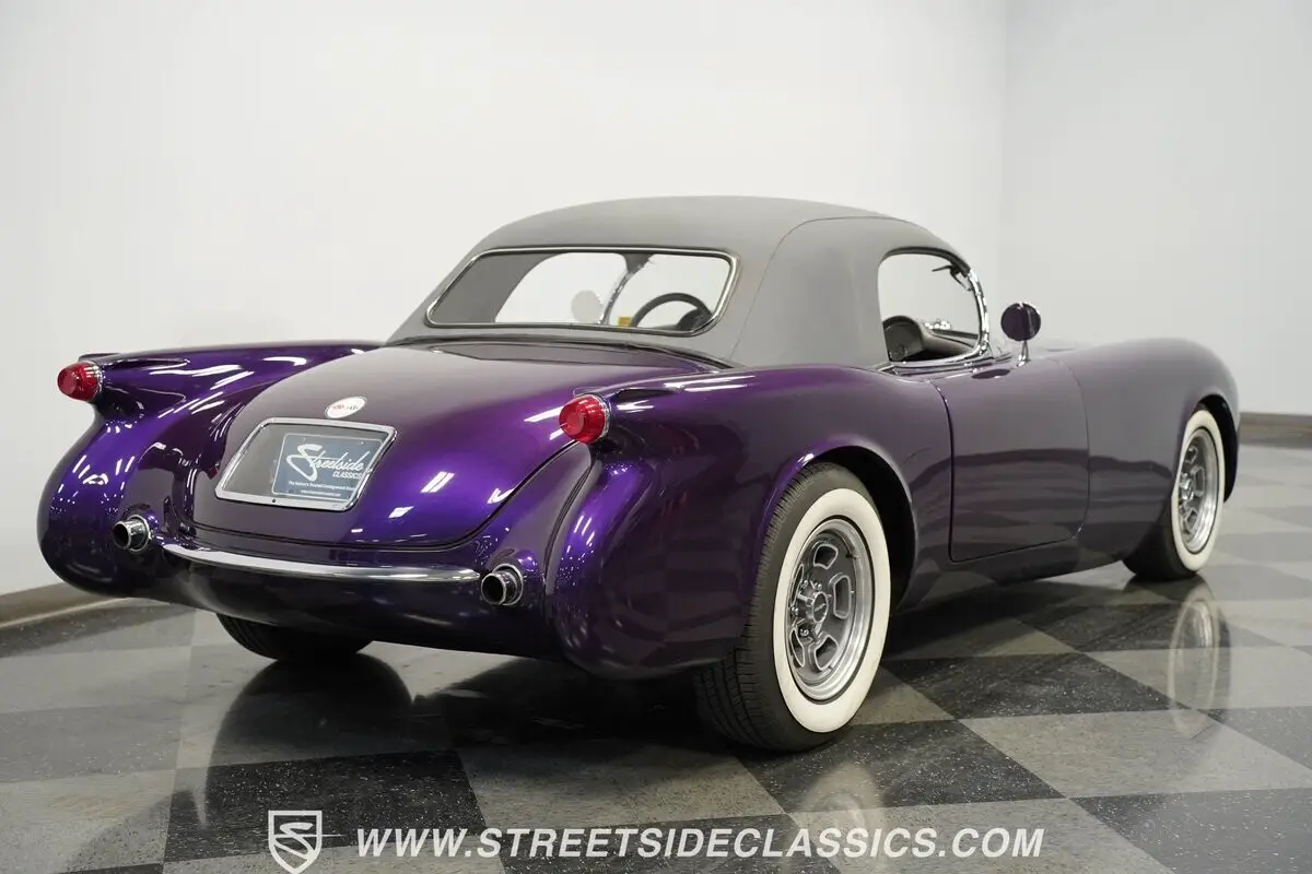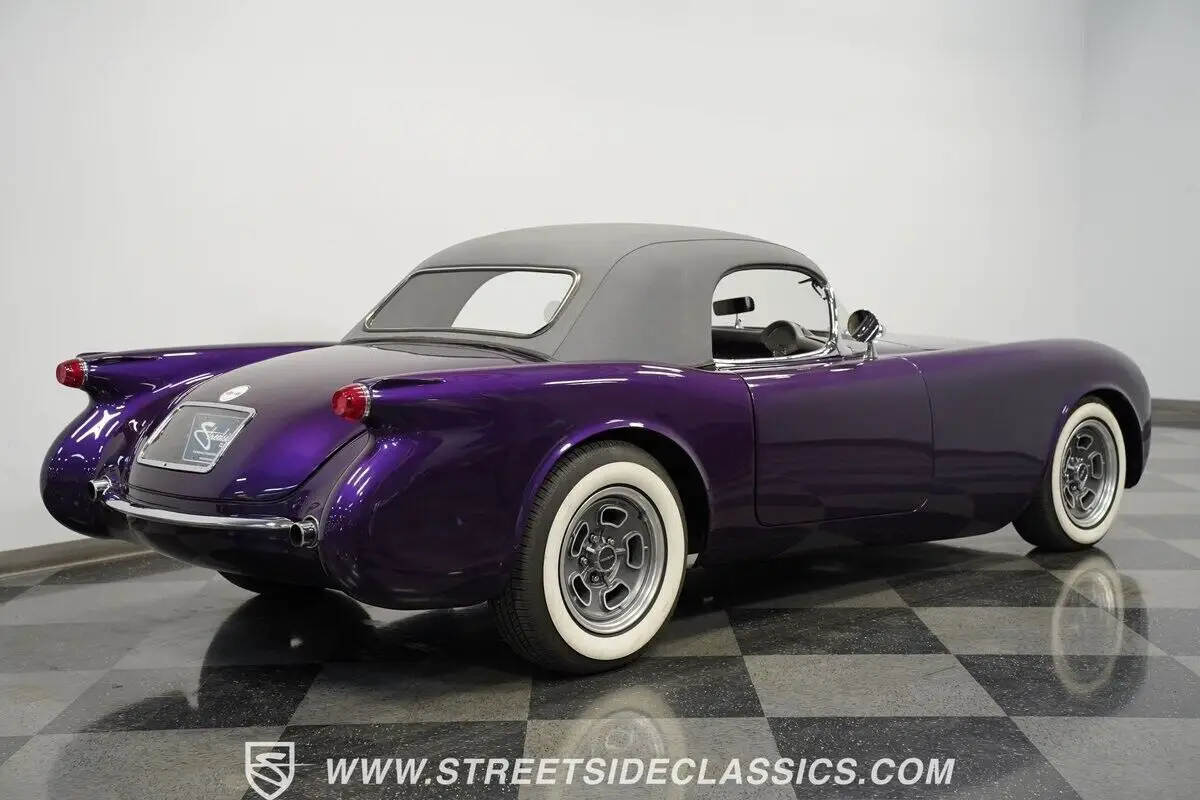 American sports car legacy comes alive in this 1953 Chevrolet Corvette Replica finished in vibrant purple. The fiberglass body captures the flowing lines and elegant proportions that made the original Corvette legendary. Vision aluminum wheels wrapped in 215/70R15 tires with wide white rings provide both classic style and modern performance. Chrome dual mirrors and distinctive eyelids over the headlights create perfect contrast against the purple paintwork. The custom hood with flame cutouts reveals the triple carb setup, giving this roadster a unique personality while maintaining those iconic Corvette design cues that have fascinated enthusiasts for generations.
